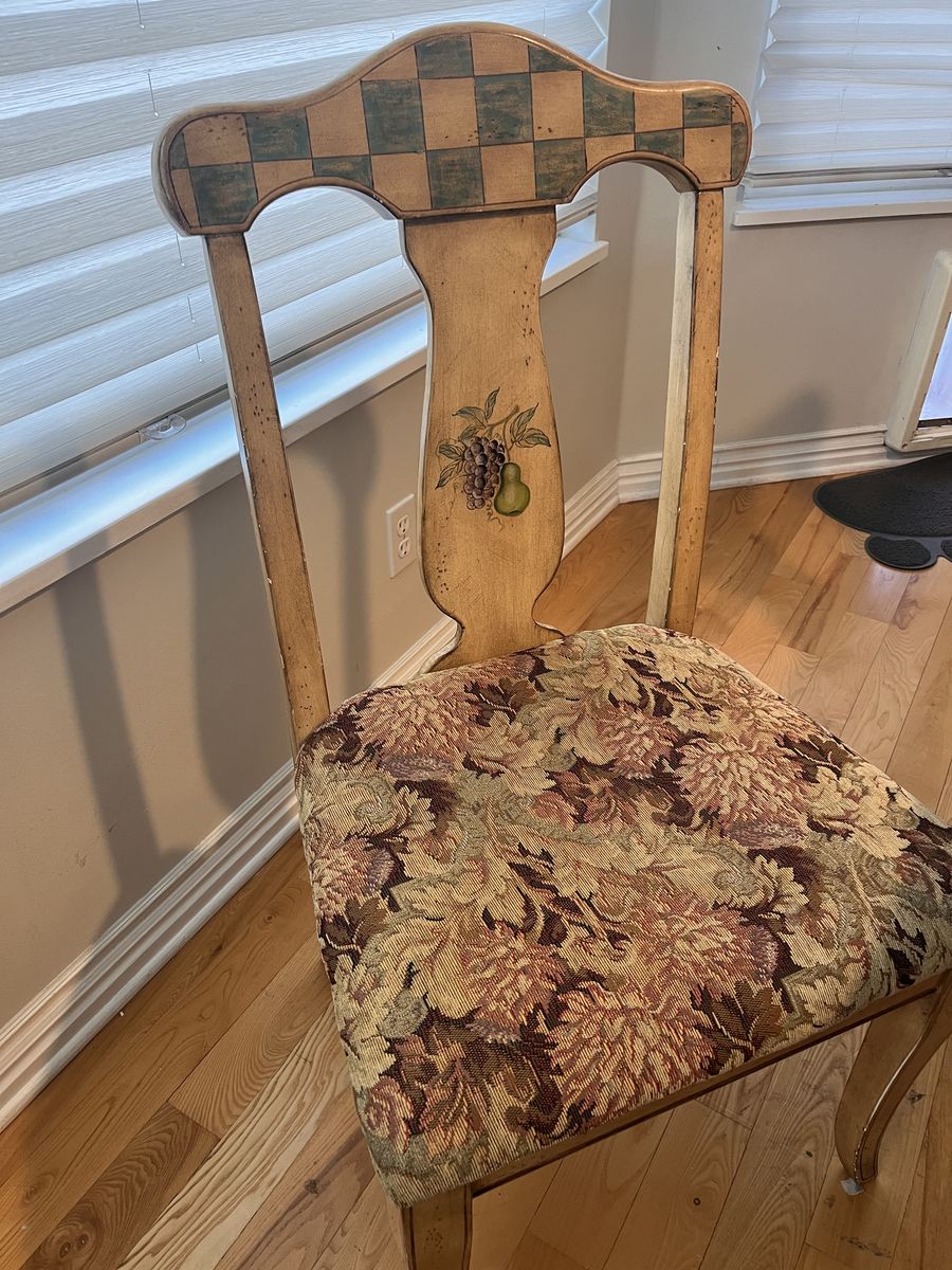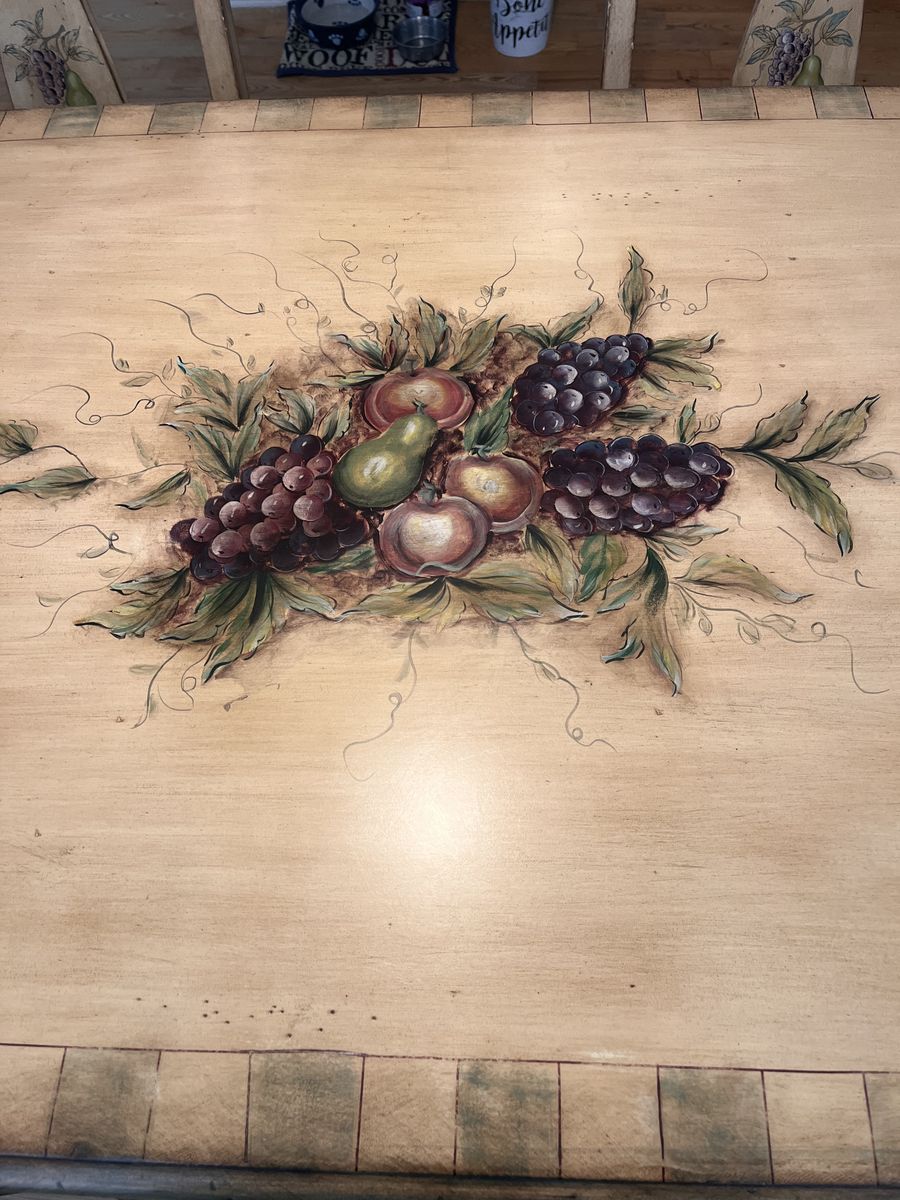 Venmo“Pulaski” cottage style table 3’ x 6’ 30” H golden light tan color with cluster of grapes motif Table top is in excellent condition. I have kept a glass panel on it , legs show minimal wear Comfortable chairs (18”D x 20”W)are in good condition with average wear for the age of the set. Original pads were white, have been recovered once with the tapestry. green fabric is available if interested .