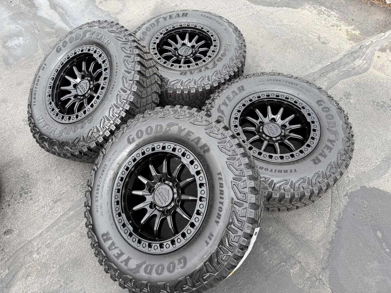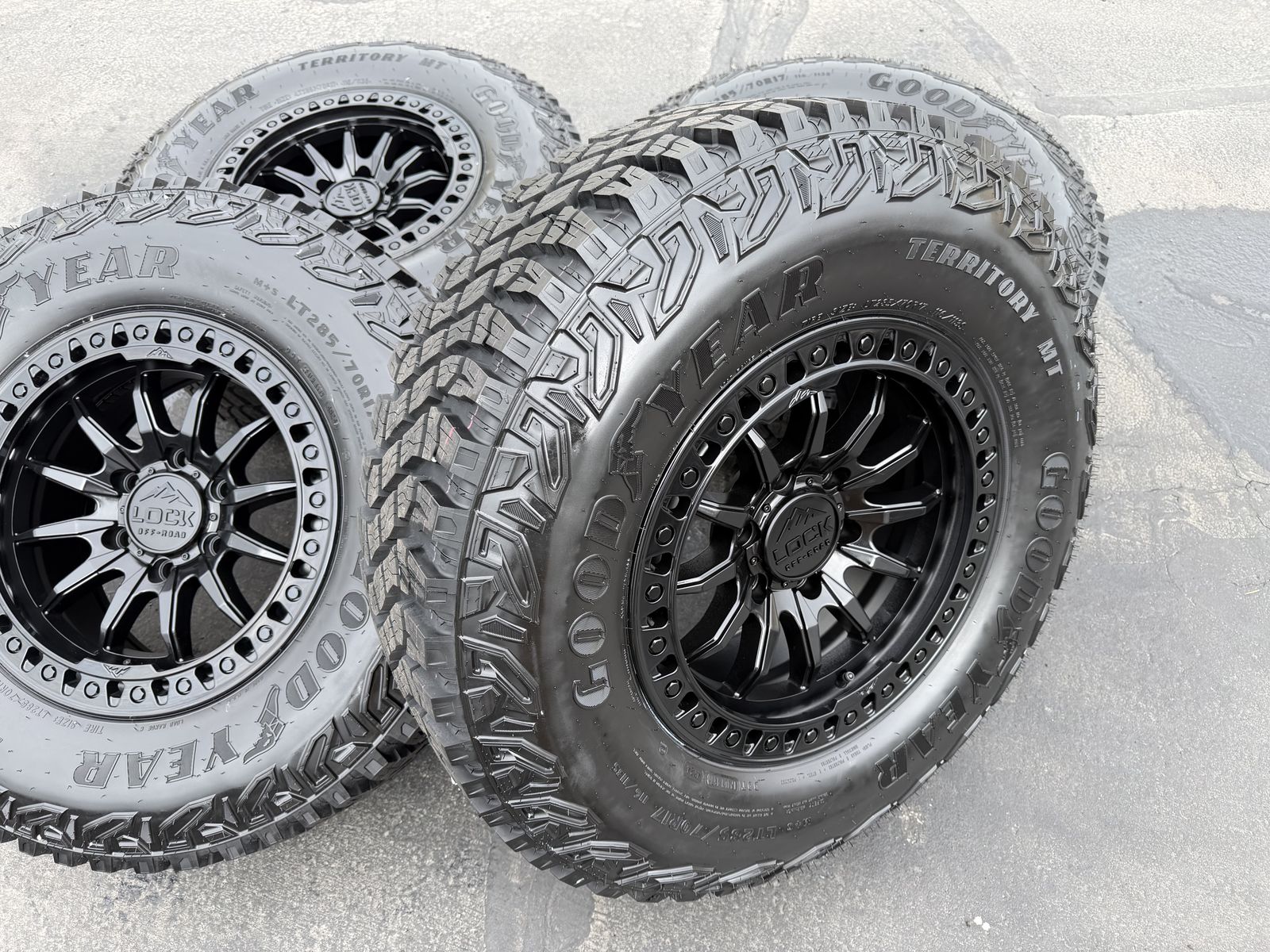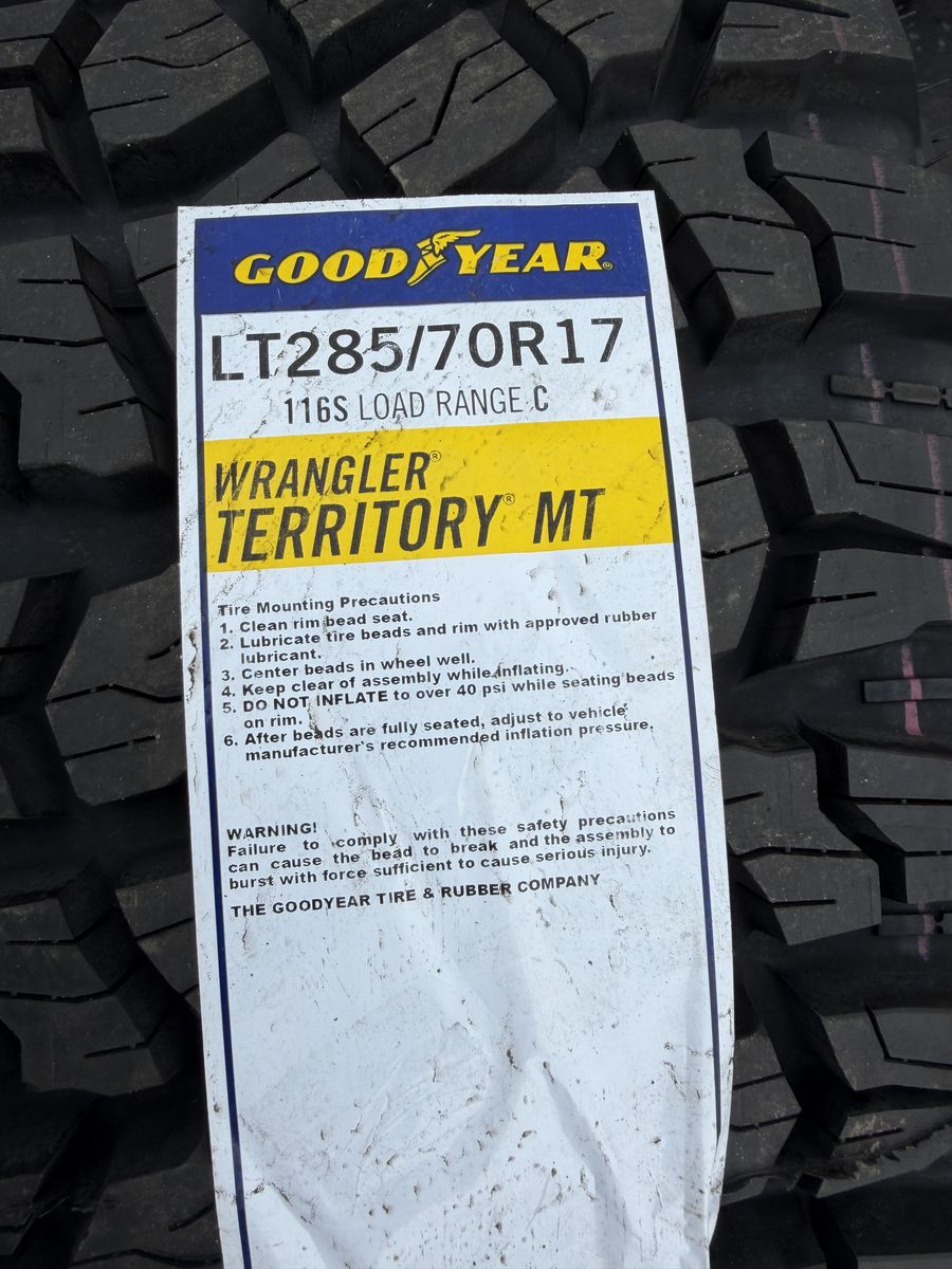 Tires are Goodyear Wrangler Territory M/T 285/70R17 which is roughly 33x11x17 load range C