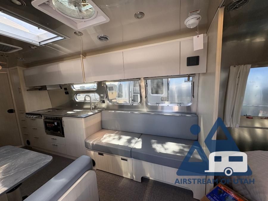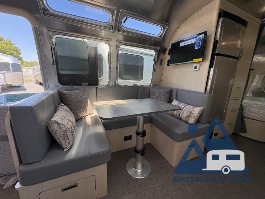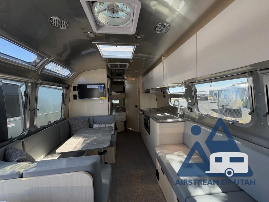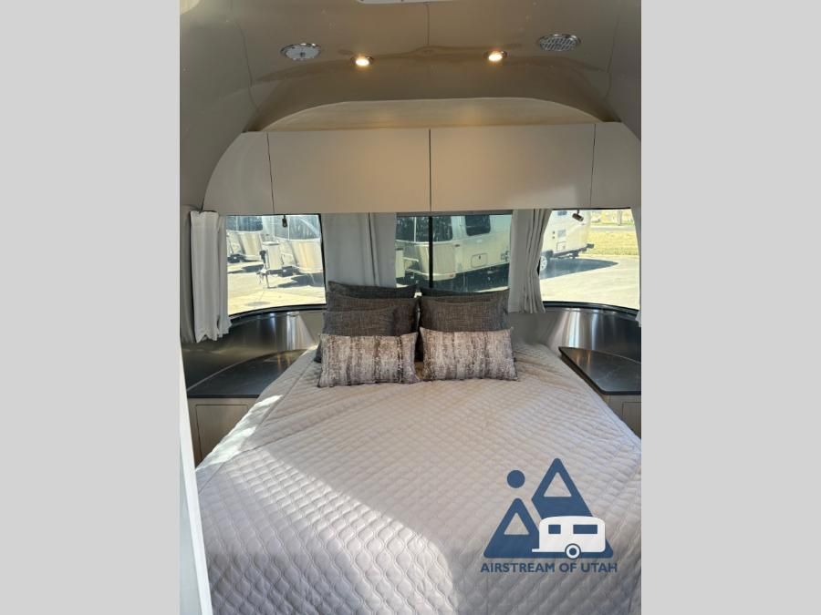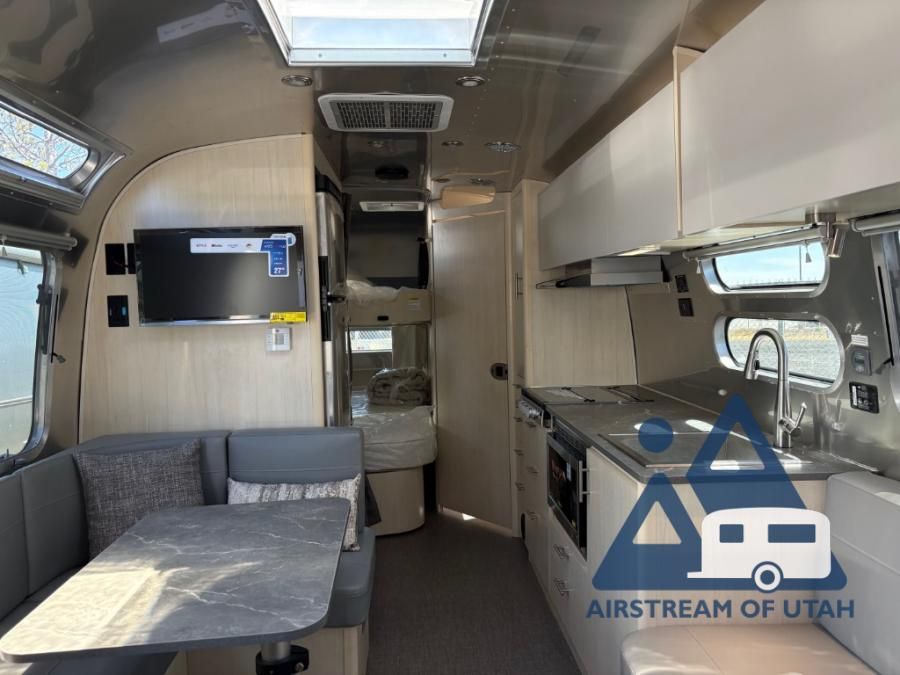 Looking for maximum interior space, a place for eight to sleep at night, plus plenty of storage for your big group? This trailer offers all of that plus so much more! The front private bedroom offers a queen bed with storage on each side to keep your clothing wrinkle free. The main living and kitchen area offers a U-shaped dinette for total comfort when dining, playing games and visiting with everyone. And the sofa offers more relaxation seating, while both furnishings provide extra sleeping space. The rear corner bunks offer a twin above a queen mattress that are designed to fit the curves of the Airstream perfectly. The full bathroom will keep you refreshed, and the kitchen is loaded with everything you need to feed the group. This model is also available with optional twin beds which replace the front queen bed!