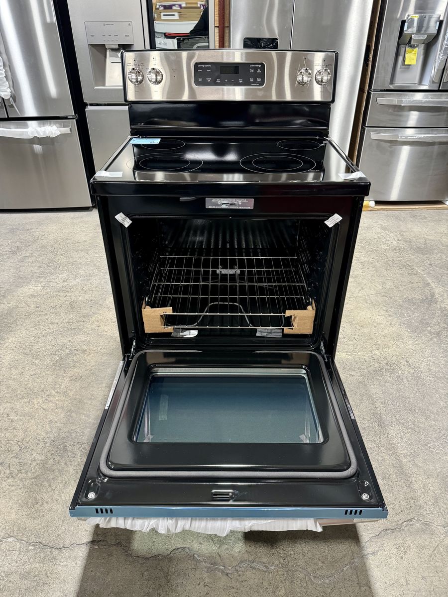 GE 30 Inch Freestanding Electric Range with 4 Element Burners, 5.3 Cu. Ft. Oven Capacity, Removable Storage Drawer, Self-Clean, Ceramic Glass Cooktop, Dual-Element Bake, Power Boil Elements, and UL Listed: Stainless Steel# J1115