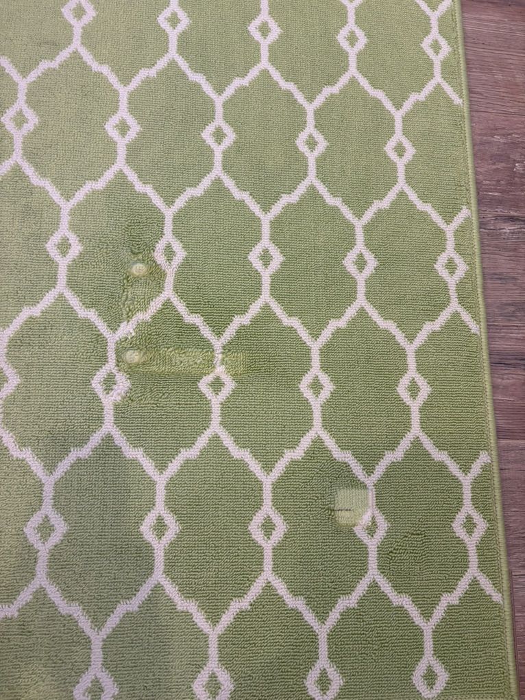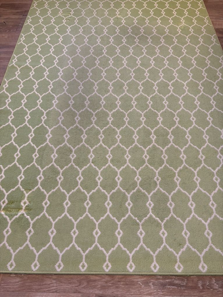 Fun green indoor/ outdoor carpet. 9’ 6” by 6’ 6”Has only been used indoors. Smoke/pet free home. So easy to clean. Has two places where couch has made indentations as shown in pics. Please message with questions. Cash/pickup only. Thank you