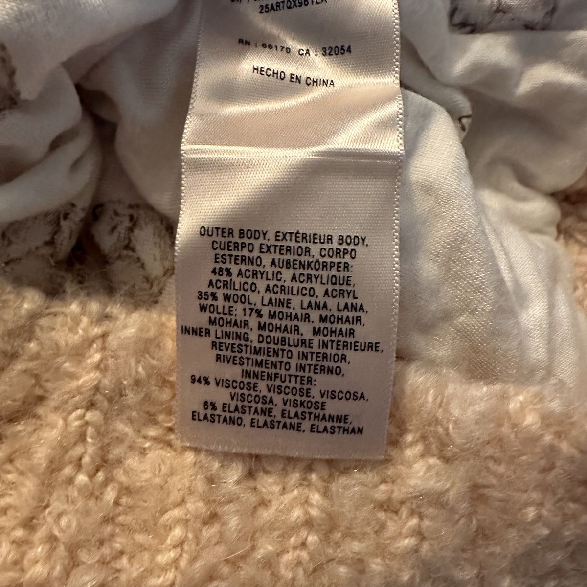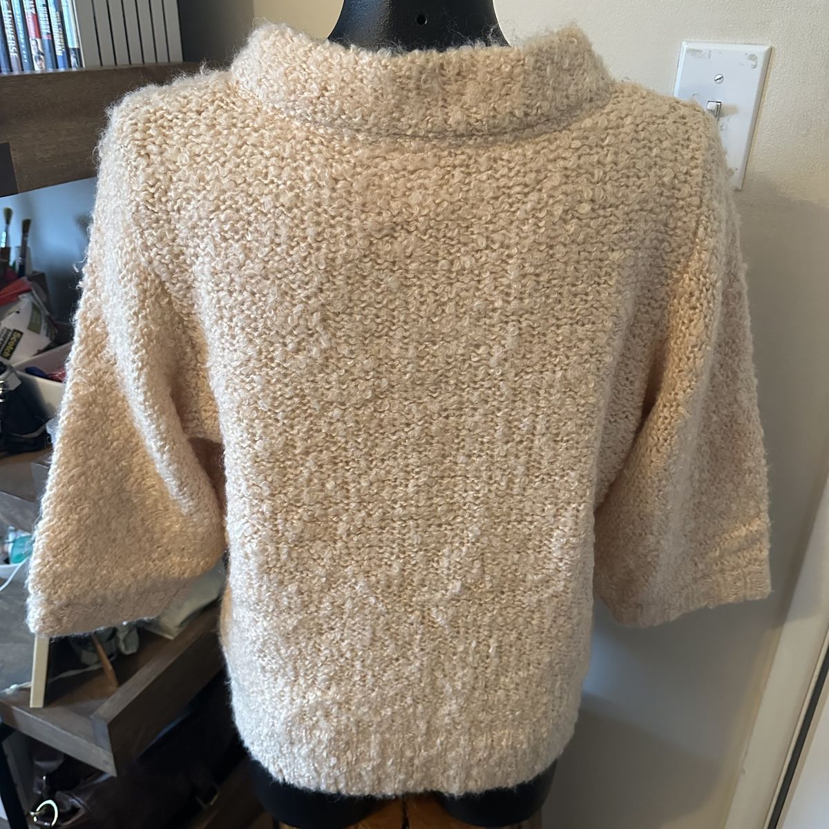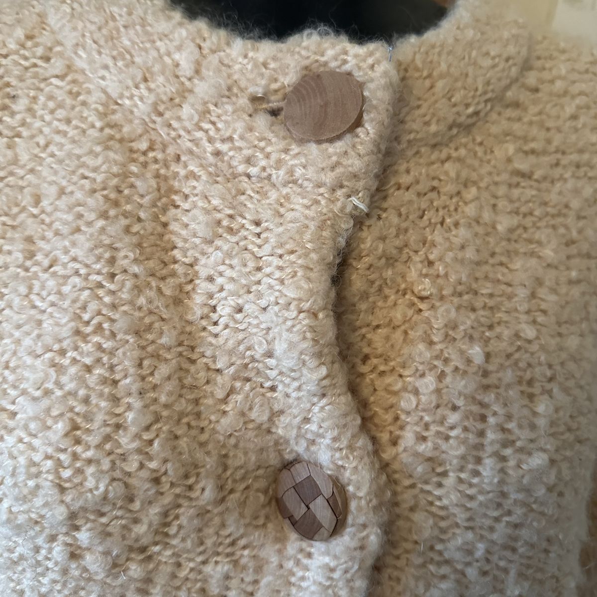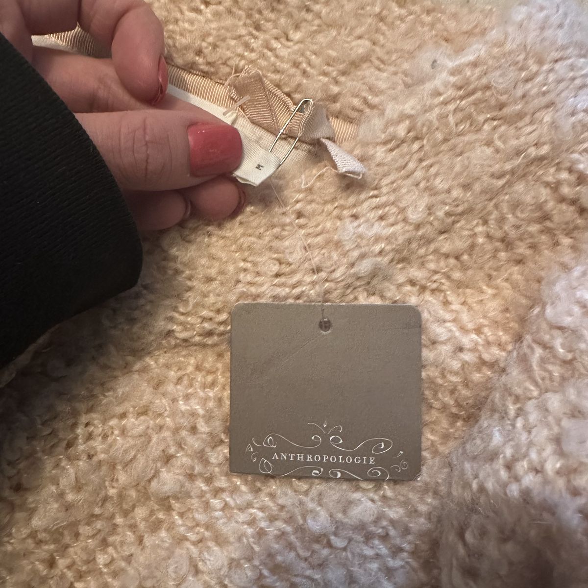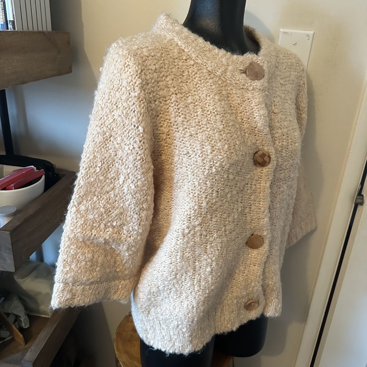 VenmoBeige knit cardigan sweater from Anthropologie with a four wood button closure Elbow length sleeves Materials: acrylic, wool, viscose, elastane Brand new with tags Only flaw is that the size tag is pinned to the collar, as shown in last photo. This can be an easy sewing fix though.