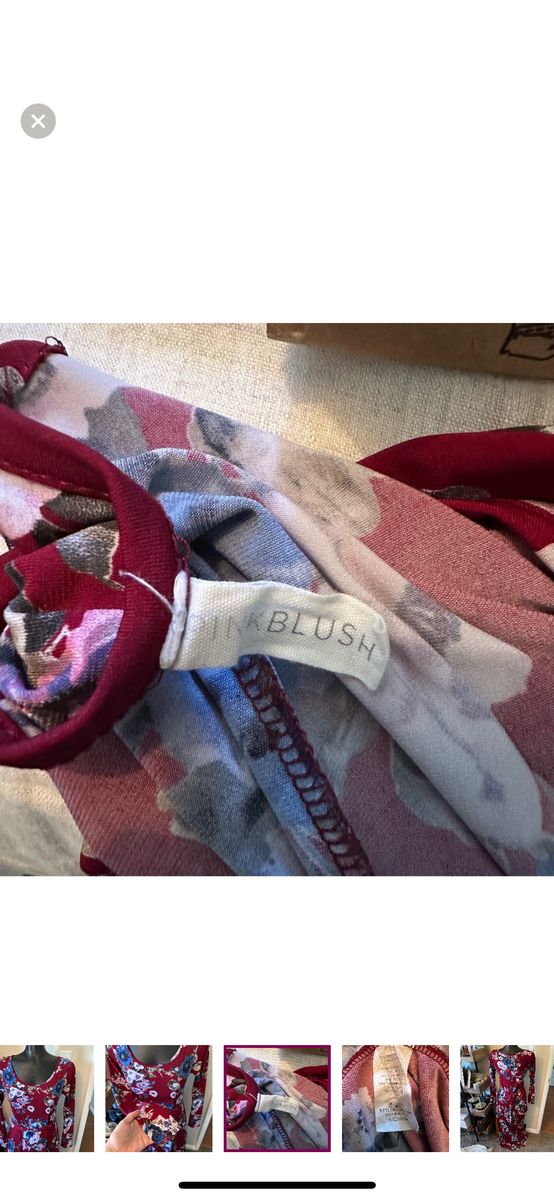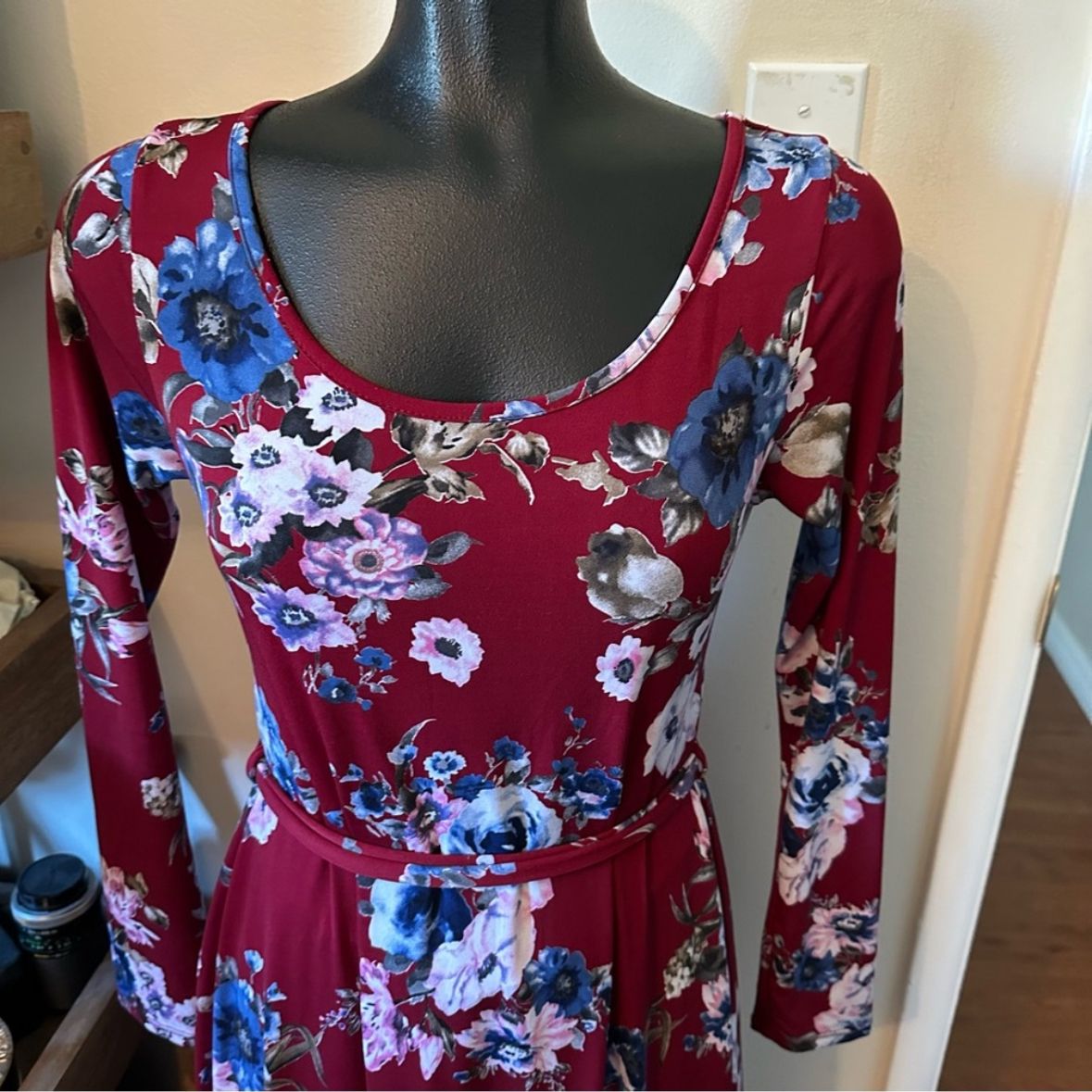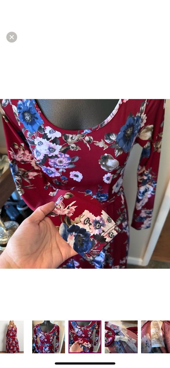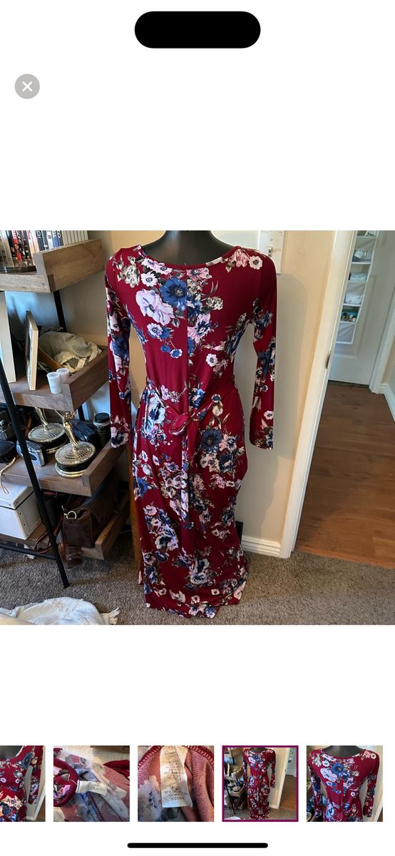 VenmoGorgeous blue and white floral patterned burgundy red dress Size small (maternity) Long sleeved and maxi length dress Stretchy material Adjustable tie waist to accentuate a growing bump Excellent condition Would be perfect for maternity photos!