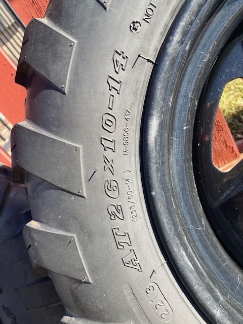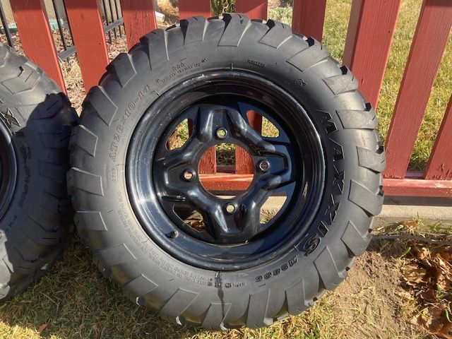 Maxxis 26x8x14 and 26x10x14 fronts and rears. Tires have about 500 miles on them. Lots of miles left. No holes, pathces, or plugs.