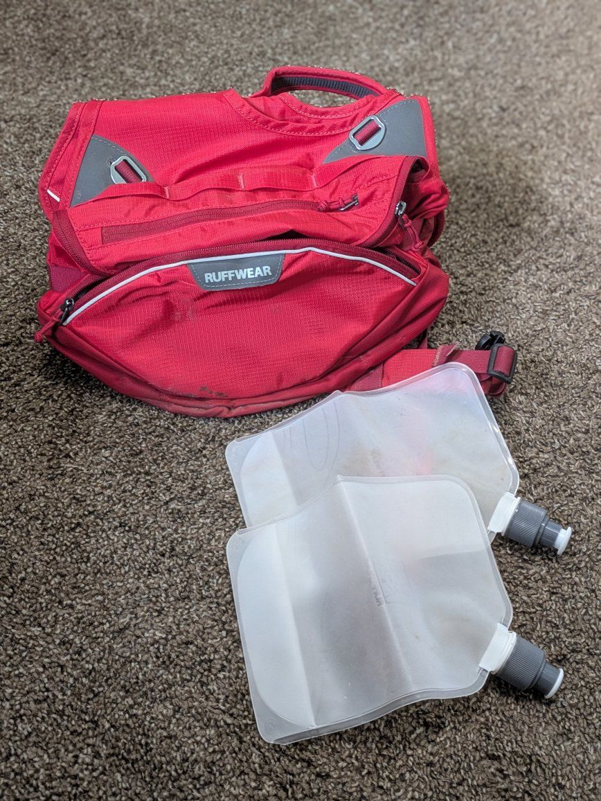 VenmoUsed Ruffwear Palisades pack, in really good condition with no snags and just a little spot of sap on one bag. It comes with the ruffwear water bottles, and it's the newer style with the detachable harness.