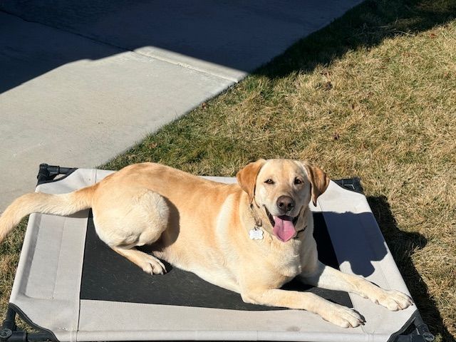 Meet Buddy- He is a 4 year old lab. He is current on his shots and is neutered. He loves to play and the neighborhooh kids love playing with him. We go on hikes every morning. I have spent lots of time training him. He does like to use his nose and explore. He does well on a leash and commands like stay, place, down, wait, and come. He does come with lots of stuff. He has been an outside dog.