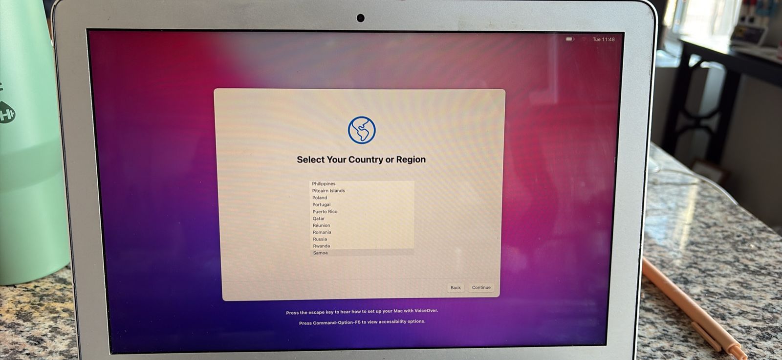 Recently factory reset and ready for a new owner. macOS is freshly installed and the laptop is at the setup (“Hello”) screen.