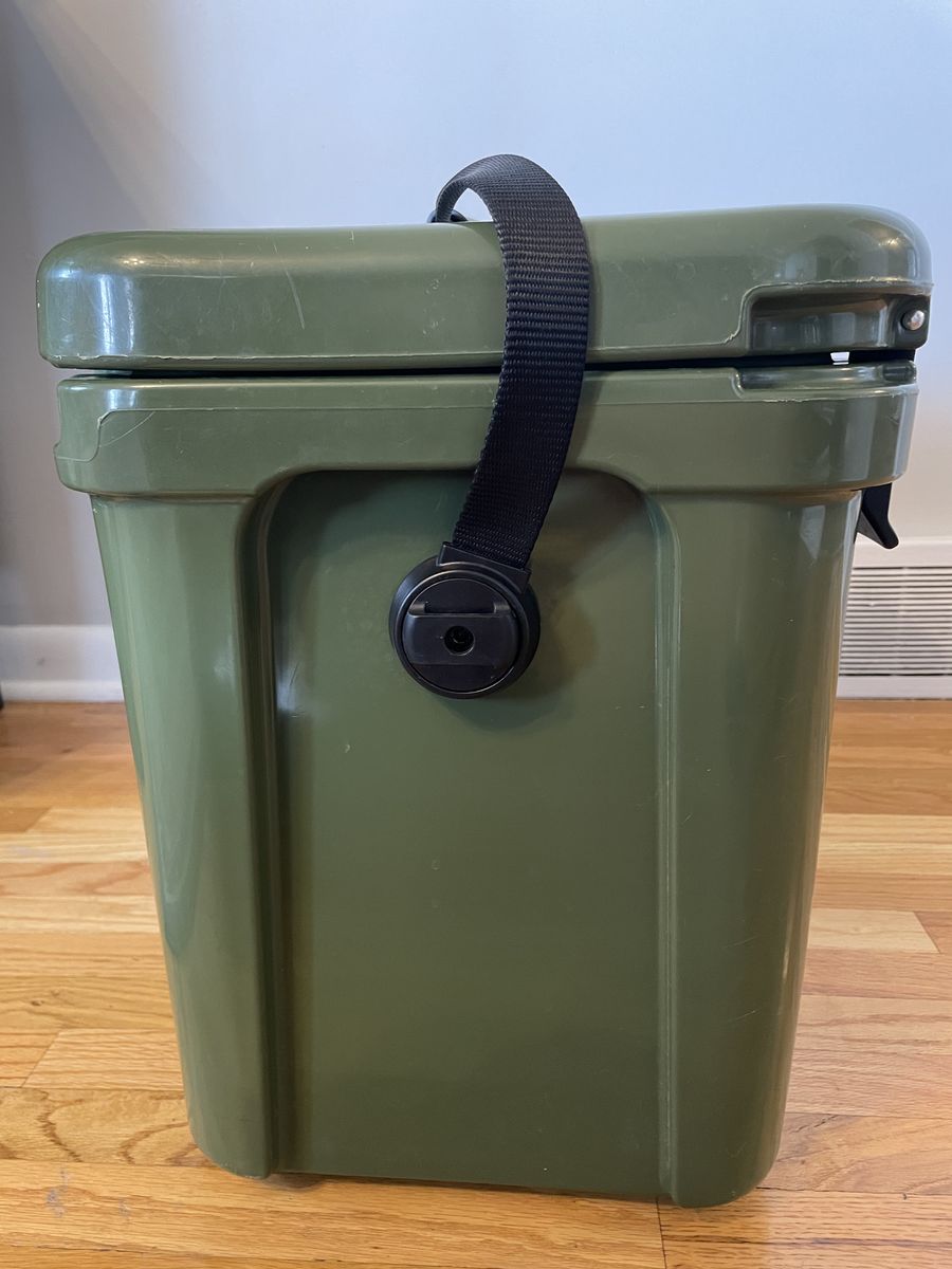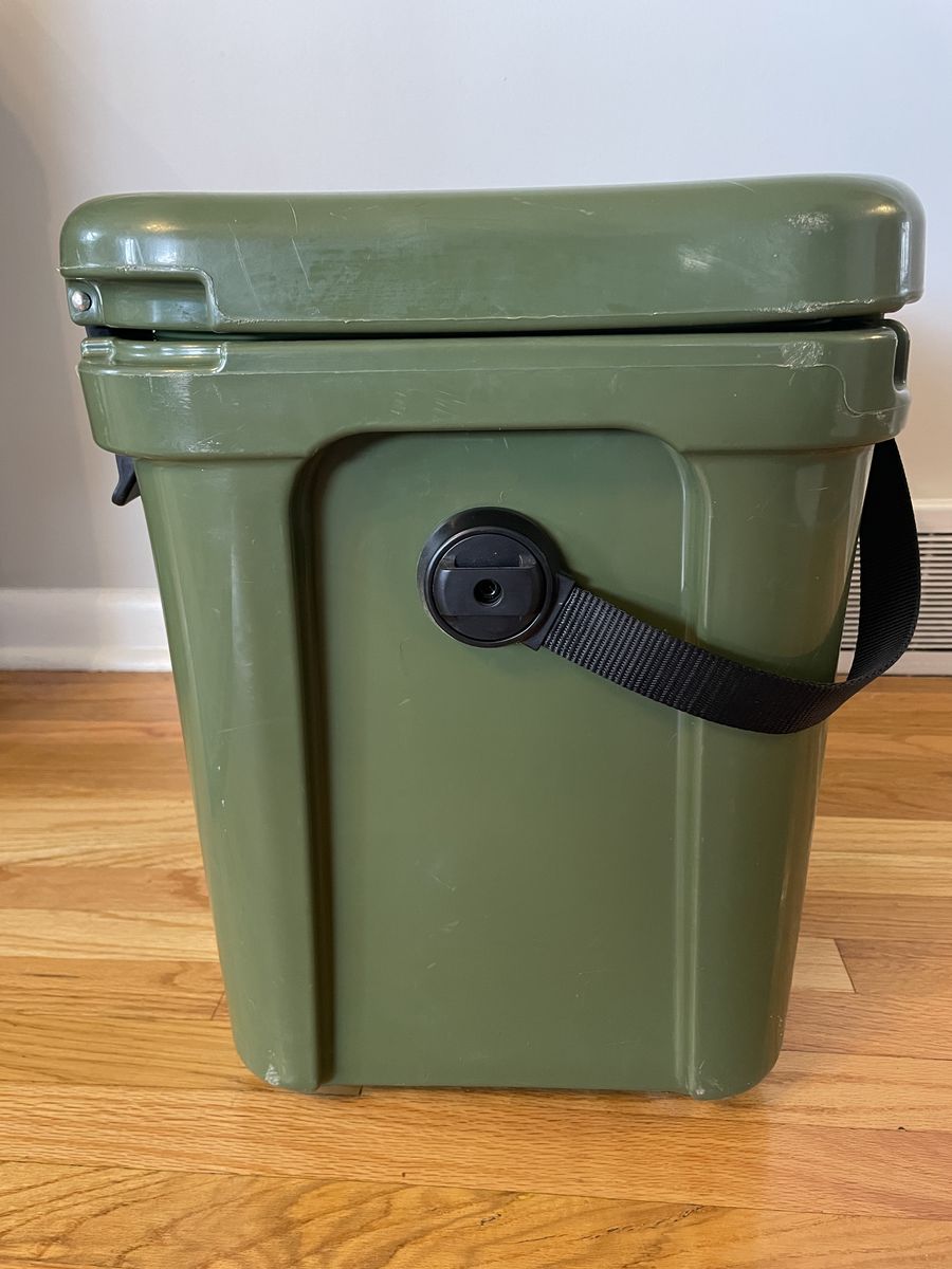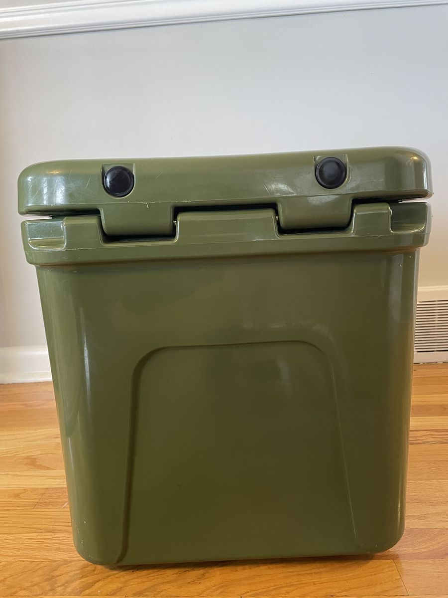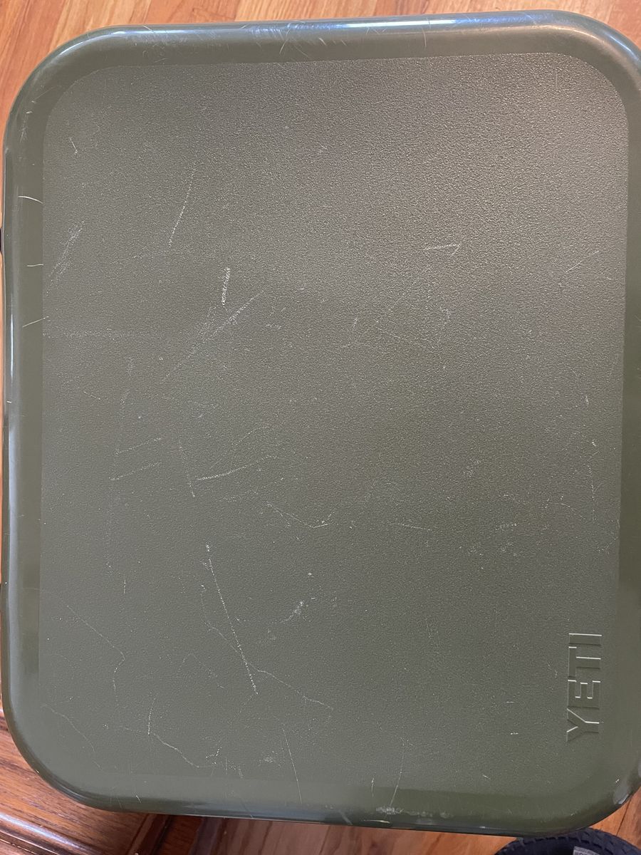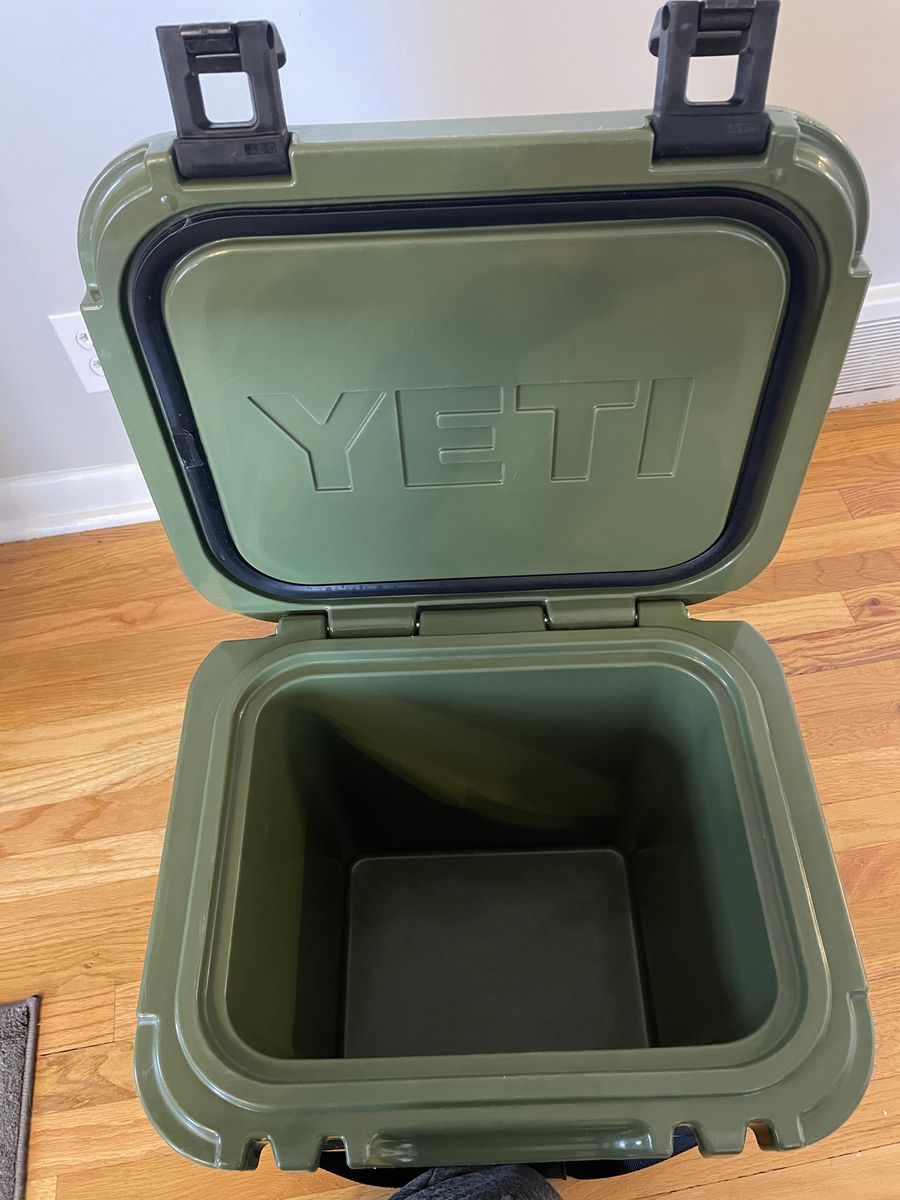 CashAppYeti Roadie 24 Hard Cooler, a nice forest green color. Has some scratches/scuffs on the top and sides. Clasps work and seals perfectly.