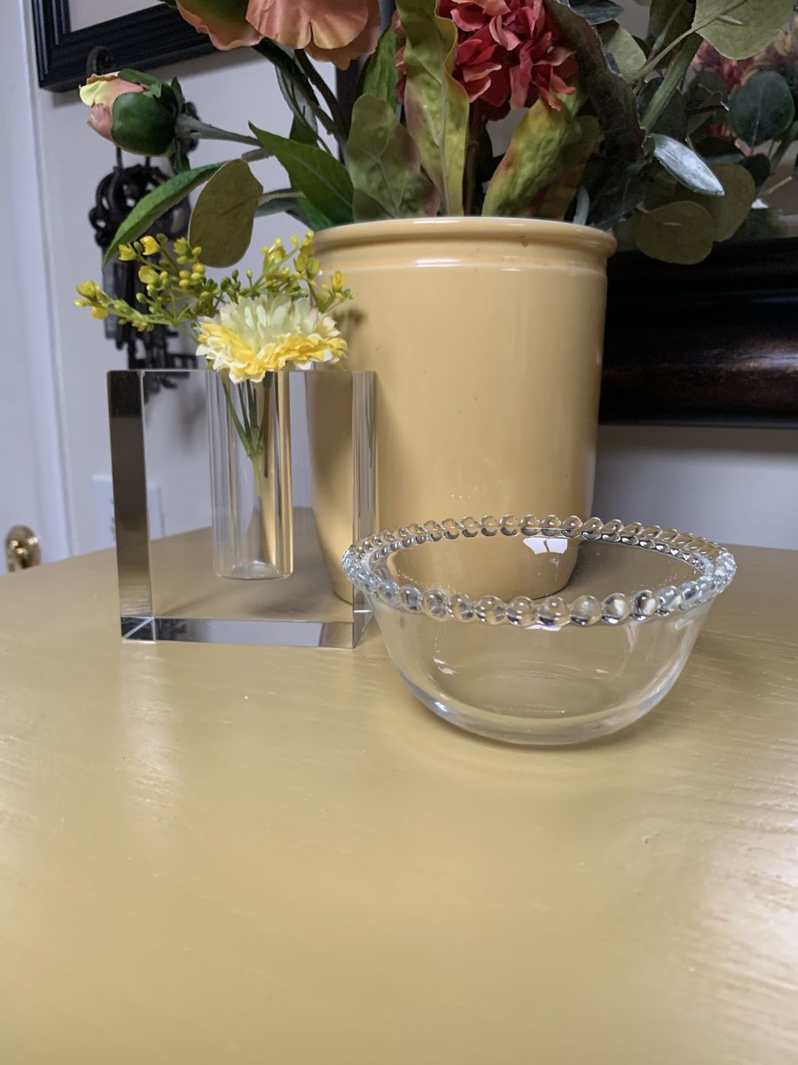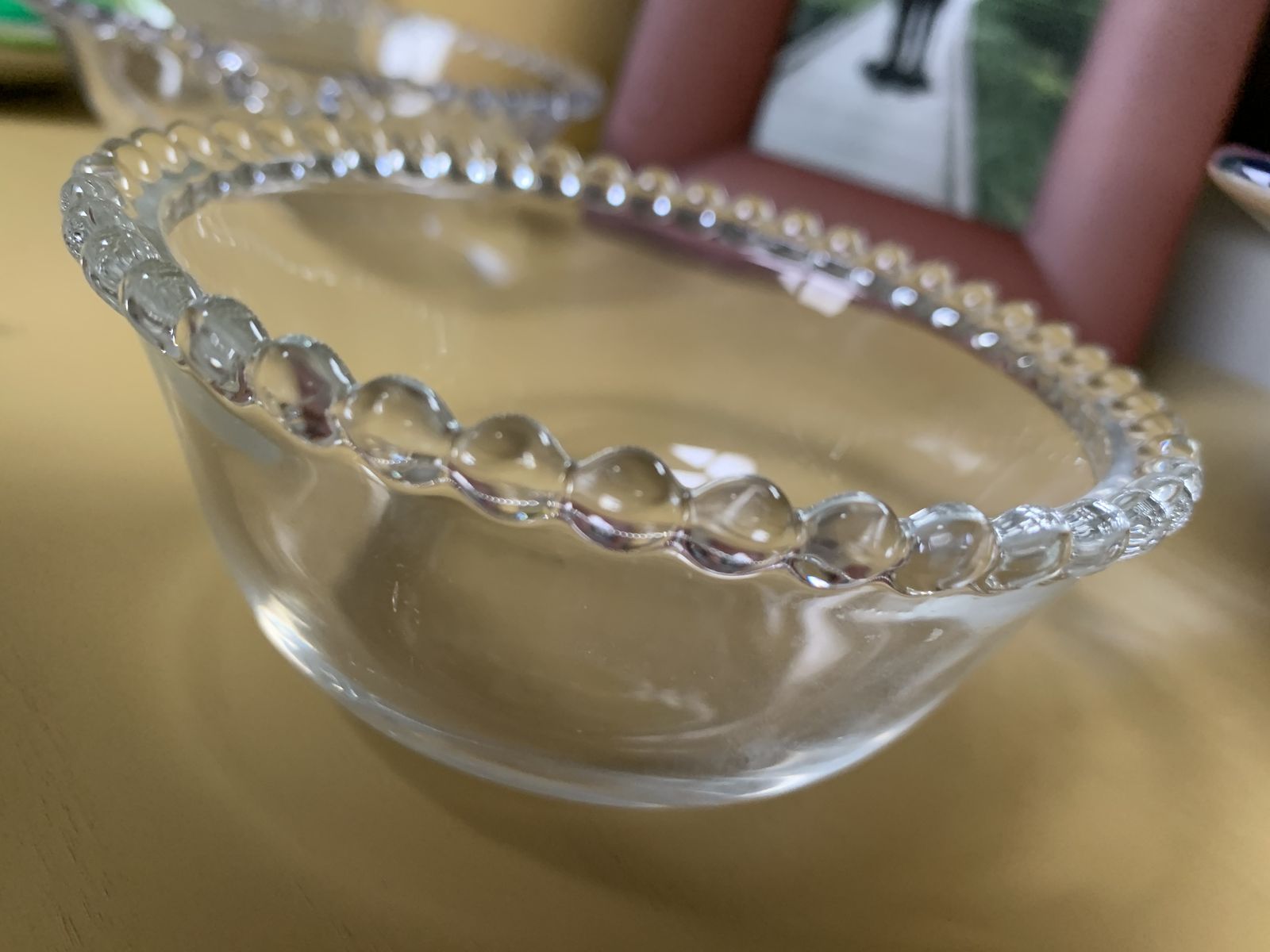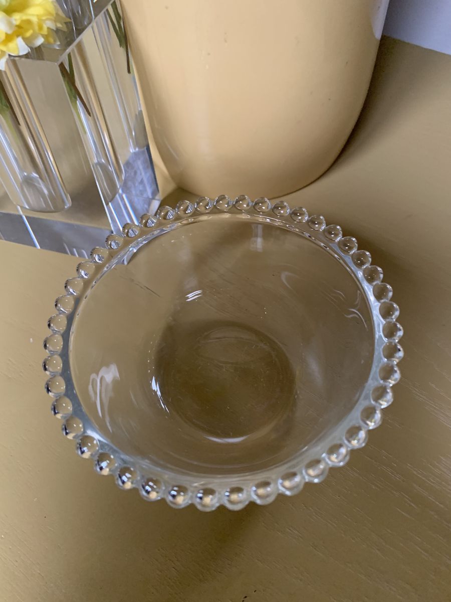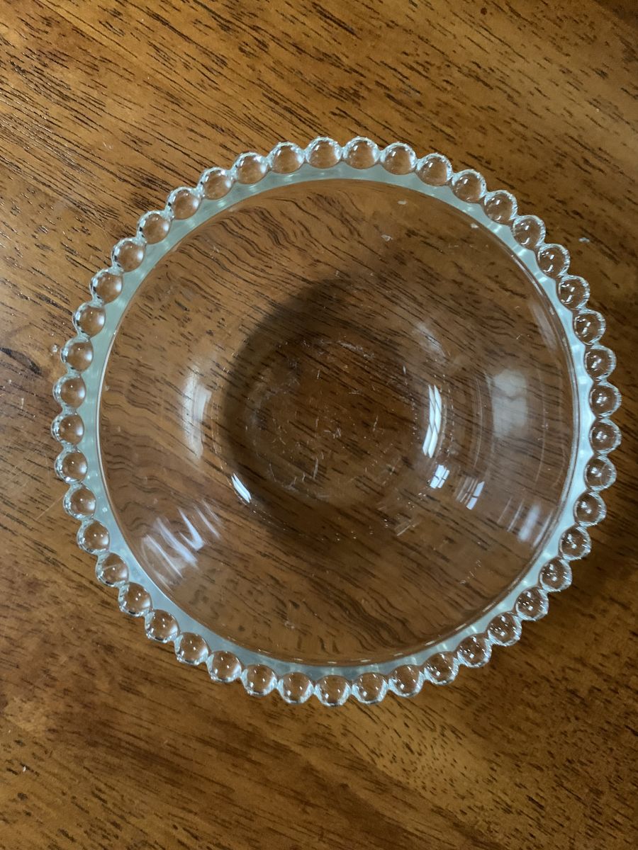 Venmo5”x 2 1/2” bowl with a hobnail-style beaded edging. Bowl shows some surface scratches on exterior at the bottom. Made from 1936-84. Clean. Hold only with Venmo. Non-smoking/No pet home.