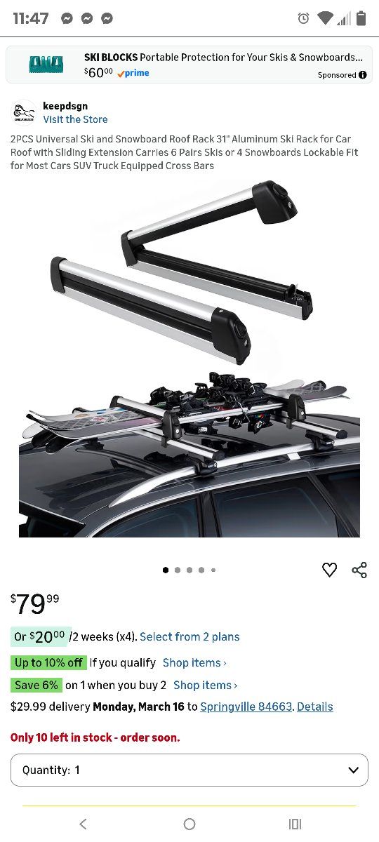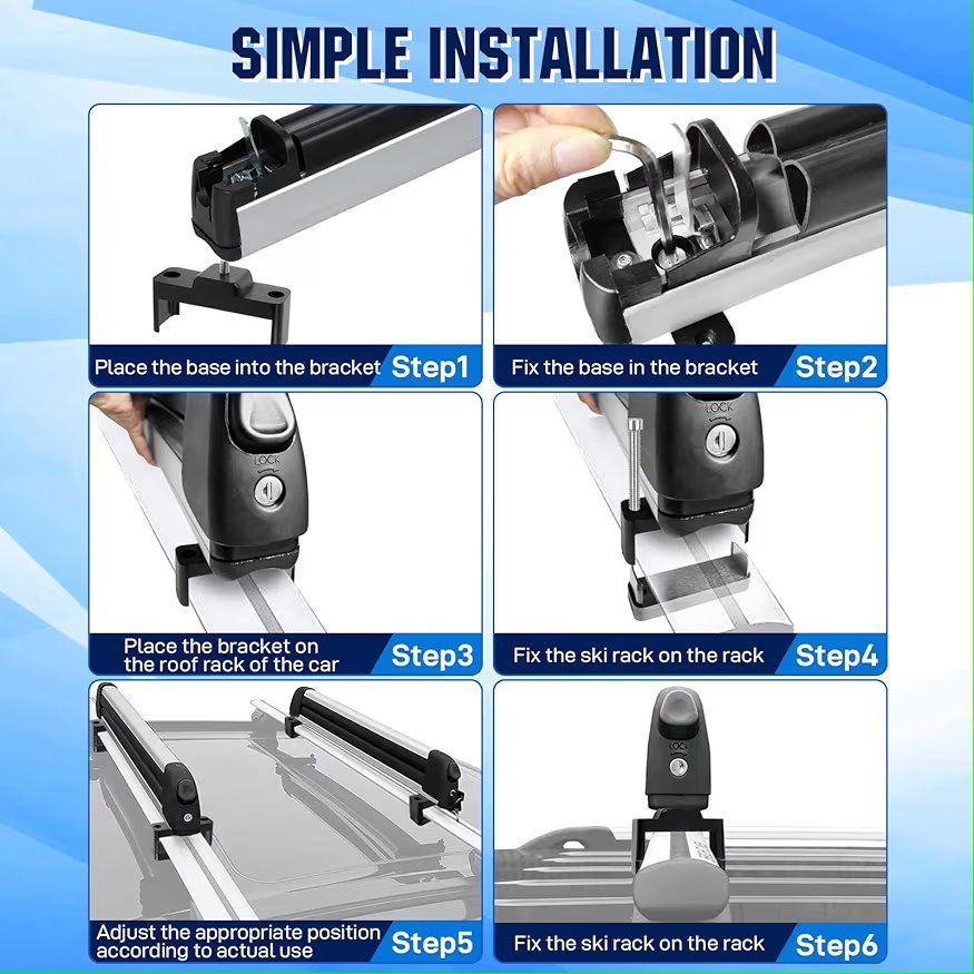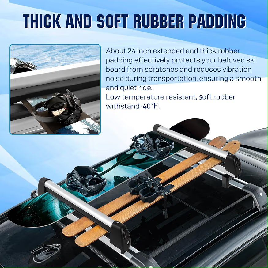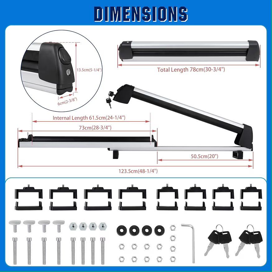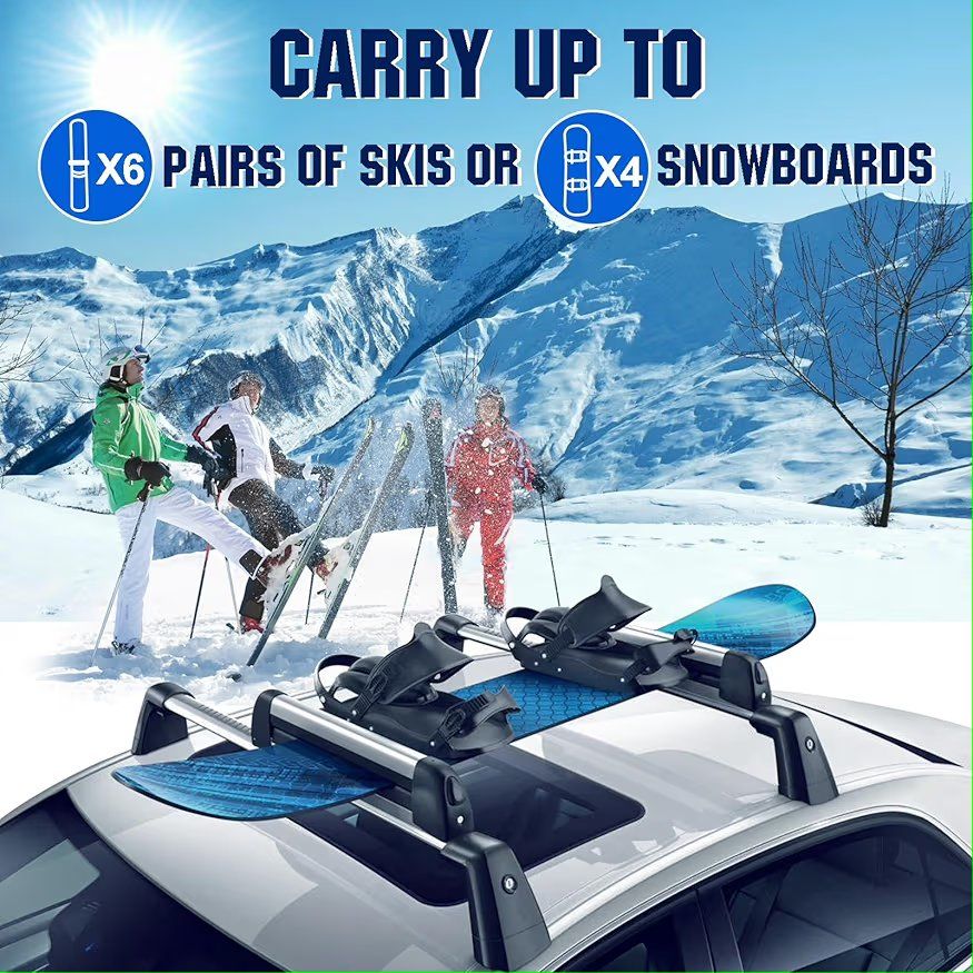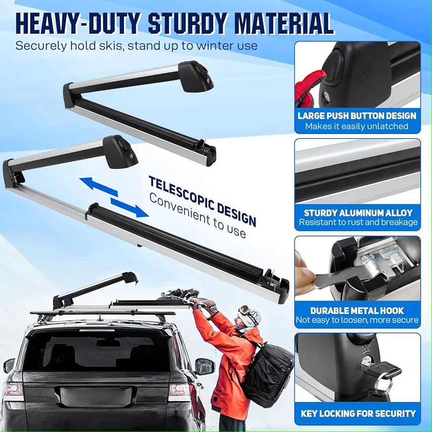 Extension Sliding DesignKEEPDSGN ski and snowboard roof racks can be extended by sliding the rubber bar for easy loading and unloading of skis or snowboards preventing scratches to your car and keeps your clothes clean during the loading and unloading process. Universal Ski Roof RackOur universal ski rack is suitable for most roof rack crossbars and can be effortlessly installed and secured without the need for drilling. Compatible with Honda Civic Accord Toyato Corolla Nissan Altima Sabaru Mazda,Audi etc. The ski rack for car roof is equipped with two specifications of brackets (7.5cm and 5cm), the width of the luggage rack crossbar should be less than 7.5cm. Maximize Your Car CapacityThe ski rack for car roof measuring 31 inch (78cm) long, can hold up to 6 pairs skis or 4 snowboards, and is also ideal for carrying fishing rods, paddles, ski poles and water skis,optimizing your vehicle's roof space while meeting storage and transportation needs. Lock in SecurityThe ski roof rack is equipped with an anti-theft locking system and two key locks to prevent theft, protect your gear during your travels. Large push button design makes it easily unlatched even while wearing gloves. Heavy Duty MaterialThe ski rack car roof rack is made of lightweight and duty aluminum alloy material, anti-rust, low temperature resistance, anti-corrosion and anti-breakage.The ski roof rack holds skis and snowboards securely with ultra-soft rubber arms that grip without scratching the surfaces,while reducing vibration noise during transportation, ensuring a smooth and quiet ride. Improve Aerodynamic PerformanceThe lightweight and streamlined design ensures the snowboard rack won't burden your vehicle,while reducing wind noise and drag, improving vehicle stability.