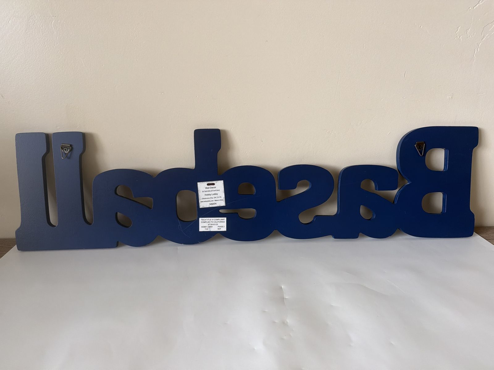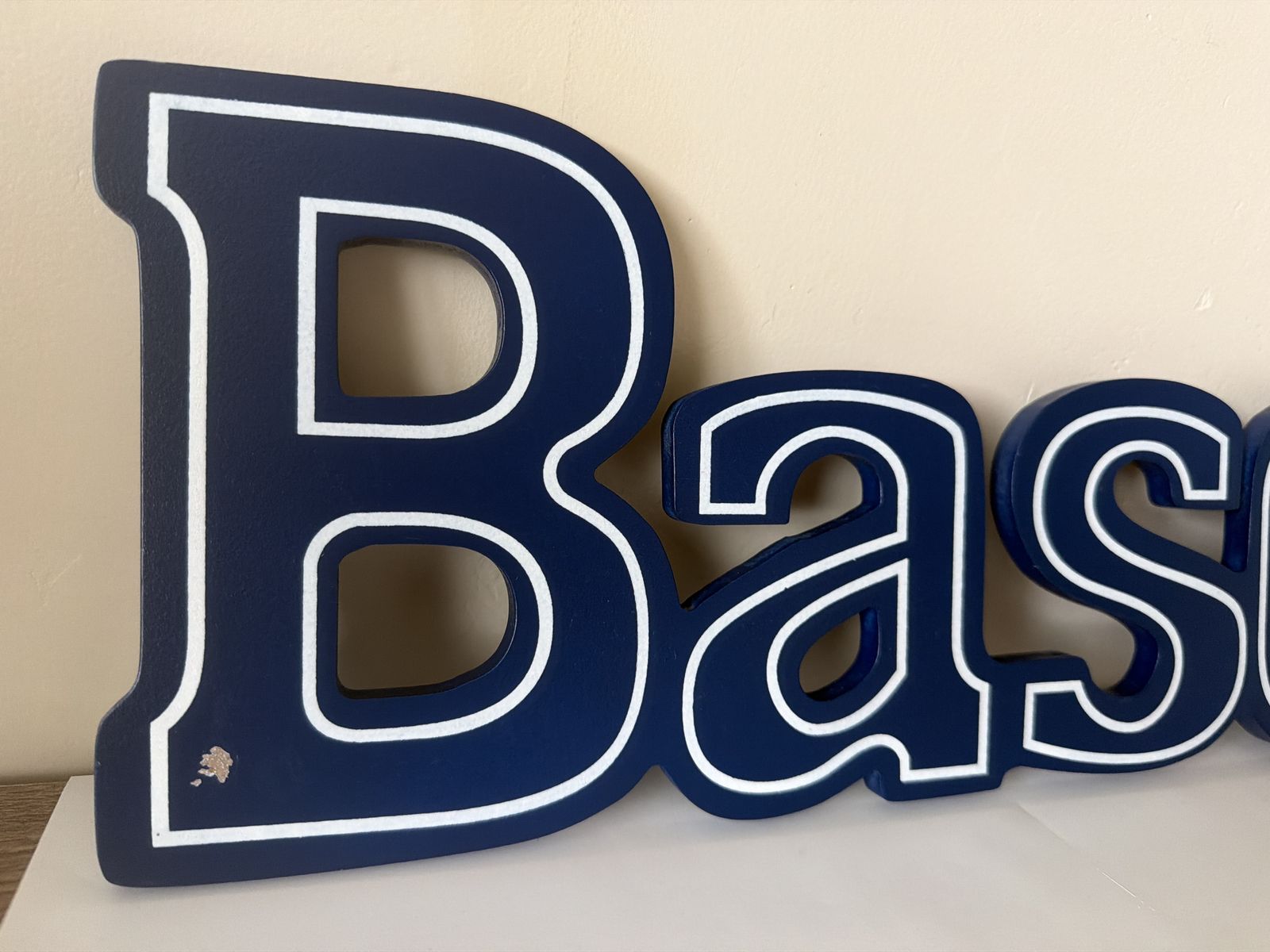 Blue “Baseball” decorative sign, perfect for a sports-themed room, kids’ bedroom, playroom, or baseball fan decor. The sign features bold blue letters with a white outline, giving it a clean and sporty look. It can be displayed on a shelf, dresser, or mounted on the wall.