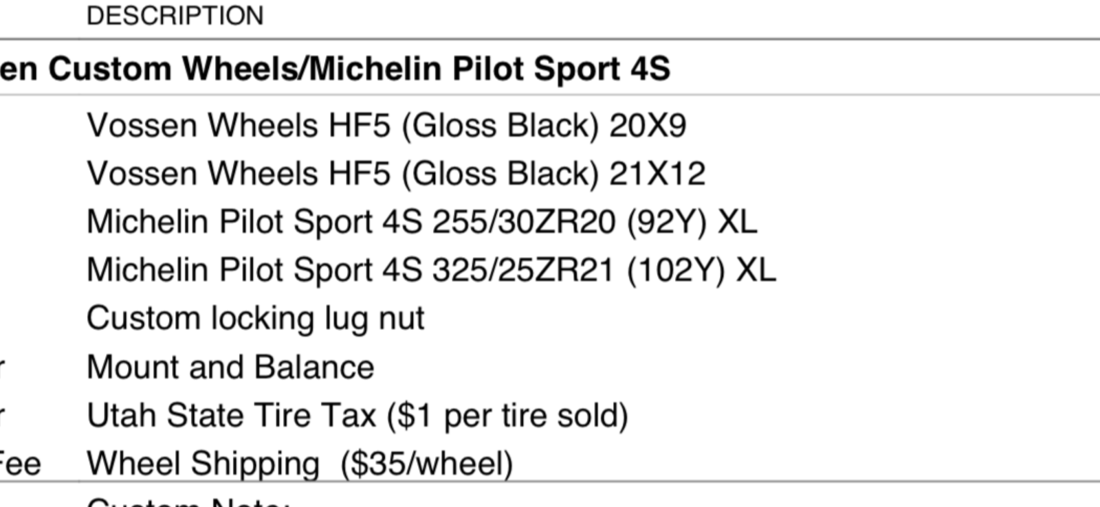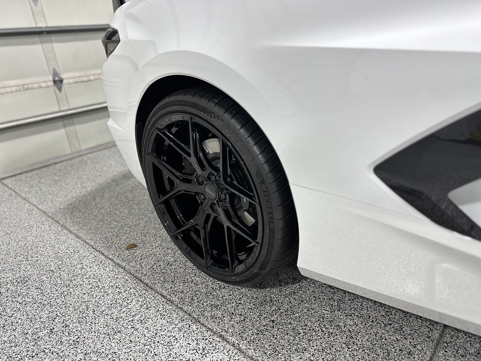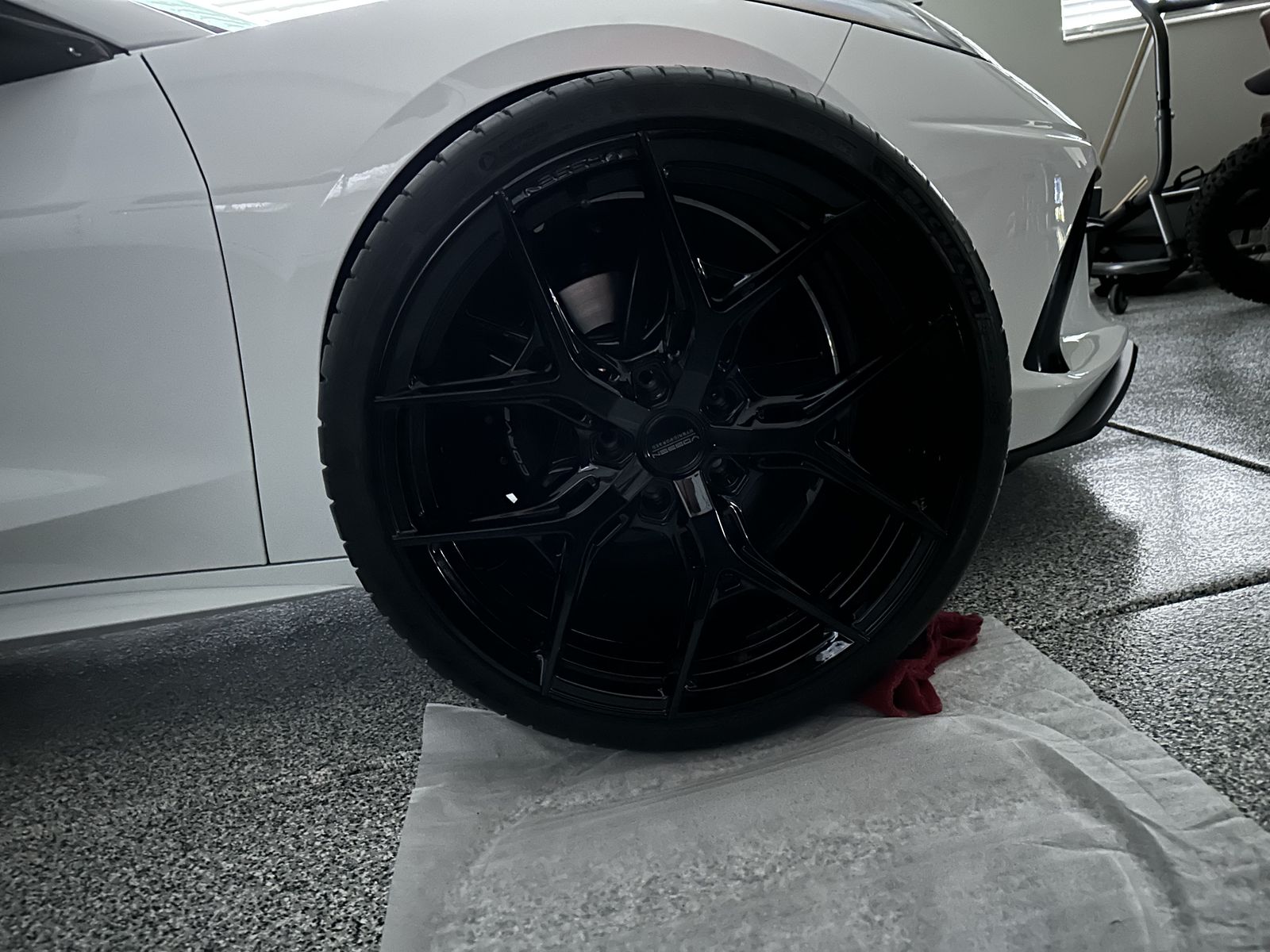 Put 400 miles on tires and then sold car. These are perfect, unblemished. Paid $6,000 for setup. These wheels are amazing, they just don't fit on my new car. They work on C8 Corvette and really dress it up.