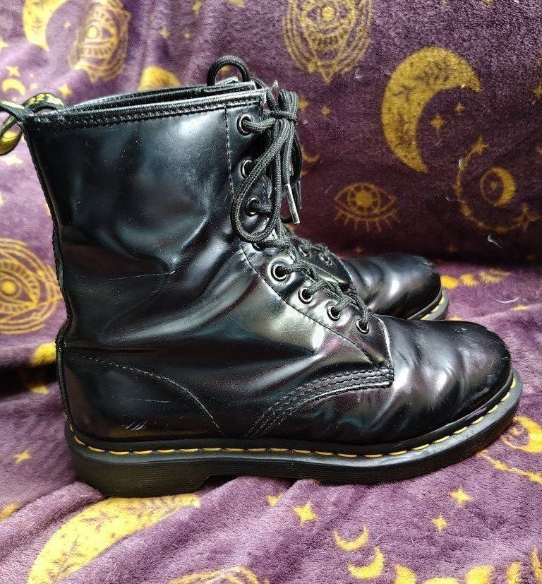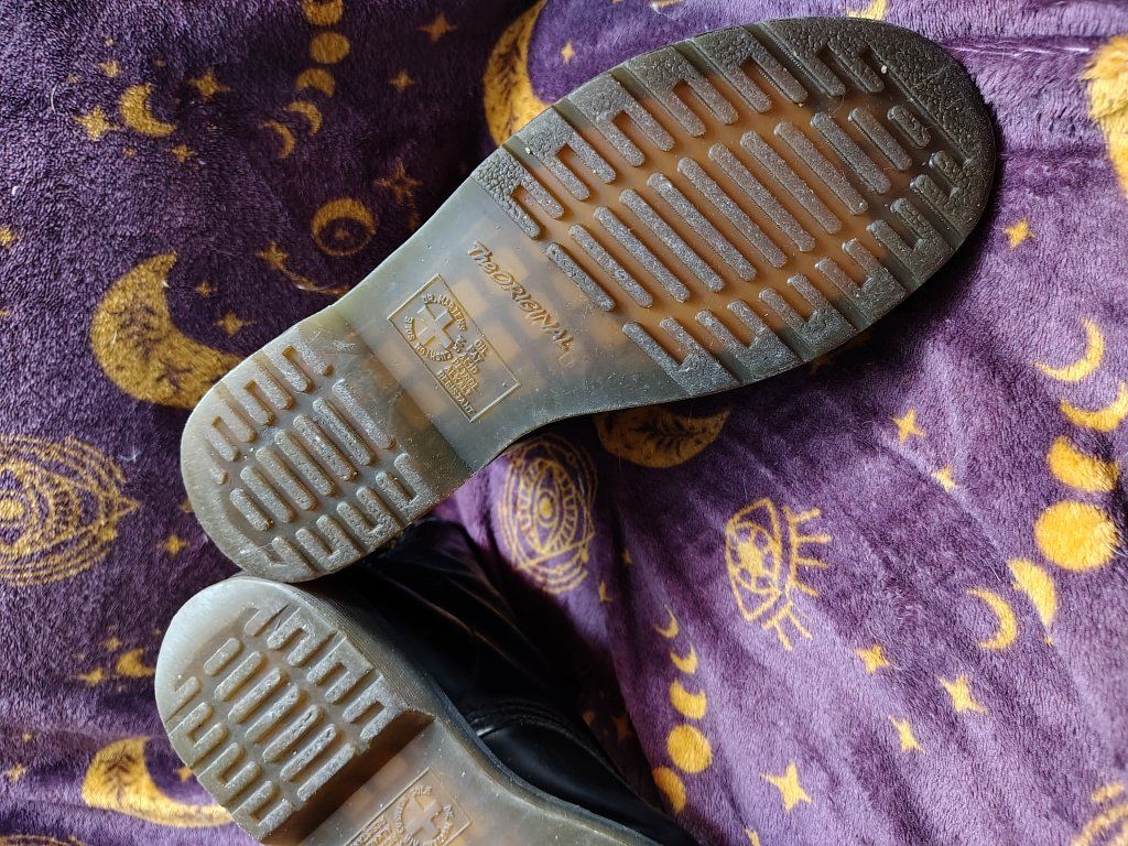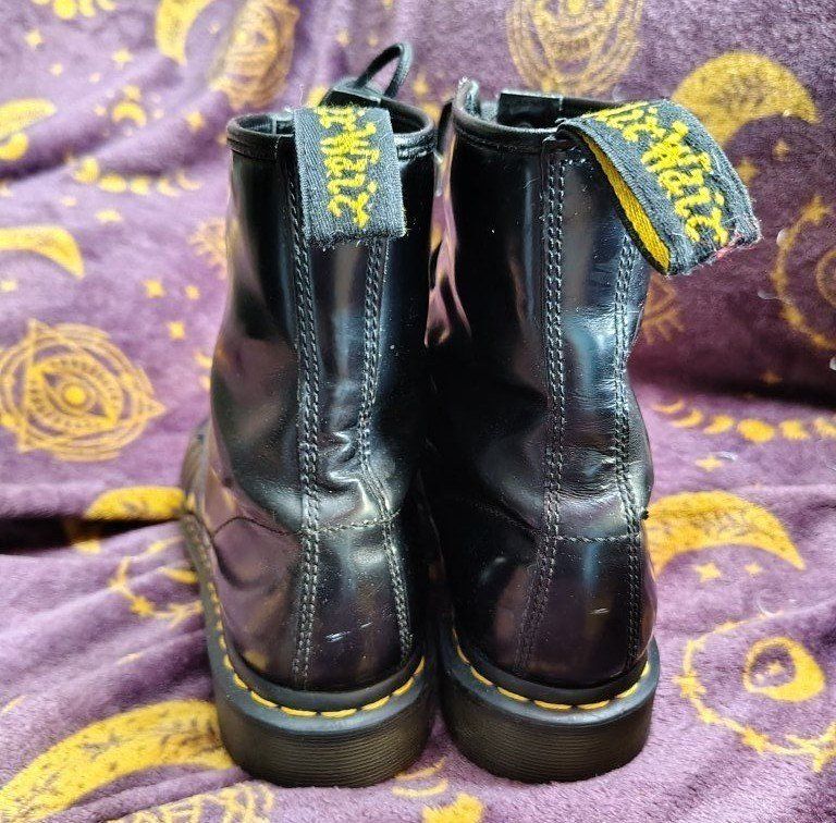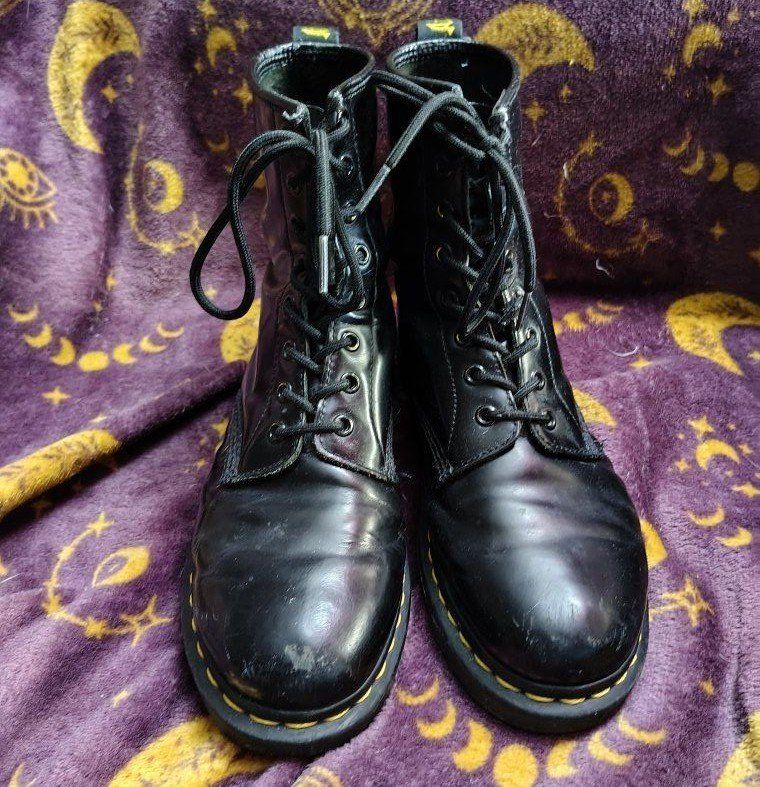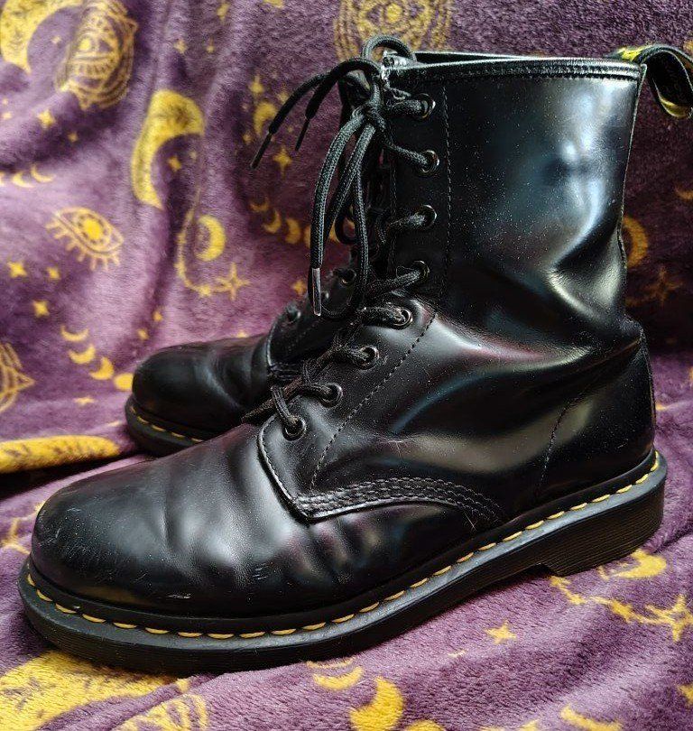 size 9 womens or size 7.5 mens black leather doc marten boots. they have some scuffs and scrapes. they still have pretty good tread. no steel toes.