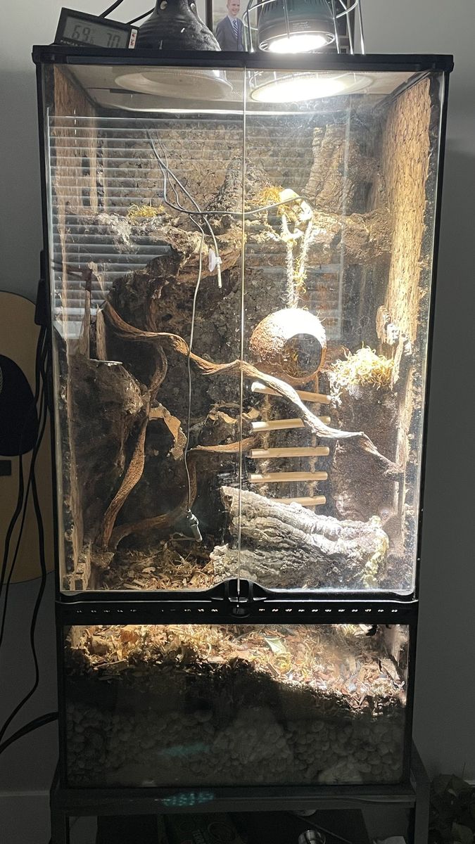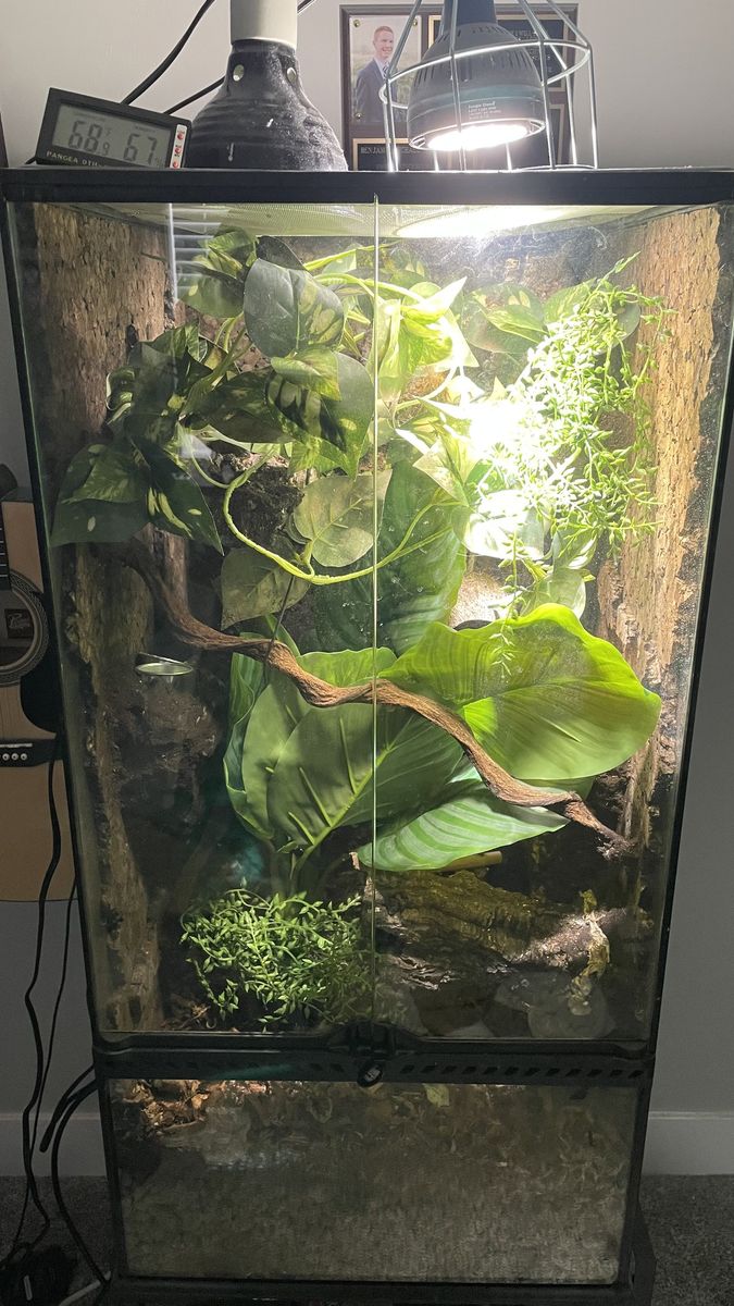 VenmoThis is my gecko, Edison. He is a male adult tiger morph crested gecko. He is 48 grams and a healthy eater. He comes with a full 18x18x36 enclosure. It has the needed substrate set up with a filtering system and the lighting to set up a bioactive enclosure. It comes with a bunch of plastic plants, a custom background as well as a timer, temperature gages, food dishes and spray bottle. Looking for someone who can take good care of him! Over $1,000 dollar value.