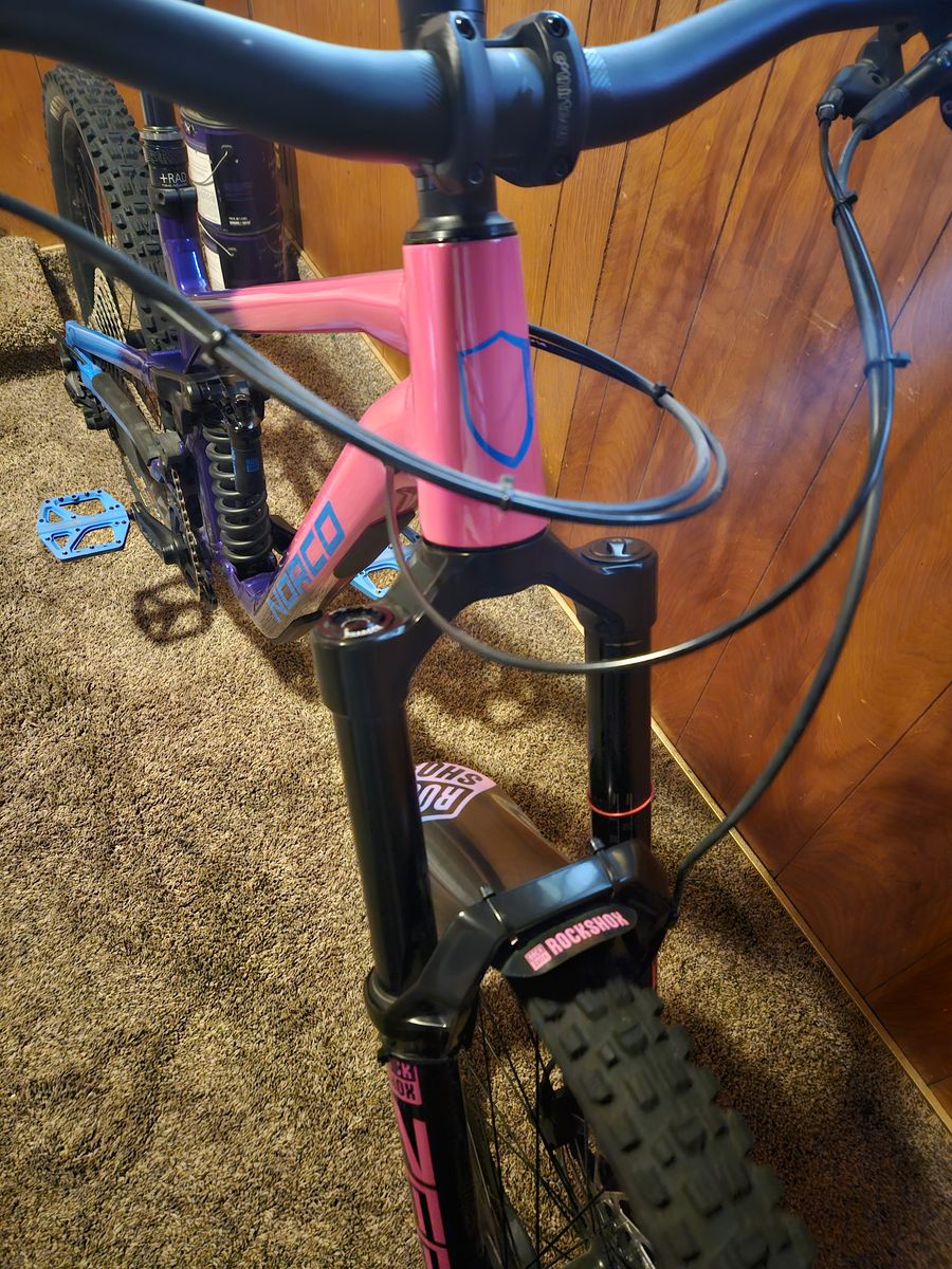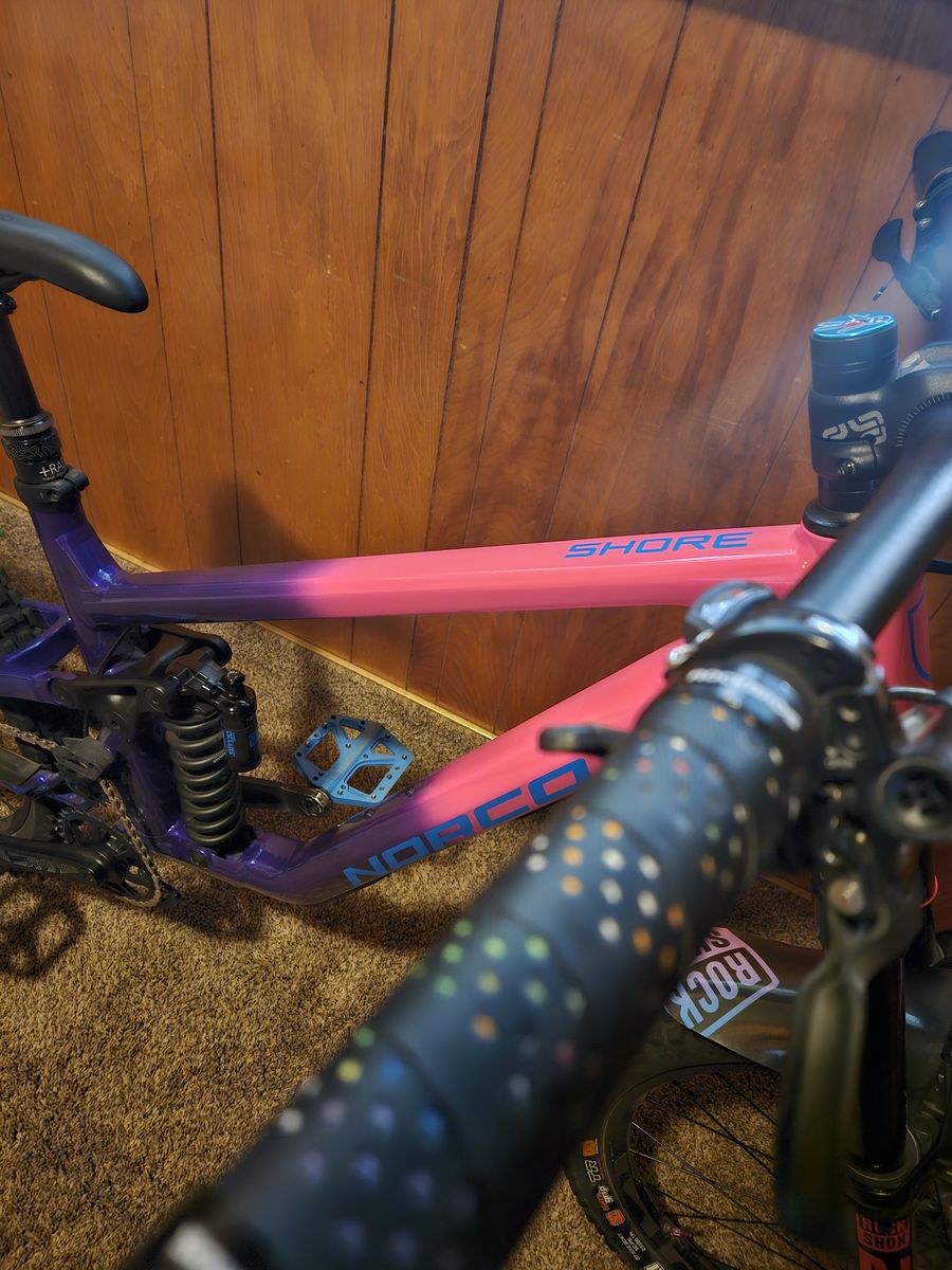 Beautiful Norco shore mountain bike full suspension perfect for downhill or all around riding few upgrades no scratches she's in perfect condition never wrecked hardly ridden honestly I hate selling but unfortunately need the money.. I drove all the way to Oregon to get this last one and paid just a hair over 5g