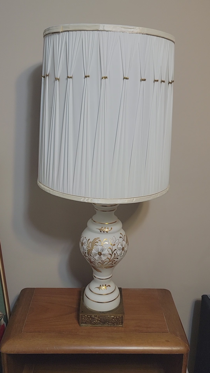 With its elegant Hollywood Regency flair, this lamp serves as both a functional lighting source and a sophisticated statement piece for any interior. The intricate gold detailing highlights the craftsmanship of the era, while the ornate brass base provides a sturdy and visually appealing foundation. The original pleated shade diffuses light softly, creating a warm and inviting ambiance that complements classic, eclectic, or contemporary décor styles. Ideal for living rooms, bedrooms, or entryways, this lamp effortlessly brings vintage charm and timeless beauty to your home.