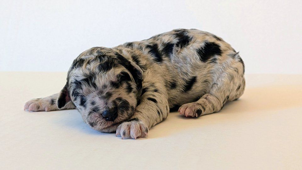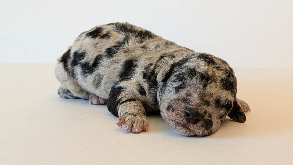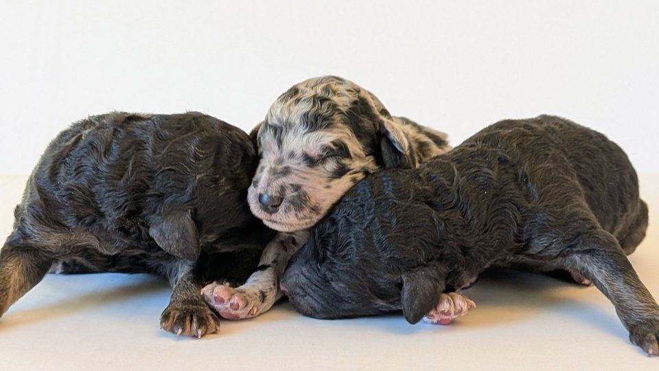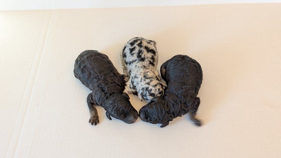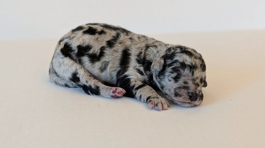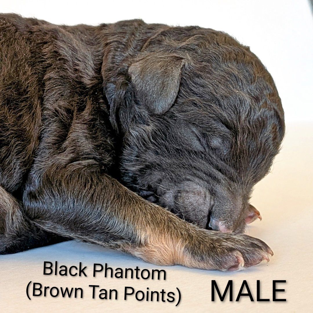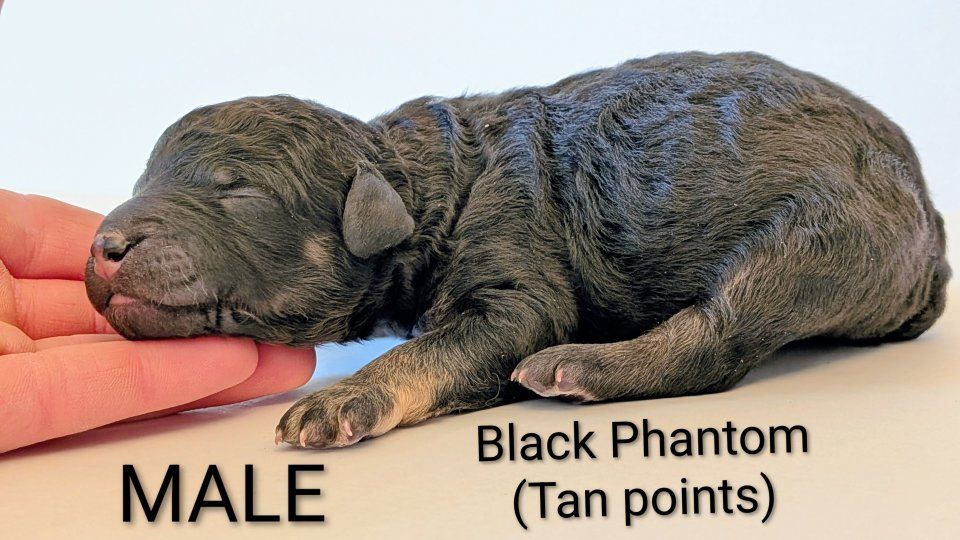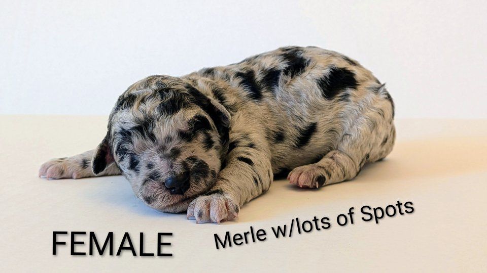 Female: Merle w/lots of spots! Male: Both boys are black phantoms. We call them "the twins."