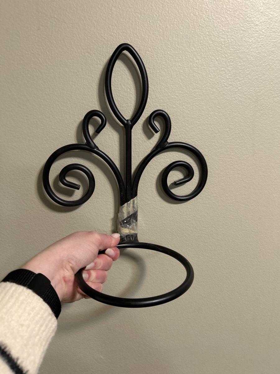 ApplePay2 Black iron sconces with clear glass decor Fleur dis lis style Sold as a pair The tape is holding the screws so they didn’t get lost. Rocks can be used or discarded