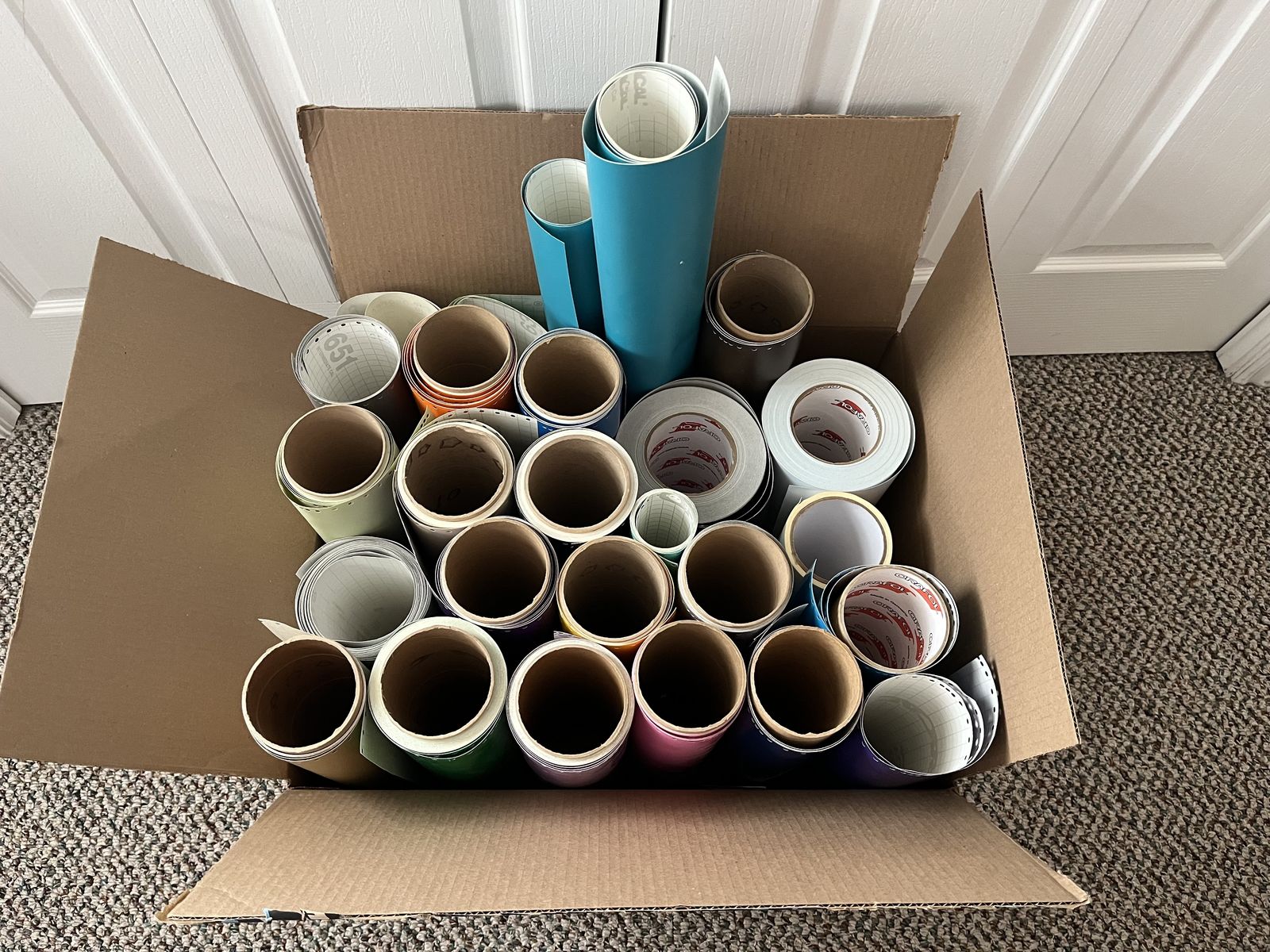Zelle25 rolls of vinyl of many different colors and lengths. These rolls are compatible with any vinyl plotter (like a Lynx or Cricut) but can also be easily hand-cut for home organization, scrapbooking, and DIY glass etching projects.