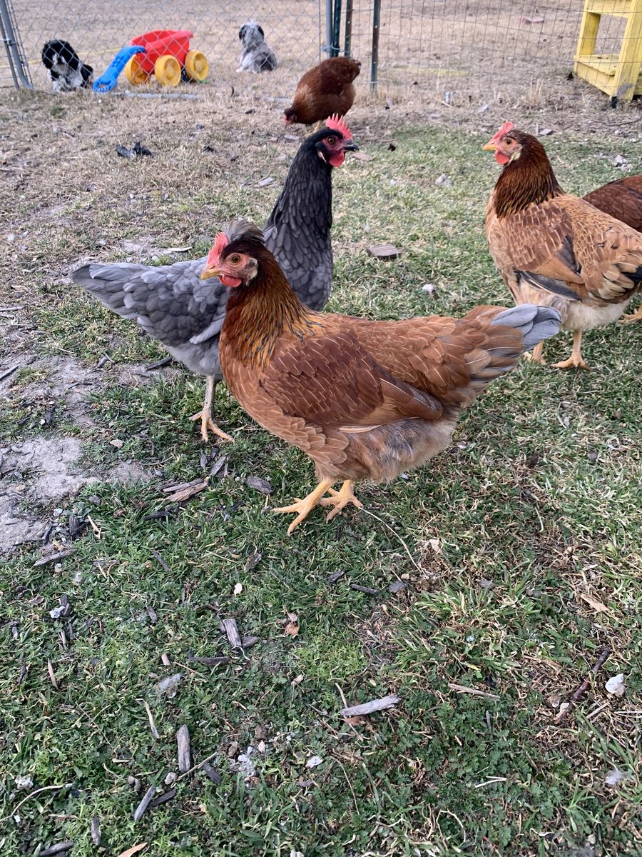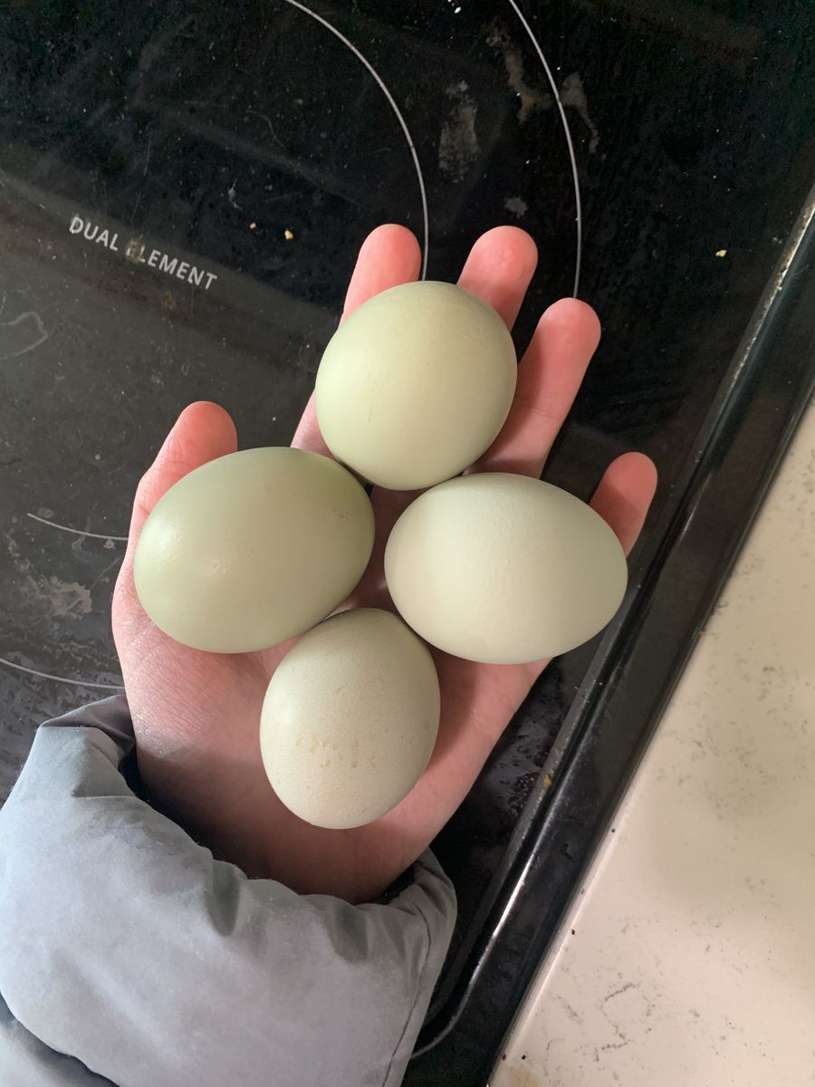 3 are Easter eggers that lay beautiful green and blue eggs. 1 is a road island red that lays a big brown egg every day.