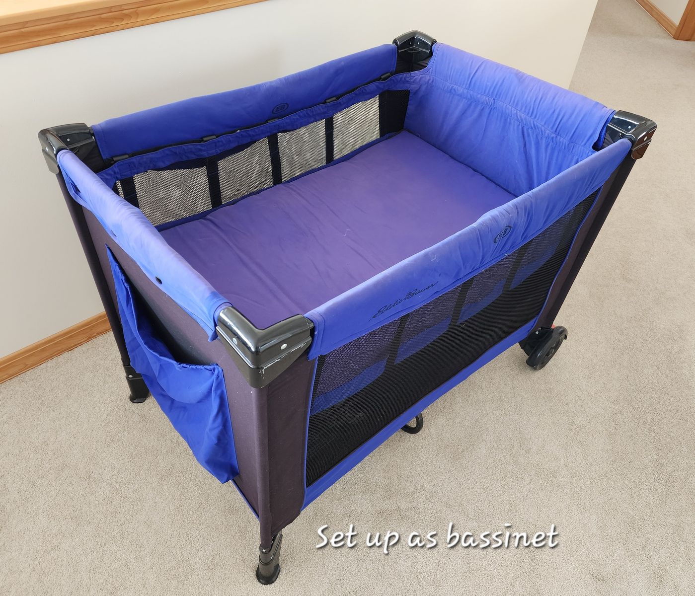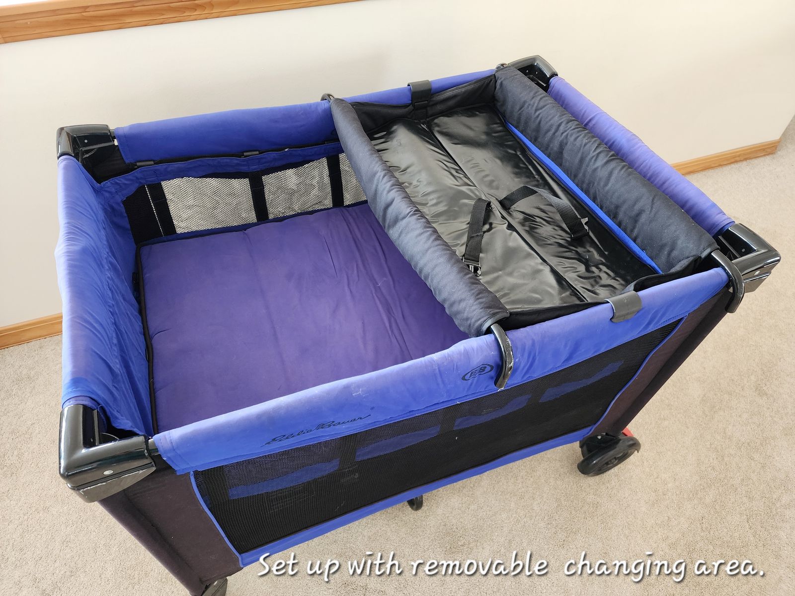 VenmoEddie Bauer/Cosco Funsport portable compact baby play yard, complete with additional bassinet adaptation and changing area. Everything folds up. Carry bag included. Used very little. Great for visiting grandkids.