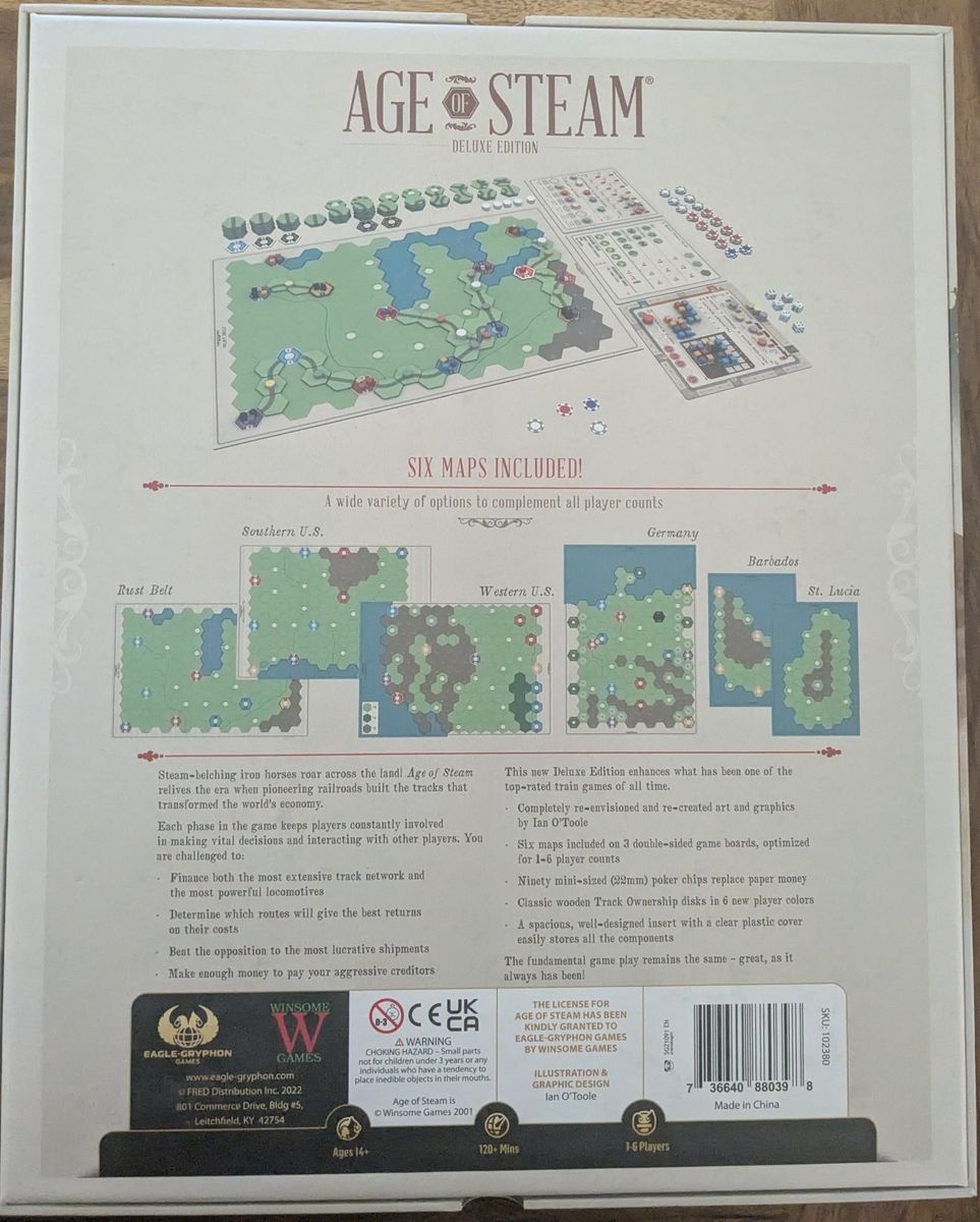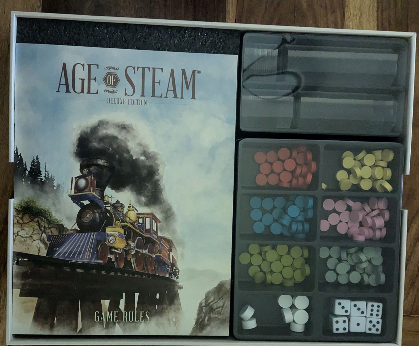 With the latest printing of Age of Steam Deluxe Edition we have increased the box size to match our other big box deluxe games and created a new insert layout.