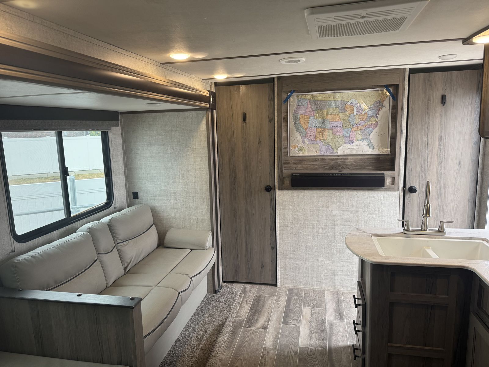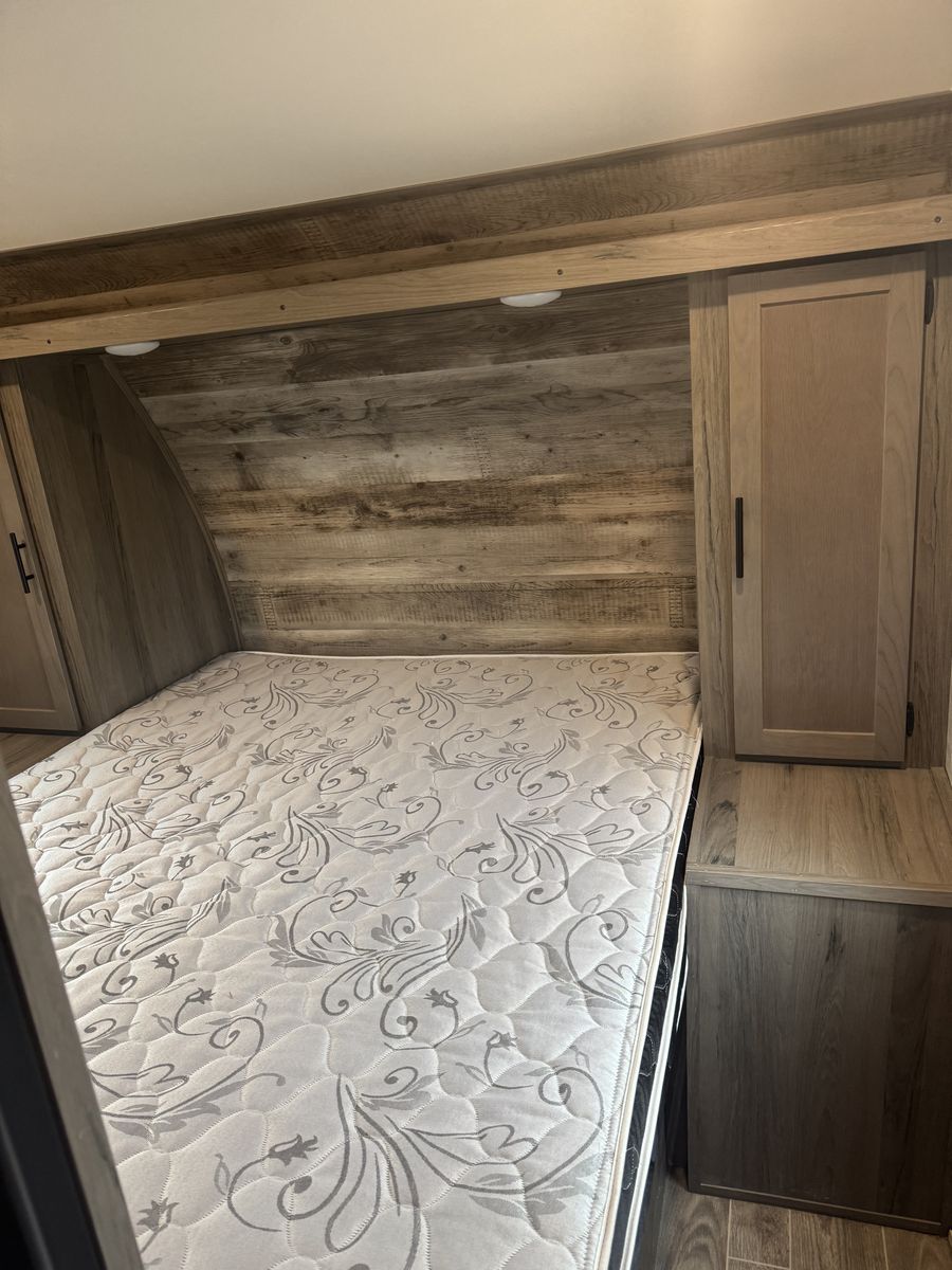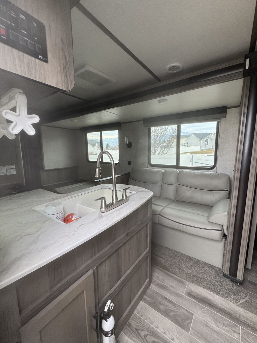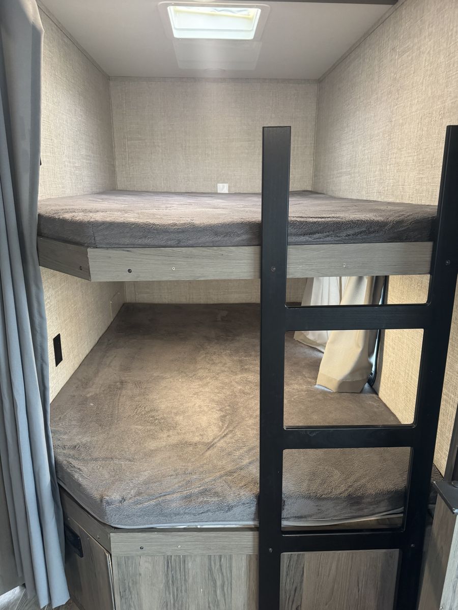 The dinette and sofa slide out for more room on the inside and both fold down to allow for sleeping. The bottom bunk can sleep 2 if needed. Has some minor cosmetic wear and tear, but overall is in good shape.