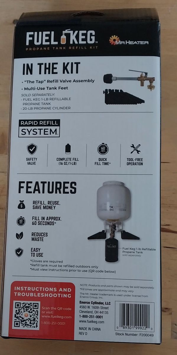 VenmoBrand new never used system that costs $70 new. Use the Mr heater fuel keg refill kit to safely and quickly refill the fuel keg refillable cylinders it's user-friendly design makes it easy to use while reducing waste from single use propane tanks. Must have a 20 lb propane tank available to fill tanks from.