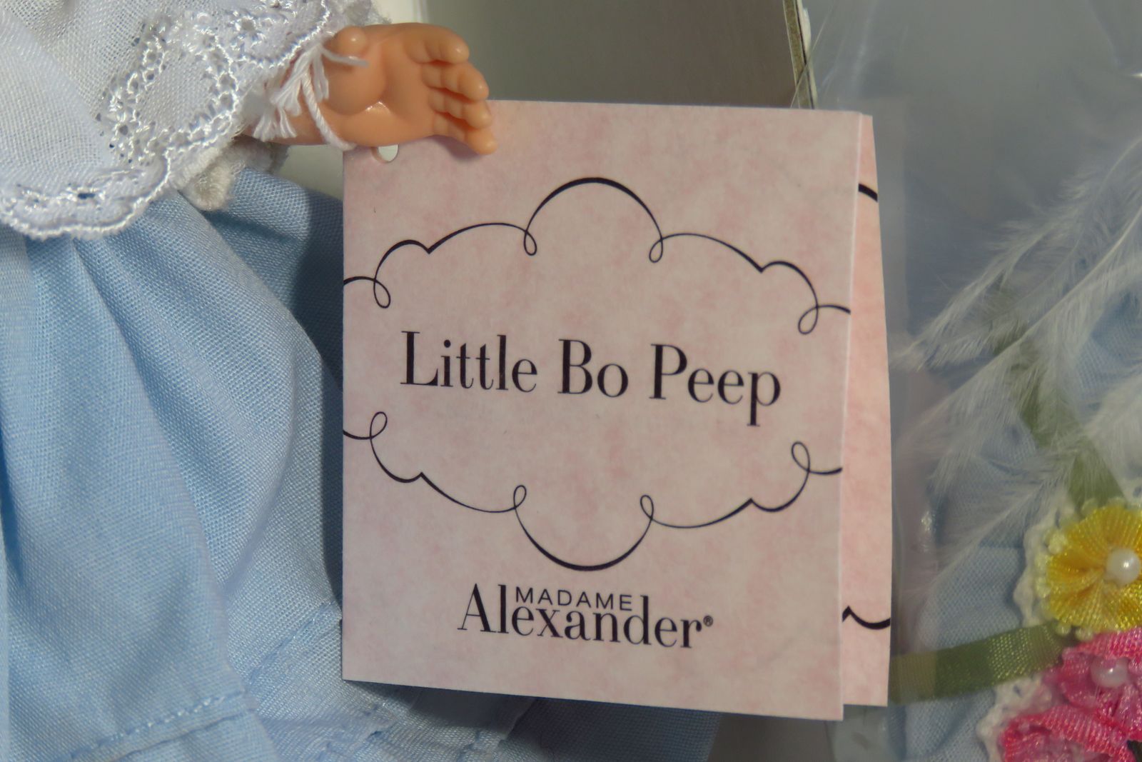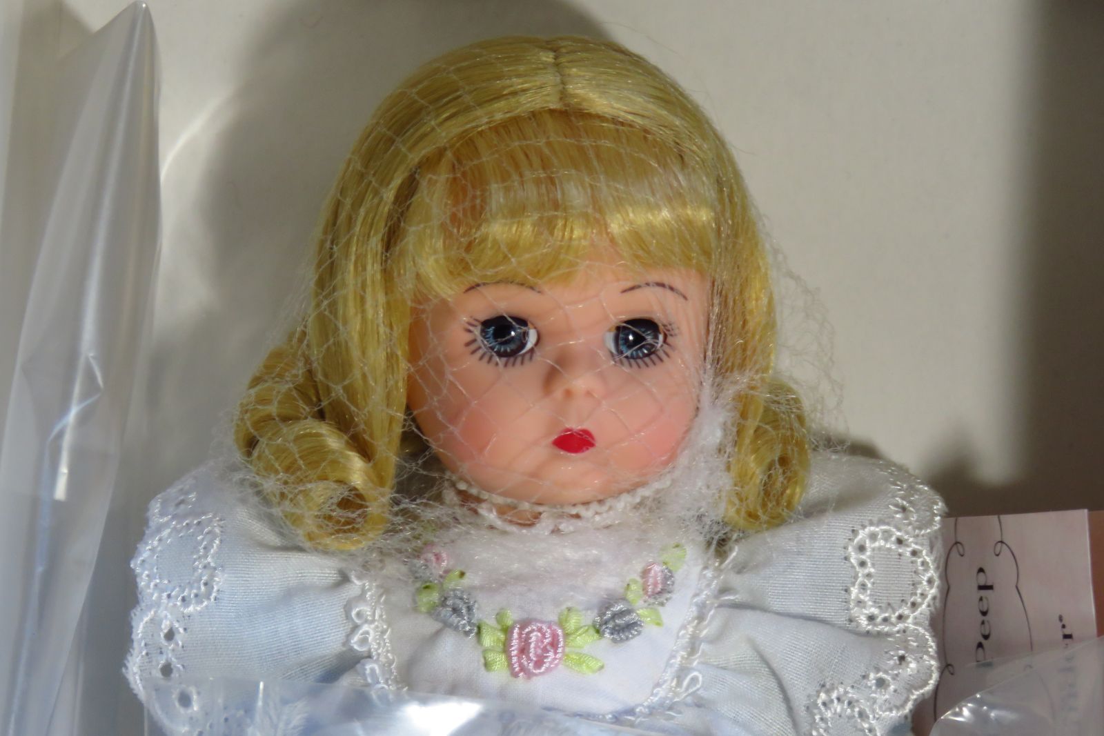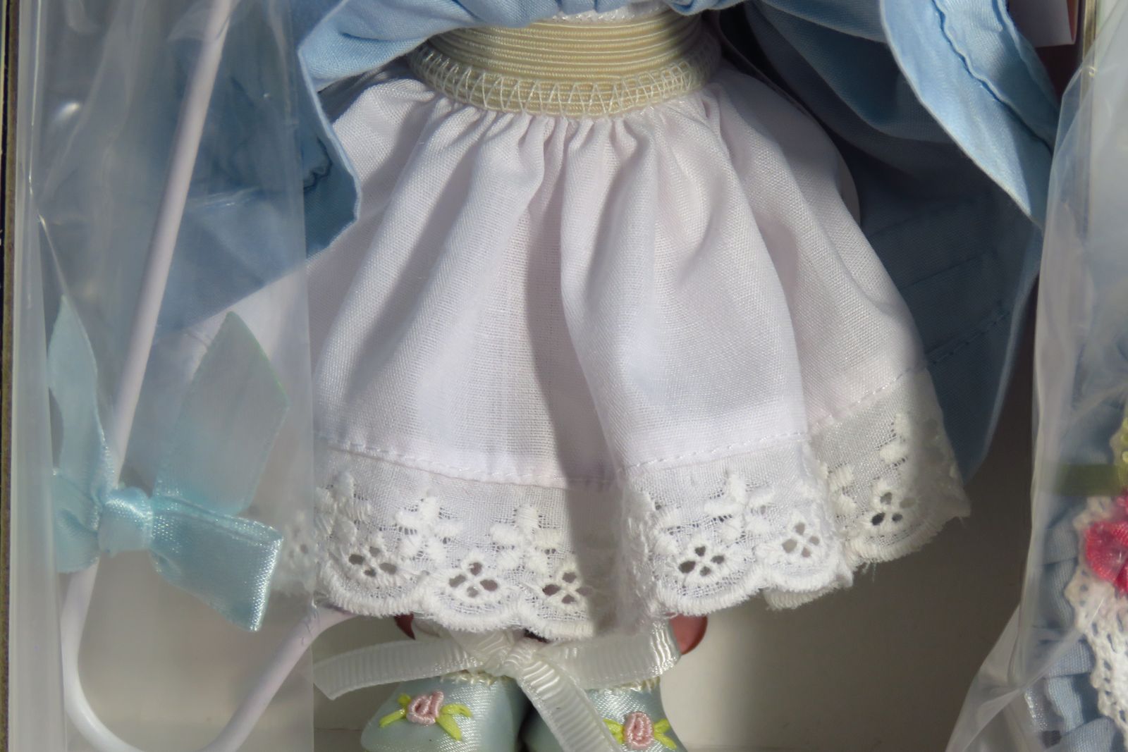 Pre-Owned. She was introduced in 2000 and her hang tag has a copyright date of 2002. This little cutie has blonde hair, and she has blue eyes that open and close freely. She is still wearing the hairnet to protect her hair. The white bodice of her dress is trimmed with pink and blue stitched flowers, white looped trim, and a wide white eyelet with stitched hearts. The dress has blue puff sleeves trimmed with small white eyelet and the skirt has three rows of tiny pintucking. Her white cotton slip has a wide band of elastic around the waist, and the bottom edge is trimmed with white eyelet. She is wearing white knit tights and blue satin slip on shoes with a pink flower and light green leaves on the toes of the shoes. Her blue hat is made of the same blue fabric as her dress. One side of the hat is trimmed with three little flowers that have a “pearl” bead center in each one and a little narrow green ribbon bow behind the flowers. The other side of the hat has two little flowers and a large white feather. The hat also has a gathered sheer blue ribbon around the outer edge. The hat is still in its plastic bag which is still stapled to the cardboard box liner. Her white staff with a big blue bow is also still in its plastic bag and is still stapled to the cardboard box liner. The box lid has a dent along one edge. Please see photos.