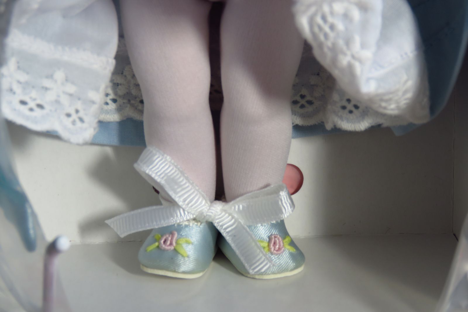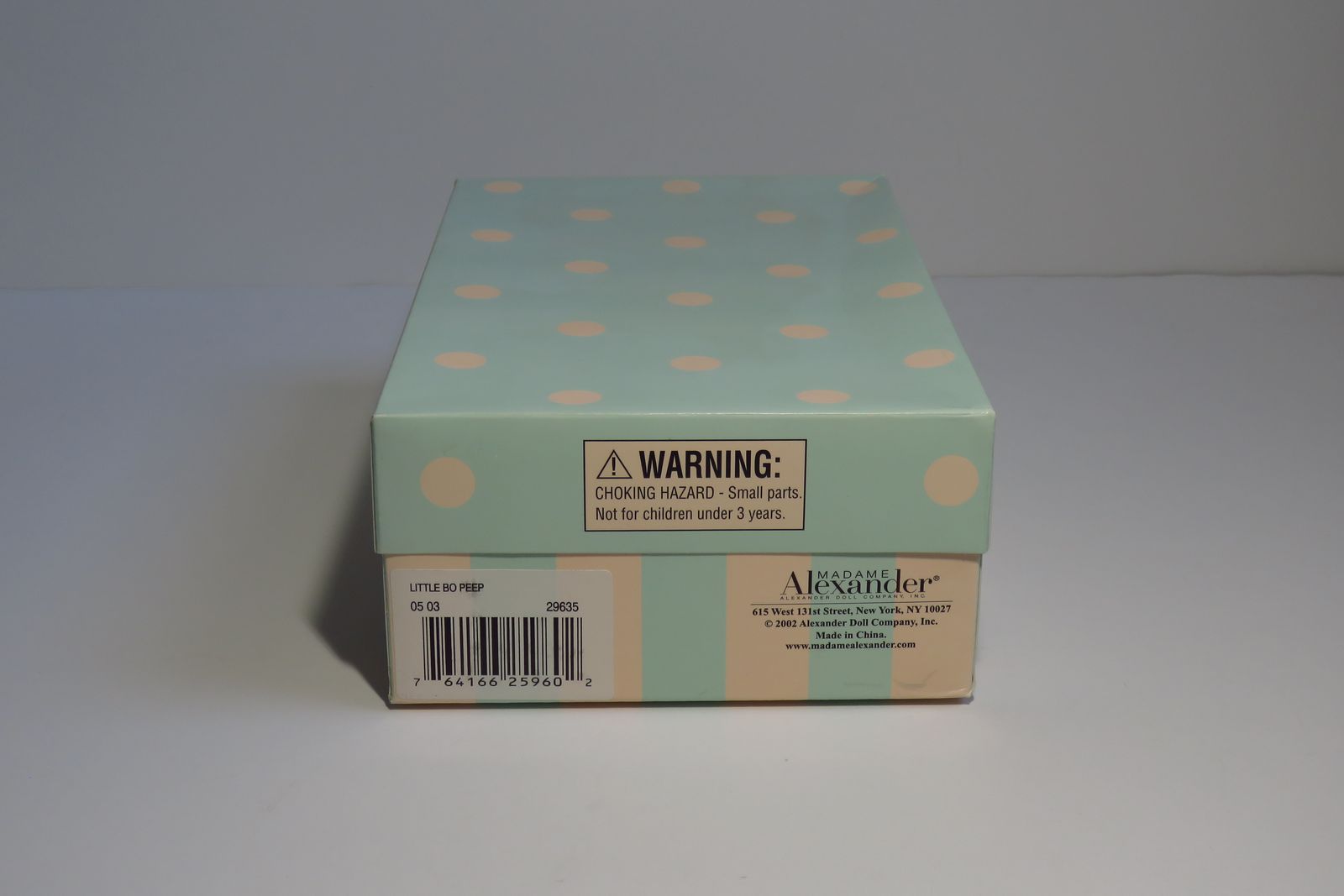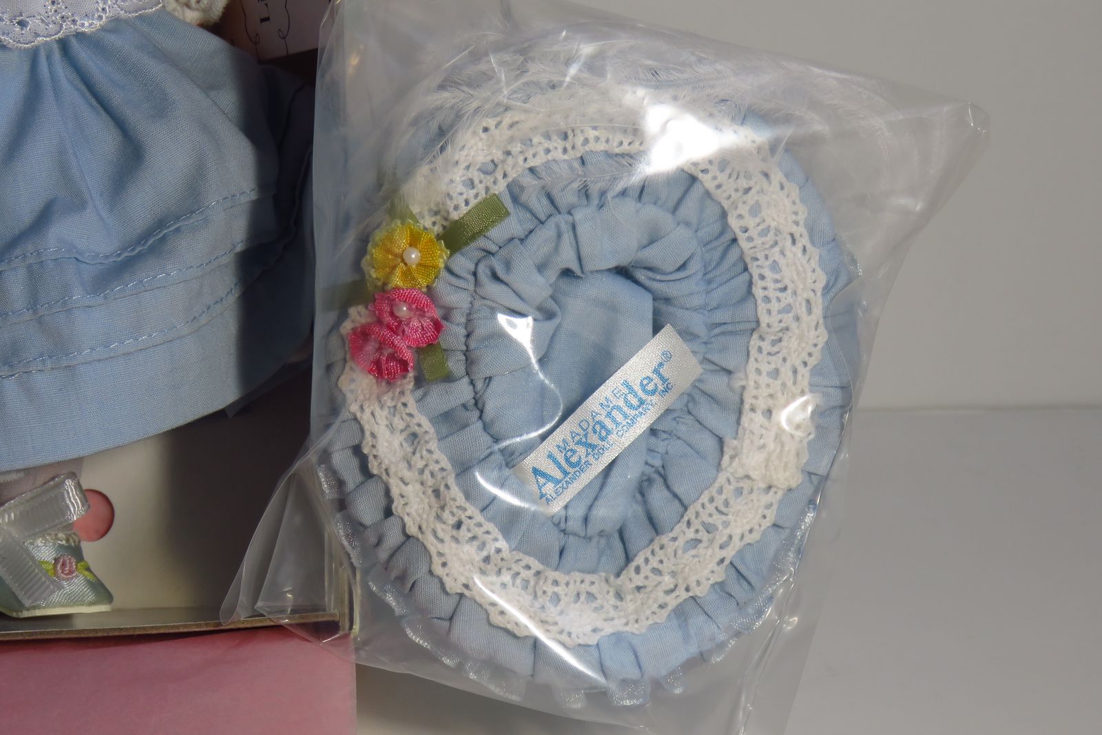 Pre-Owned. She was introduced in 2000 and her hang tag has a copyright date of 2002. This little cutie has blonde hair, and she has blue eyes that open and close freely. She is still wearing the hairnet to protect her hair. The white bodice of her dress is trimmed with pink and blue stitched flowers, white looped trim, and a wide white eyelet with stitched hearts. The dress has blue puff sleeves trimmed with small white eyelet and the skirt has three rows of tiny pintucking. Her white cotton slip has a wide band of elastic around the waist, and the bottom edge is trimmed with white eyelet. She is wearing white knit tights and blue satin slip on shoes with a pink flower and light green leaves on the toes of the shoes. Her blue hat is made of the same blue fabric as her dress. One side of the hat is trimmed with three little flowers that have a “pearl” bead center in each one and a little narrow green ribbon bow behind the flowers. The other side of the hat has two little flowers and a large white feather. The hat also has a gathered sheer blue ribbon around the outer edge. The hat is still in its plastic bag which is still stapled to the cardboard box liner. Her white staff with a big blue bow is also still in its plastic bag and is still stapled to the cardboard box liner. The box lid has a dent along one edge. Please see photos.