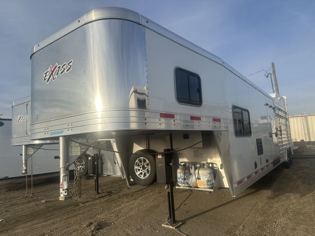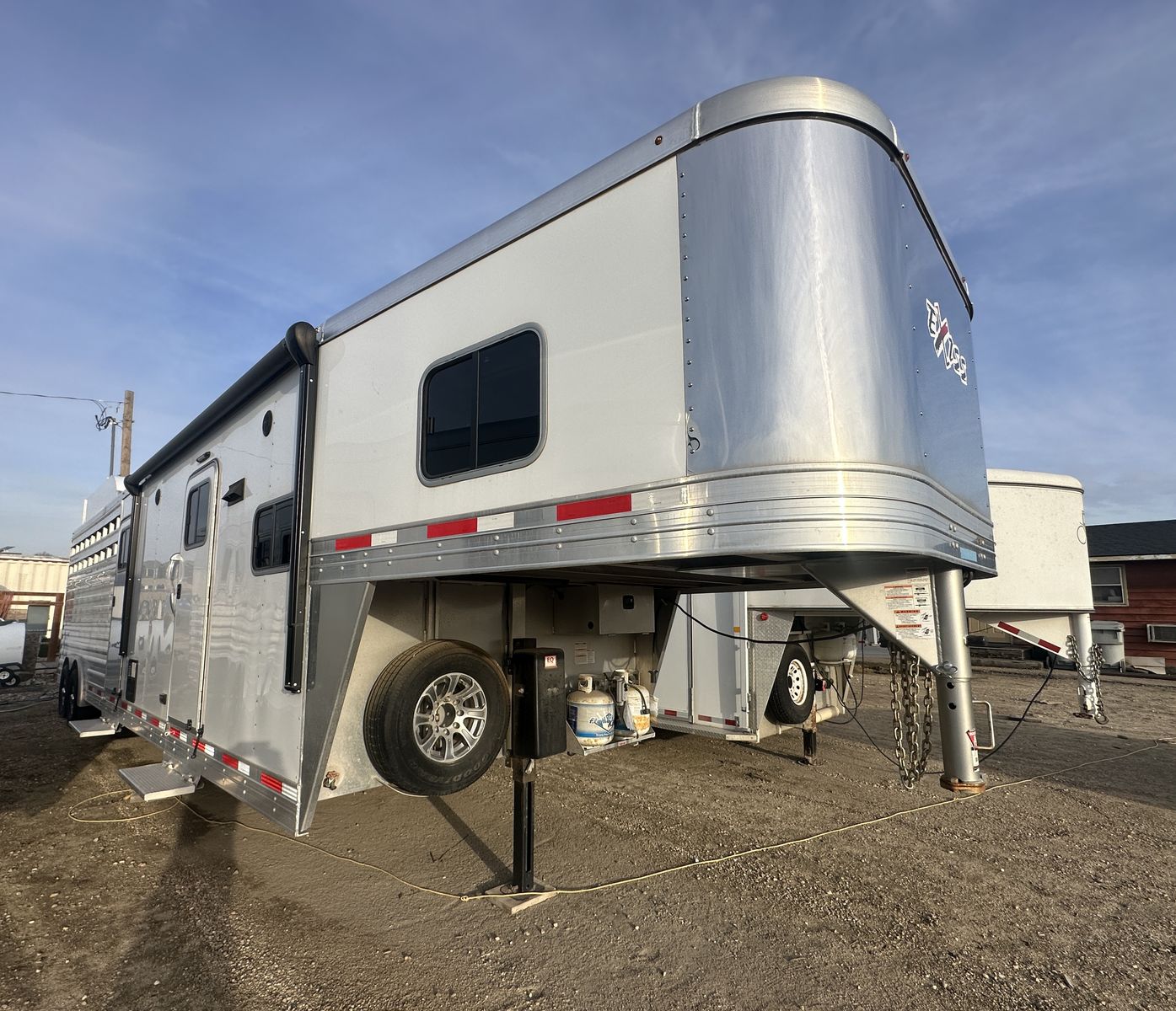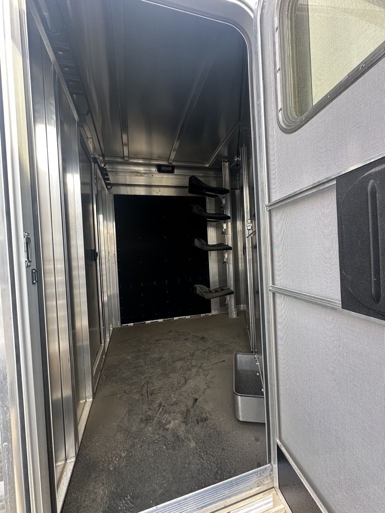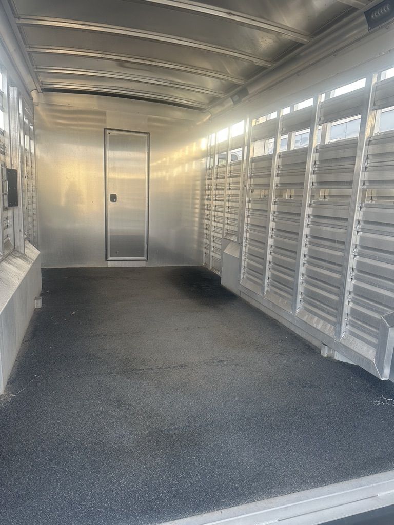 10'6" living quarters area, midtack with entry door passengers side and ramp on the drivers side, 14'6" stock area with 1 center gate, floor length is 32' plus the 7' gooseneck. Weighs 9200 lbs, 7'8" tall, 8' wide