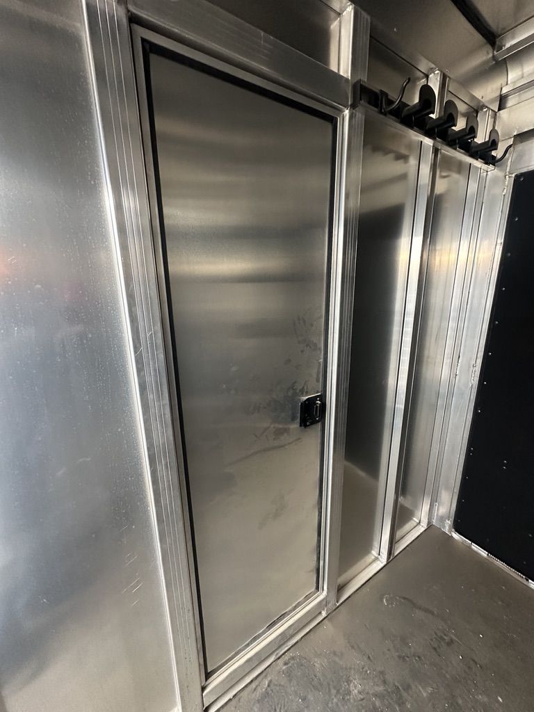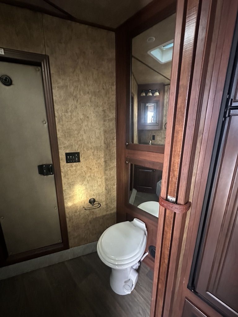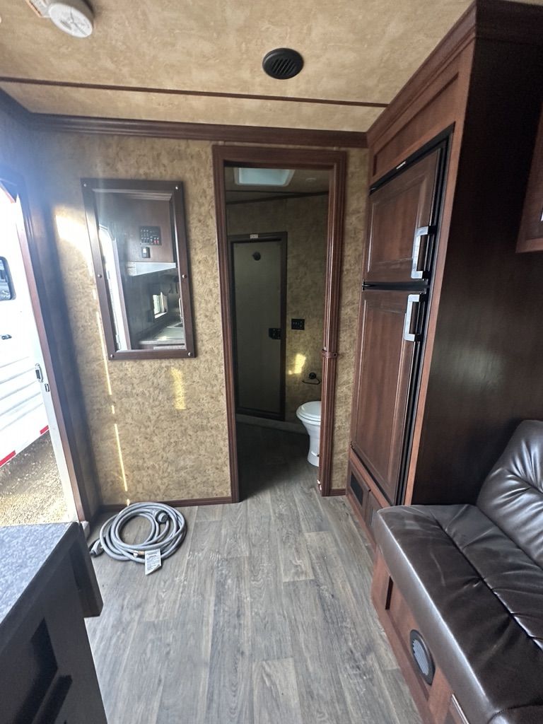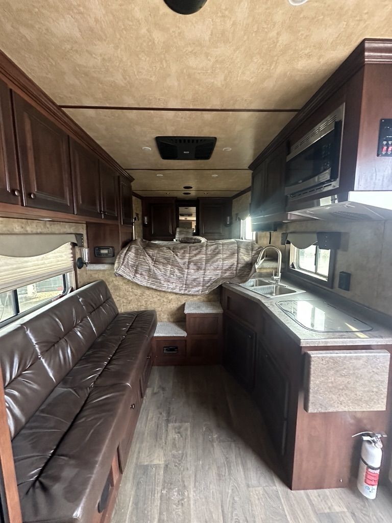10'6" living quarters area, midtack with entry door passengers side and ramp on the drivers side, 14'6" stock area with 1 center gate, floor length is 32' plus the 7' gooseneck. Weighs 9200 lbs, 7'8" tall, 8' wide