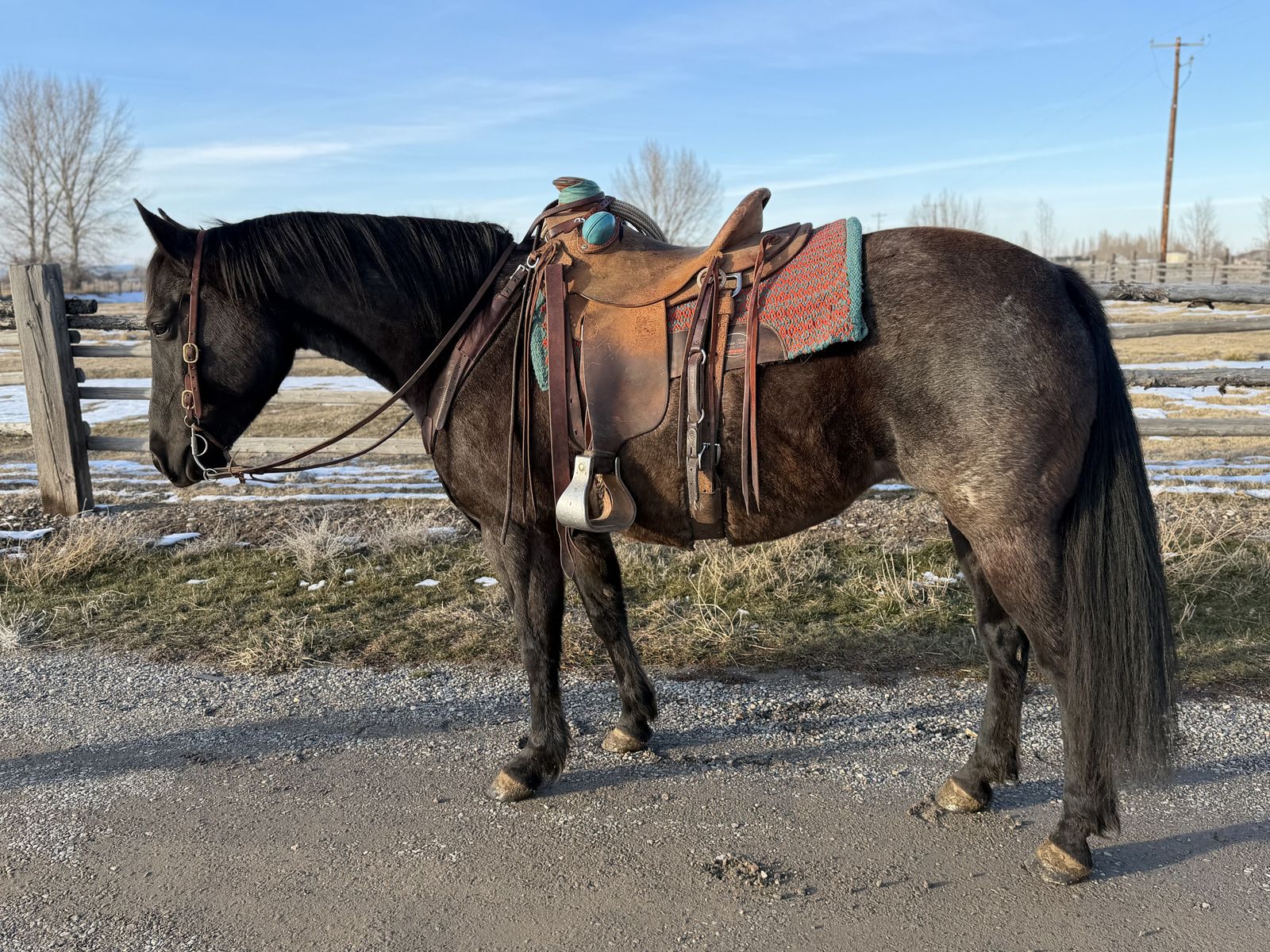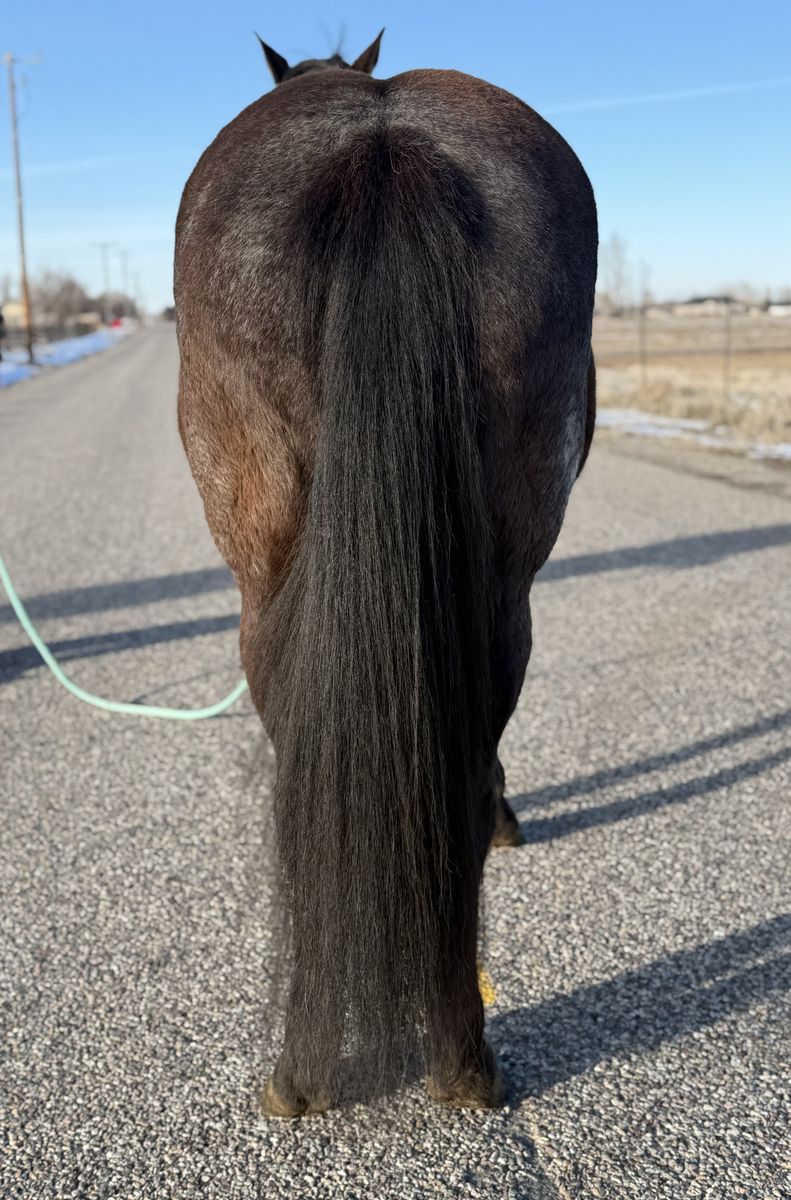 If you’re looking for a flashy blue roan mare that can go from the ranch to the mountains and then sit for a week and still be the same horse, Bandit checks all the boxes.