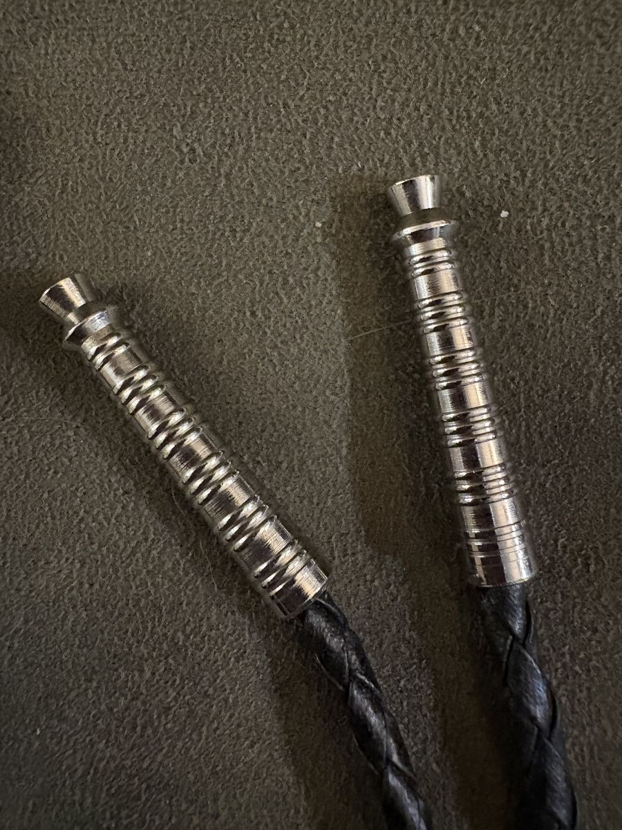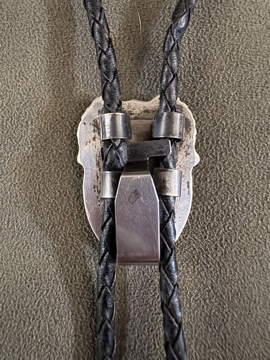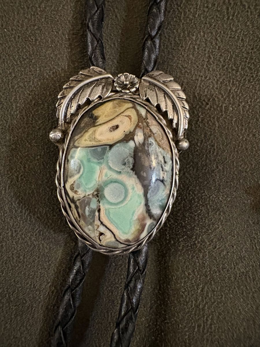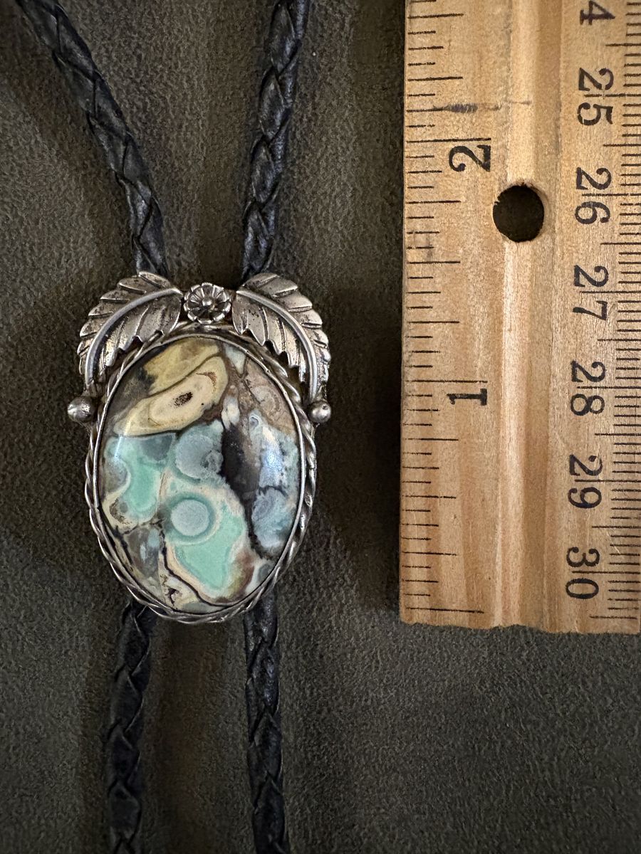 VenmoVintage Navajo Sterling Silver Bolo Tie - Royston Ribbon (Boulder) Turquoise - Unsigned Old Pawn Sawtooth Bezel, Leaf Appliqué, Royston Mine, Nevada, Braided Leather Cord, and Hand-Stamped Silver Tips.