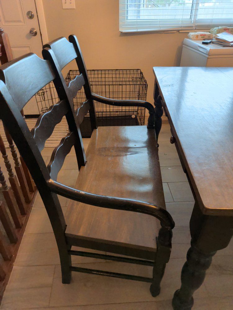 Selling my kitchen table with two chairs and a bench. Also have a leaf extender. One of the handles on the bench has come loose.