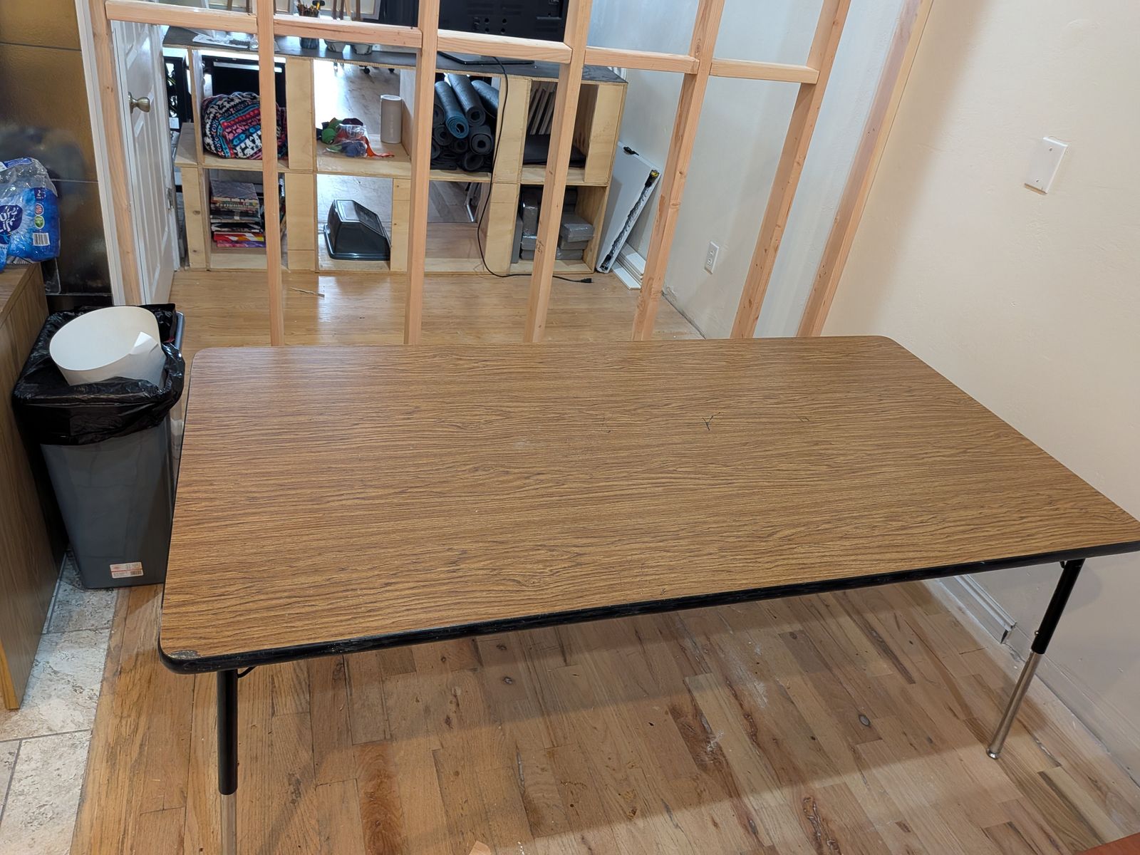 The table has a durable woodgrain top with metal legs and is very stable. Simple, functional design that works well for projects, storage, or even a small desk.