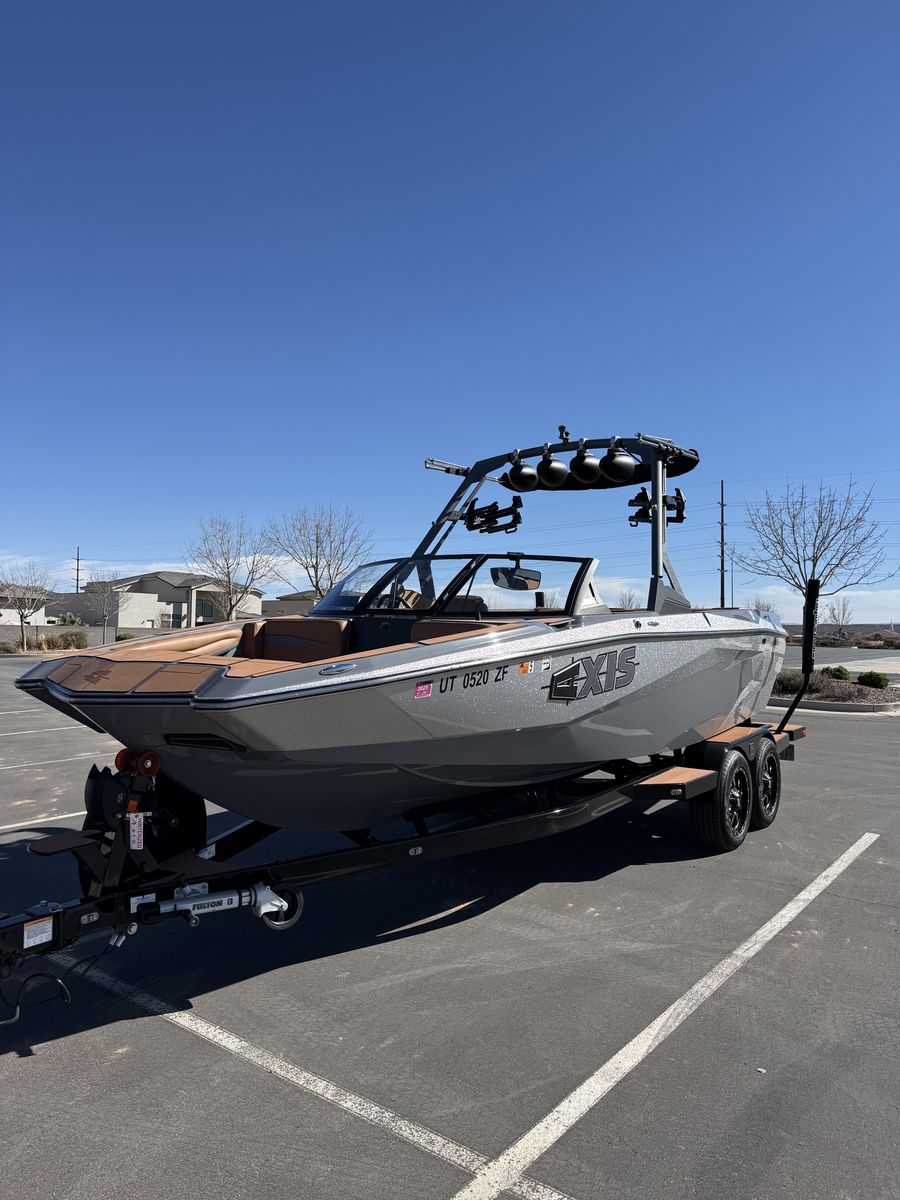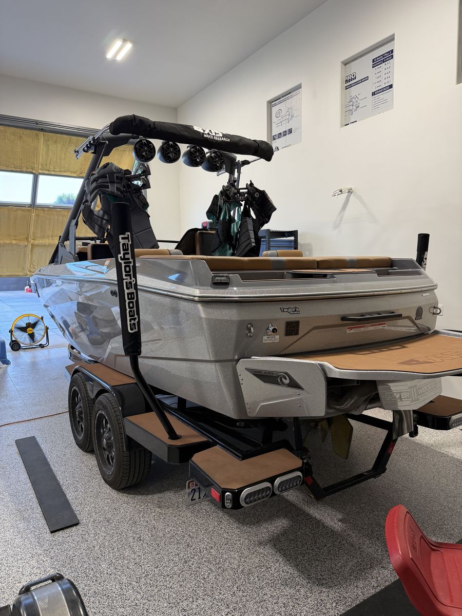 Loaded. See pictures for build sheet breakdown. Huge dual cover bimini w/ surf board storage and rope storage. Super easy to put up/take down. Upgraded stereo soundpack 2 with two extra tower speakers. Plug n play ballast bags in addition to hard tank factory ballasts. 2nd gorilla tracking fin. Surfband. Two additional bow pull up cleats. Wireless phone charger. Underseat and cabin lighting as well as underwater lights- choose your color/effect. Upgraded trailer with 18 wheels. Upgraded Skylon board racks - these hold everything tight while you cruise up the lake inlcuding foils. Malibu/Axis storage/travel cover inluded.