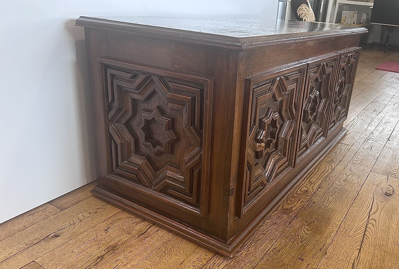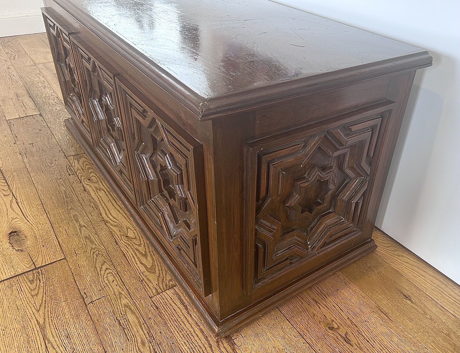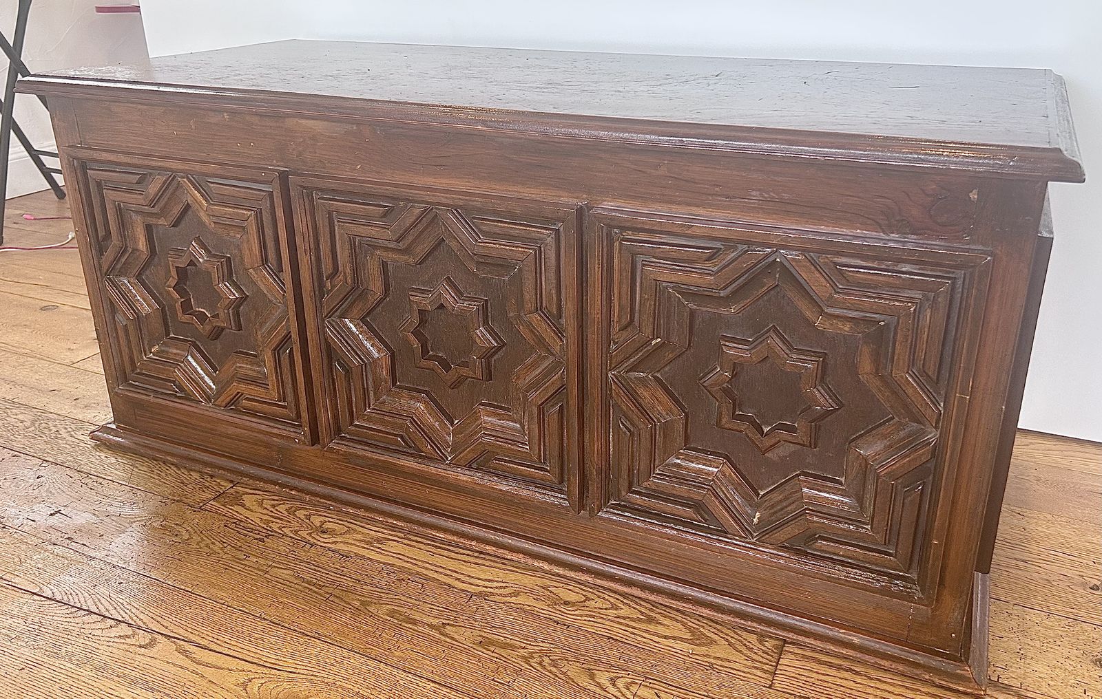 ZelleThe Mid Century Modern Chest is an antique piece of furniture with a modern style, featuring a rectangular shape and a walnut finish. Handmade in the United States in the 1920-1949 time period, this chest is crafted from wood and walnut materials. It stands at 21 inches tall with an interior height of 18 inches, making it ideal for any room, bedroom, or living room. This free-standing chest has a hinge door mechanism and comes in a brown color, adding a unique touch to any space.