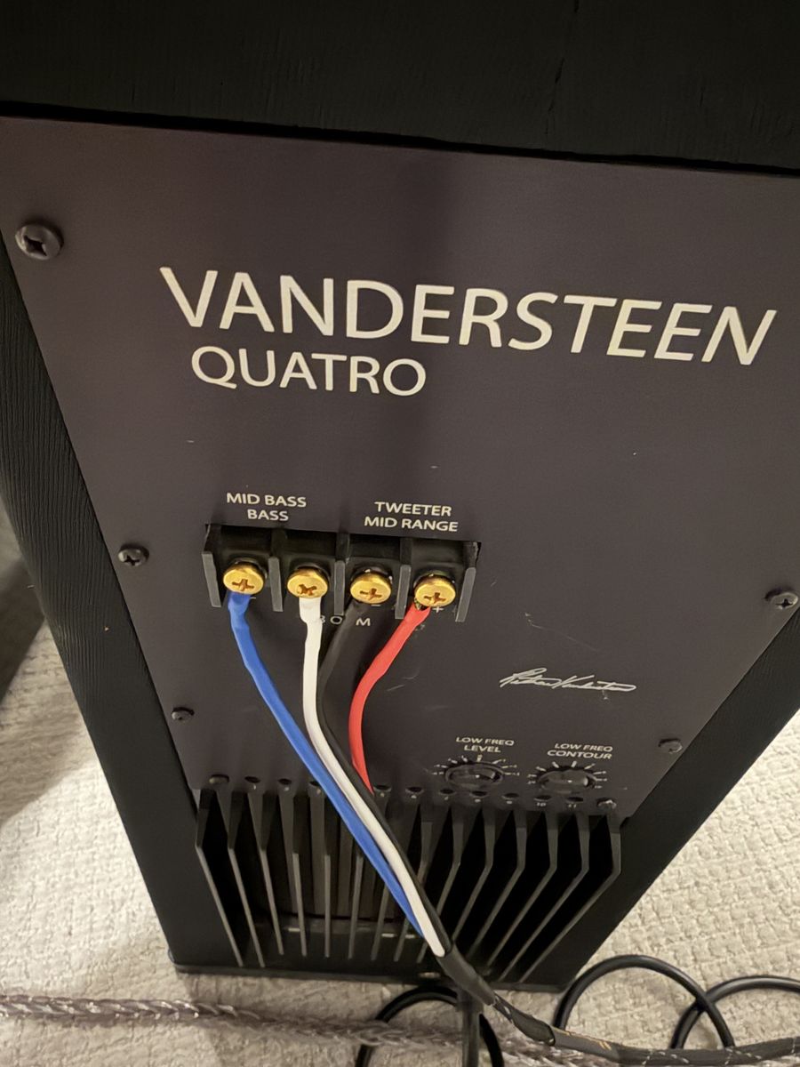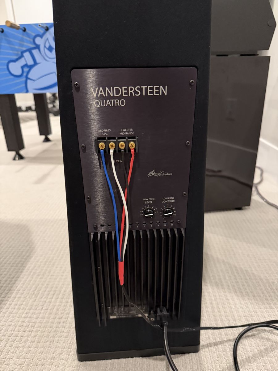 Driver Complement Tweeter: 1” dual-chamber, ceramic-coated aluminum-alloy dome with transmission-line loading. Midrange: 4.5” reflection-free, curvilinear mineral-filled polycone with an open-basket design. Mid-Woofer: 6.5” woven-fiber cone with a precision-formed magnet assembly. Subwoofers: Dual 8” long-throw, carbon-loaded cellulose cones. Integrated Subwoofer System Amplifier: Internal 250-watt Class B linear amplifier dedicated to the dual 8 subwoofers. Room Compensation: Features an 11-band analog equalizer to tune low-frequency response (20Hz–100Hz) to the specific room acoustics. Controls: Level and Contour (Q) adjustments to optimize bass density and interface. Operational Requirements Recommended Power: 40 to 200 Watts into 8 Ohms. High-Pass Filter: The Quatro requires a mandatory external in-line high-pass filter (such as the M5-HP) between your preamplifier and power amplifier. This filter rolls off the signal below 100Hz, allowing the main amplifier to drive only the mid-bass, midrange, and tweeter, while the internal amp handles the deep bass. INCLUDED with purchase are two M5-HP filters ($1,800 MSRP) Input Terminals: Screw-terminal barrier strips (up to 7/16 wide).