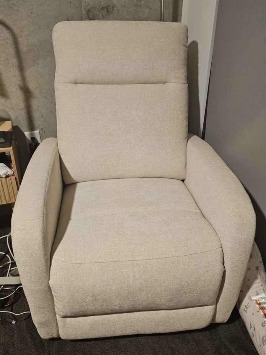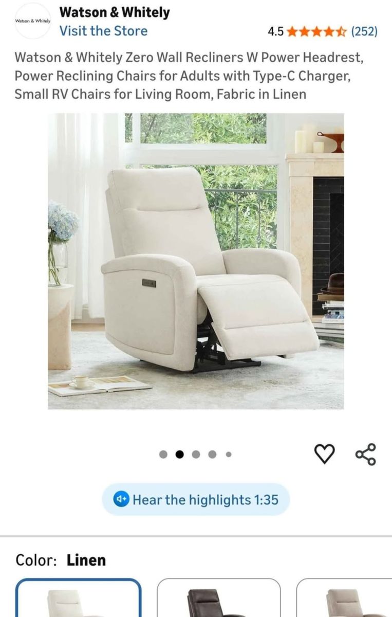 ZelleThis is brand new and unopened. I received two from Amazon and returning was too expensive. The first picture is the one I kept but the unopened one in the box is identical and the one I'm selling. It's a zero wall recliner so you can put it right up to the wall. I am selling for $450 or if you want me to drop off I can do that for $50. This was $700 plus tax and purchased two weeks ago. You can find it on Amazon by searching Watson and Whitney Zero Wall Recliner.