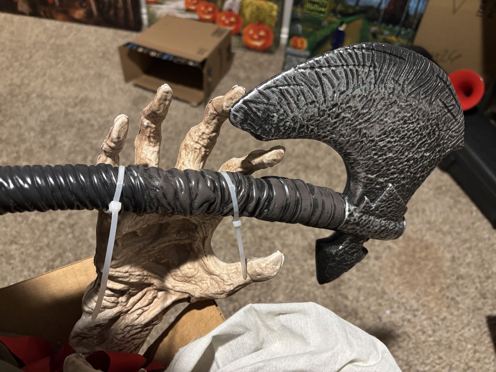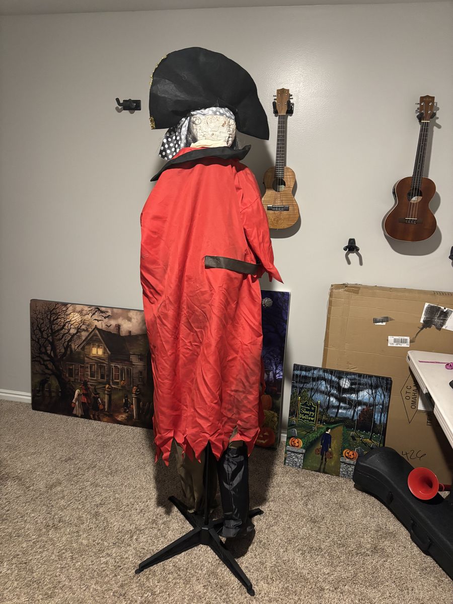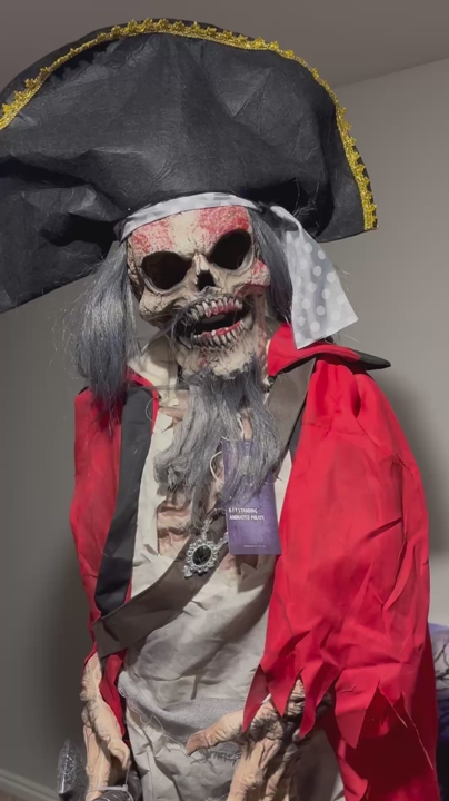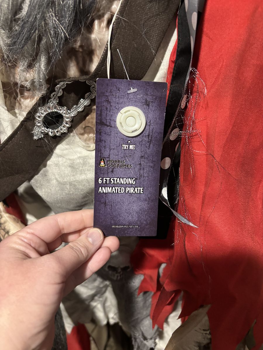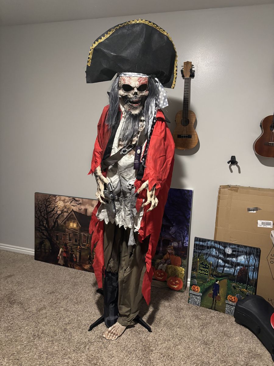 VenmoThis skeleton pirate stands 6ft tall. It has an on/off switch. Talks and shakes and lights up. Breaks down into a box.