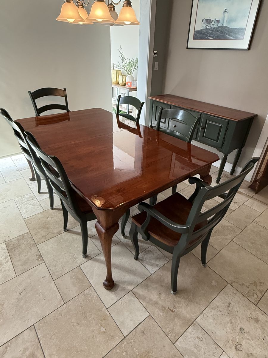 VenmoLexington solid wood dining table with 10 chairs and 2 removable leafs. Beautiful cherrywood with some signs of wear. Maintains great condition.