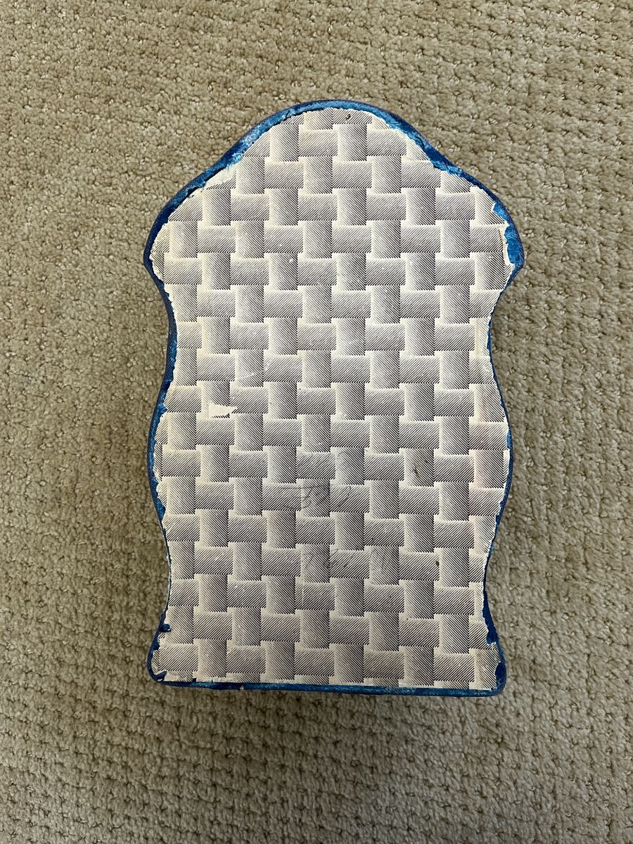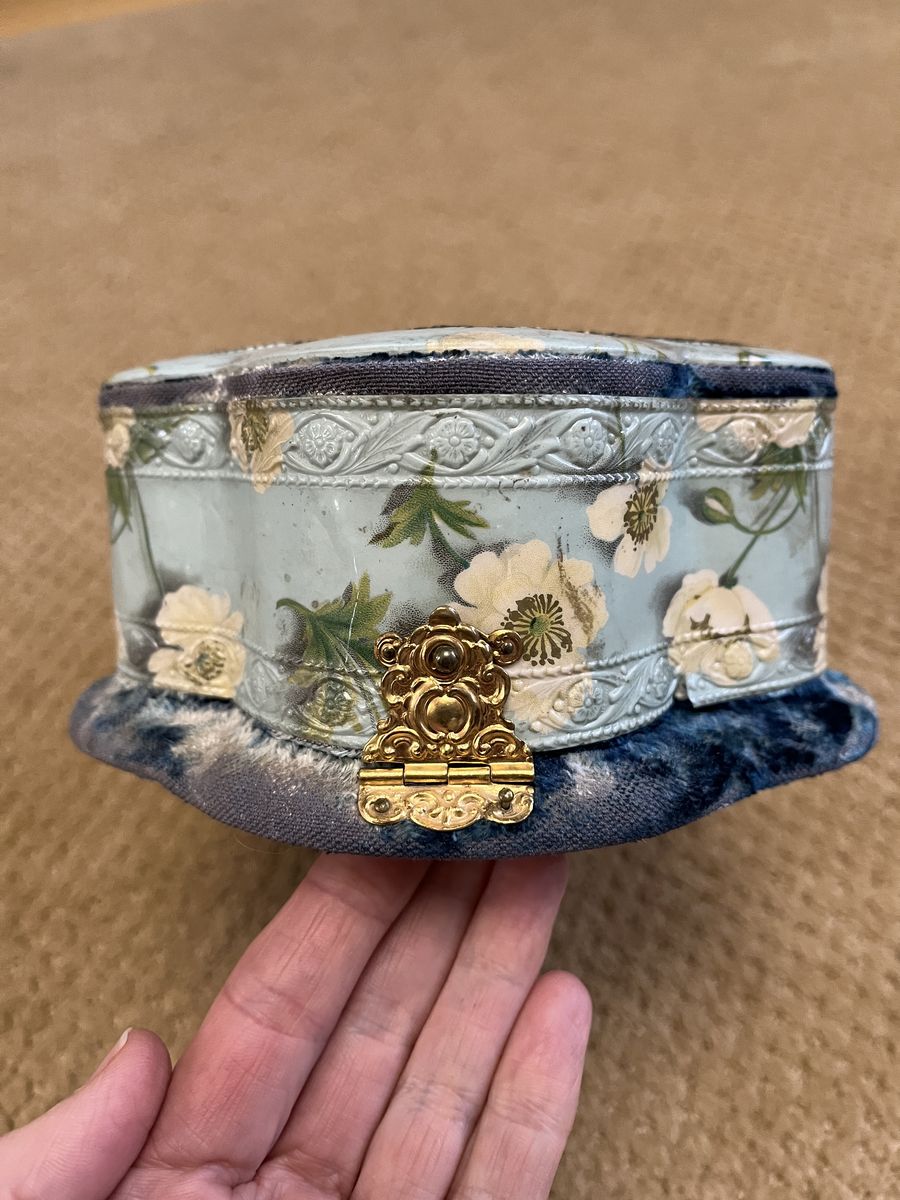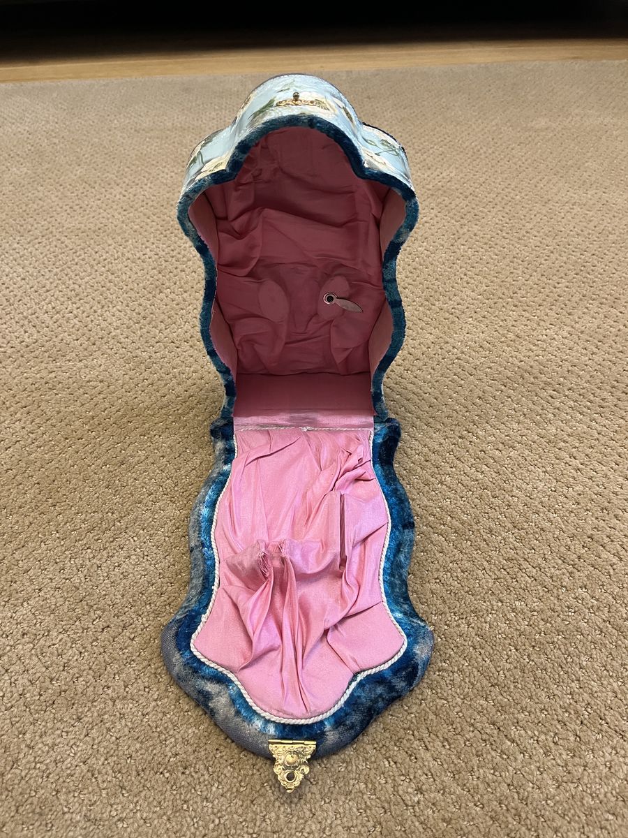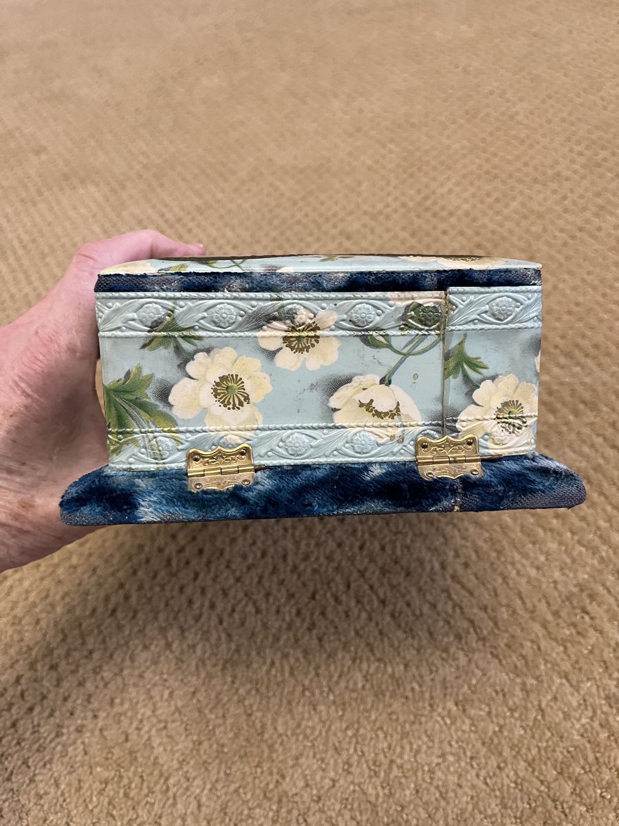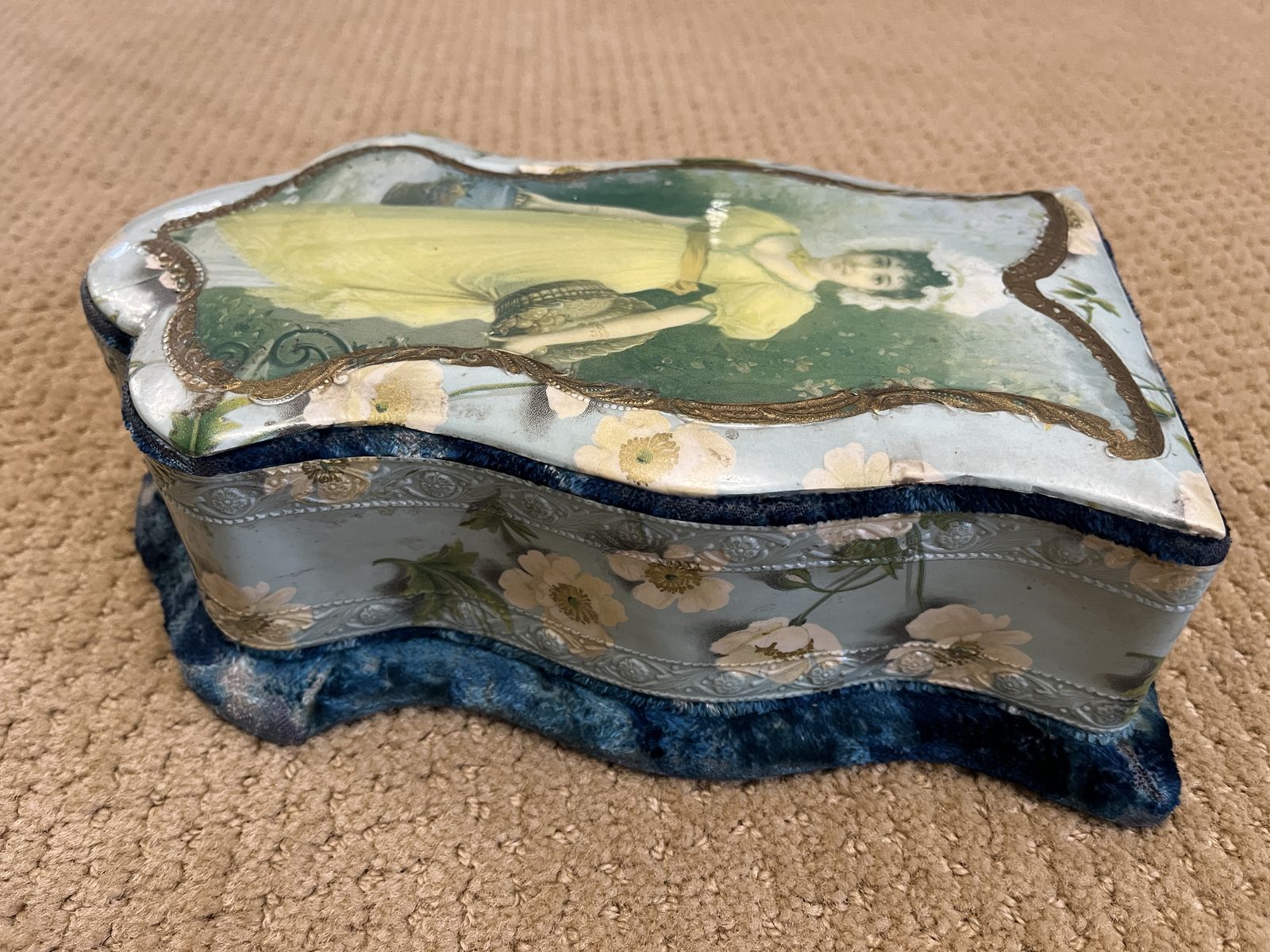 VenmoThis is a lovely and very old dresser box. This is really work of art. There is a beautiful young girl with a bonnet on the front carrying baskets. This has turquoise blue velvet, creamy white flowers with green foliage, and a light blue background. It has gold accents and decorative gold hinges. One large hinge on the front and two smaller ones on the back. This has embossed egdes for added beauty. The inside has a pink satin materail. It looks like at one time it might have held something, maybe a mirror. This measures 10 3/4 inches long x 7 inches wide x 3 1/4 inches tall. There is some wear which is to be expected with something of this age. A truely fancy and unique Victorian piece. Must see. Price is firm.