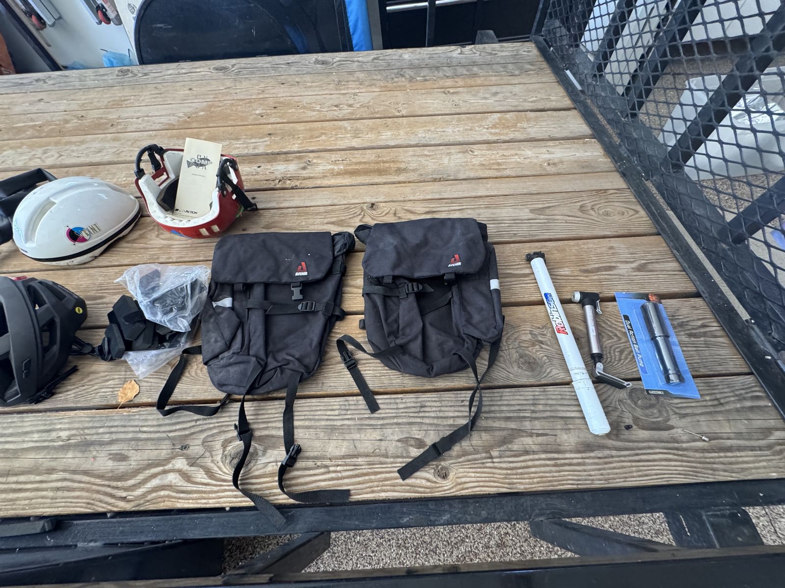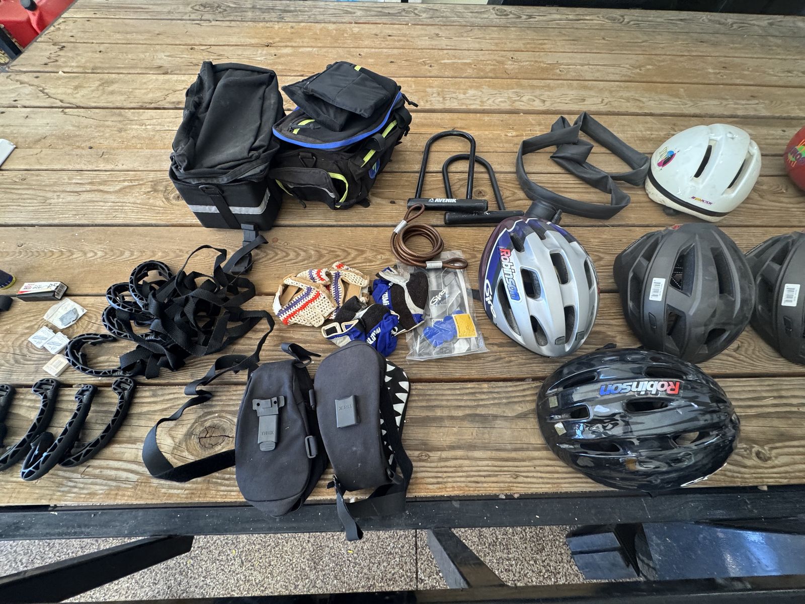 ZelleTwo excellent condition Trek steel frame bikes, model 970 and 950. New Shimano Diore shifts, brakes and cables. Luggage racks and panniers. Padded seats. Helmets. After market rok shocks. Two tire pumps, extra tire tubes. Goliath wall mounts for storage. Tools. Biking gloves.