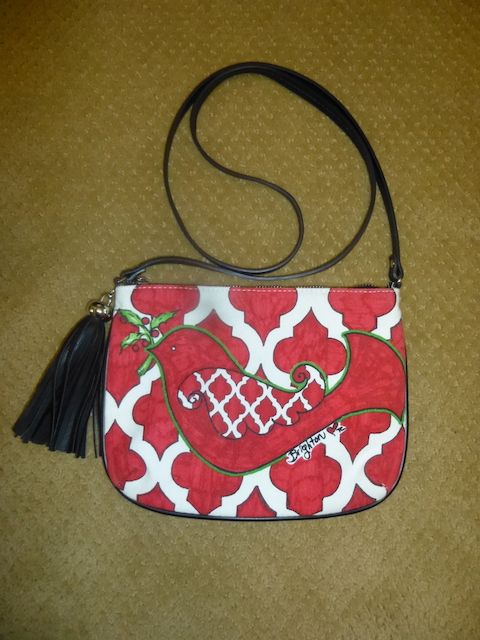 VenmoWhat a fun purse this is! It is in excellent condition. It is 10 inches across x 7 1/2 inches tall. Inside it is white with little black hearts. The pictures show the front is different than the back. The bird has a piece of holly in its mouth on the front. Price is firm.