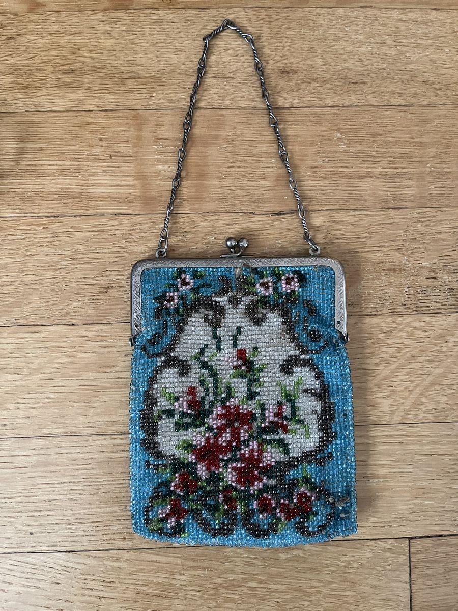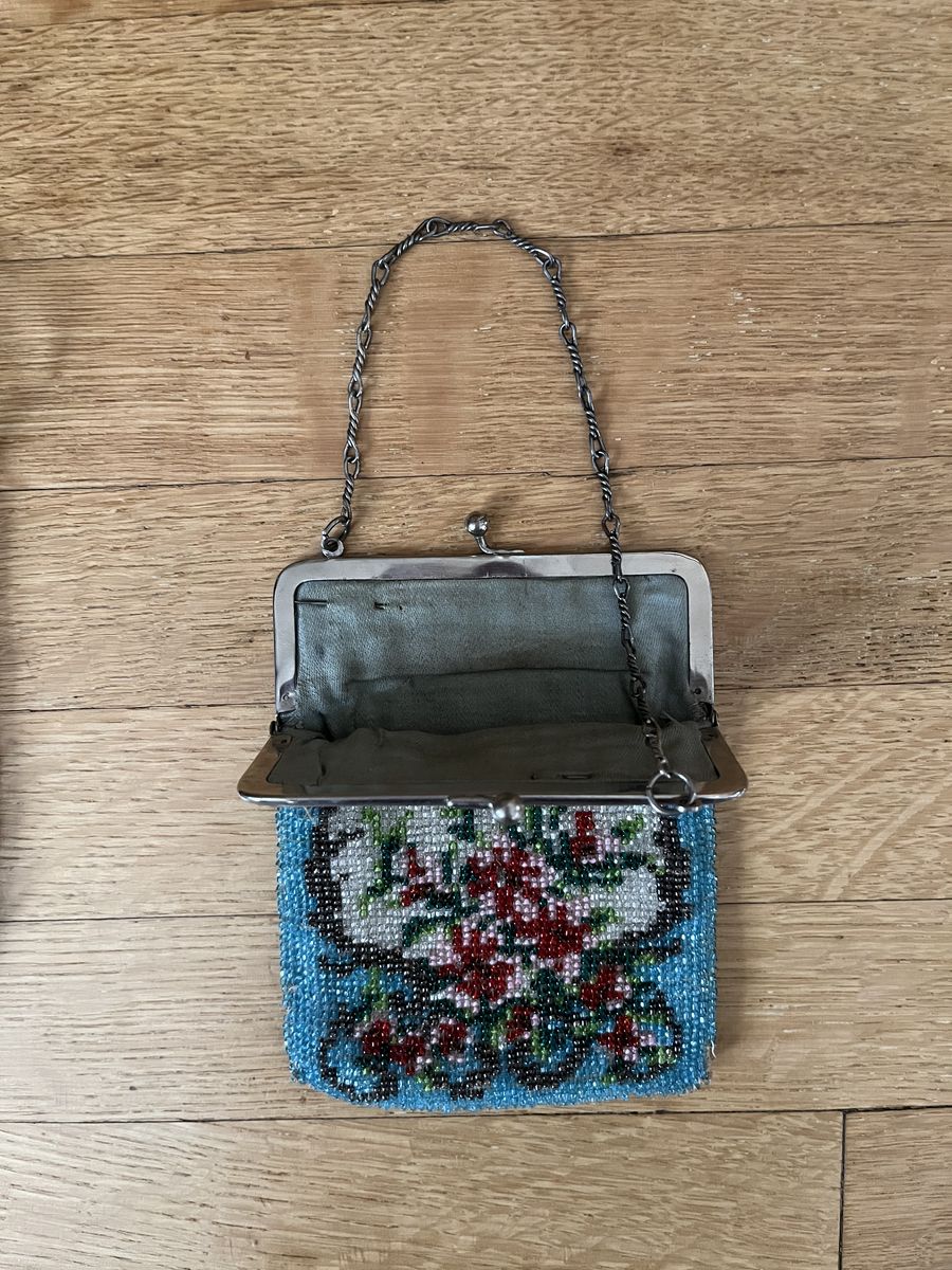 VenmoAll three purse are beautiful in different ways. The yellow/gold purse has a Bake Lite handle which has a hinge on it to open and close. The Bake Lite was popular in the 1920's-1930's. It also has the tiny micro beads on it. It has been used and has some wear. It is just over 9 inches tall x 4 1/8 wide. The black flapper bag has a drawstring top and normal size black, copper, and gold colored beads. This is 8 inches tall not counting the strings, and 4 inches wide. The blue beaded purse, I believe has a sterling top on it. The bead pattern is quite pretty on this. It is 4 inches across x 5 1/2 inches tall, not counting the chain. You choose the one you love. Price is 65.00 Each. Selling for a parent so the price is firm.