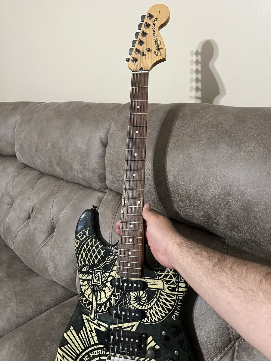 Custom Graphic Electric Guitar – Selling a sharp-looking electric guitar with a bold custom graphic finish. This guitar plays well and is perfect for beginners, intermediate players, or anyone wanting a unique stage-ready look. Details: Solid body electric guitar HSS pickup configuration (humbucker + two single coils) Tremolo bridge Volume & tone controls with 5-way selector switch Eye-catching custom artwork design Comfortable neck and smooth fretboard Great for rock, metal, blues, or practice at home. Overall good condition with normal light wear from use.