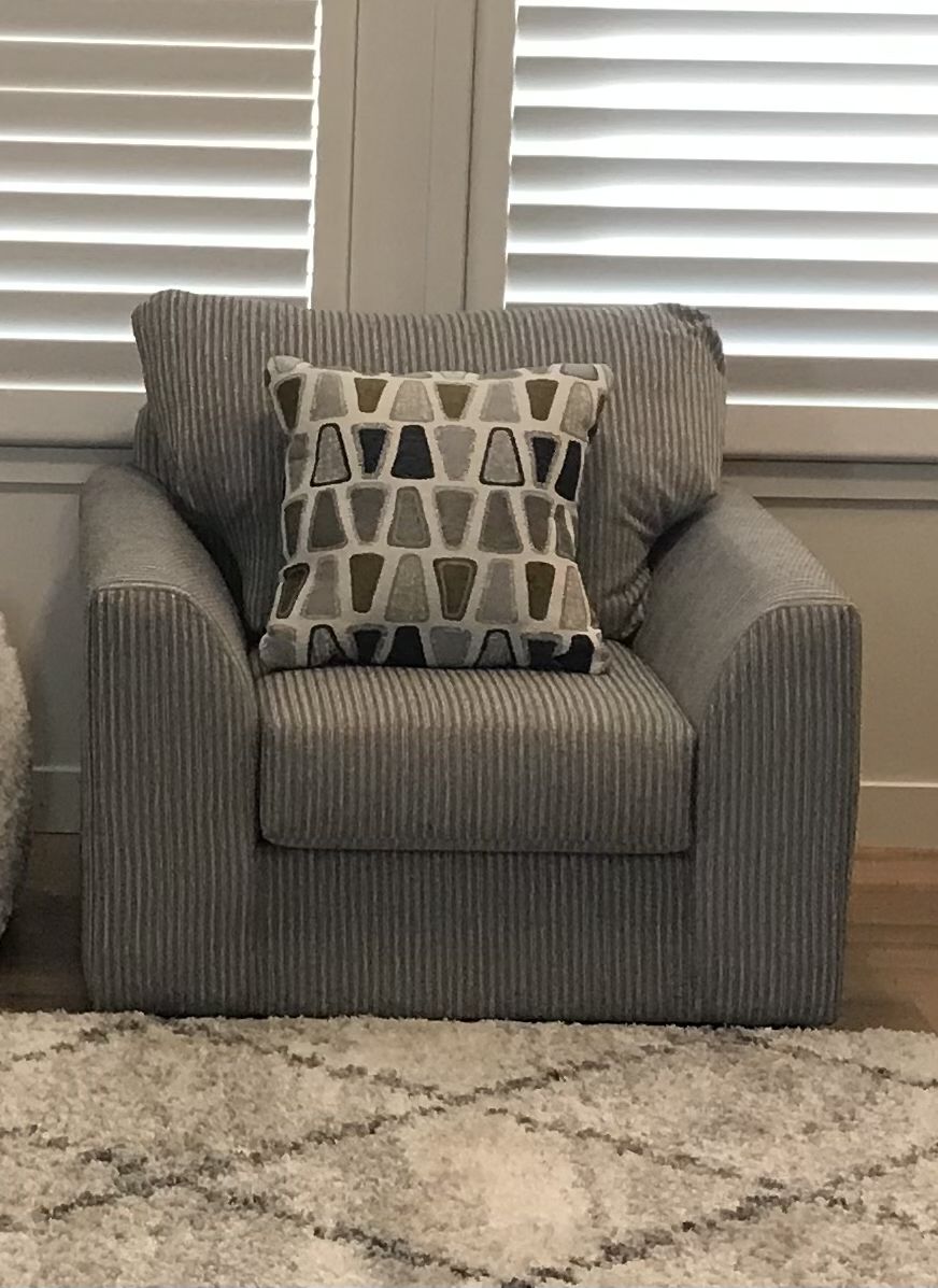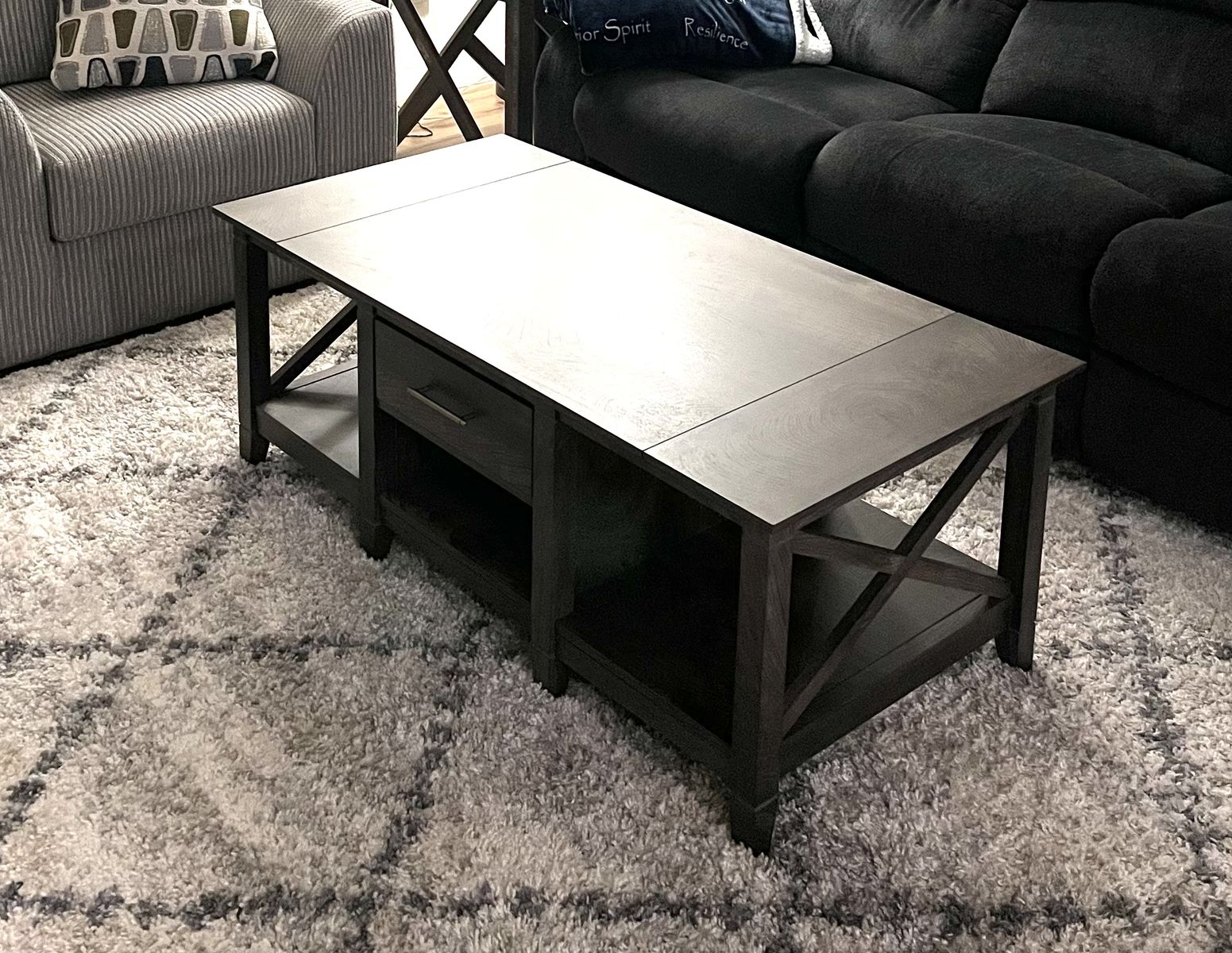 -Charcoal gray Coffee table with 2 drawers on each side: 47”x 24” x24” -Charcoal End table: 24”x24”x24” -Blue and gray chair: 40”x40”x24” -Hanging lamp