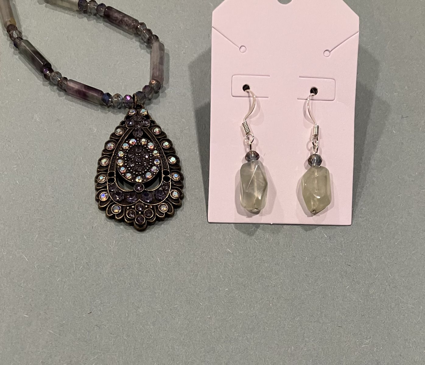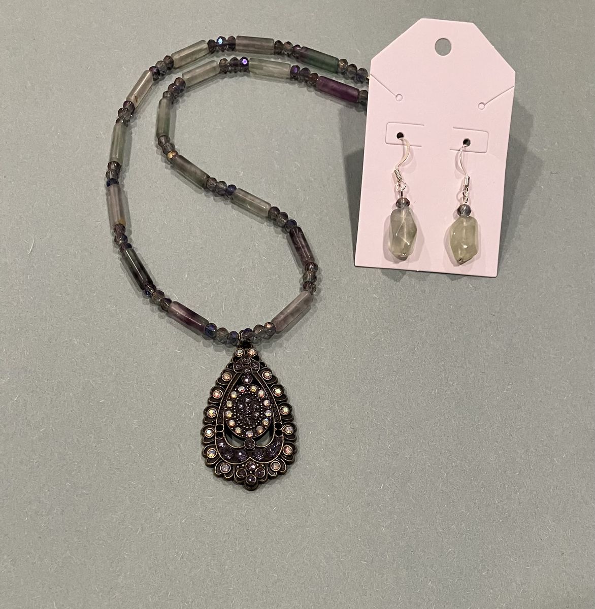 VenmoVintage style 17 inch long beaded necklace and matching earrings, all in shades of purple lilac and lime green colors. Beads are comprised of semi precious stone, glass and crystal beads. Beautiful 1.75 inch long brass pendant is made with purple and clear colored rhinestones. Ear wires are silver plated. Gift box included. Local meetup or can mail with ship fee.