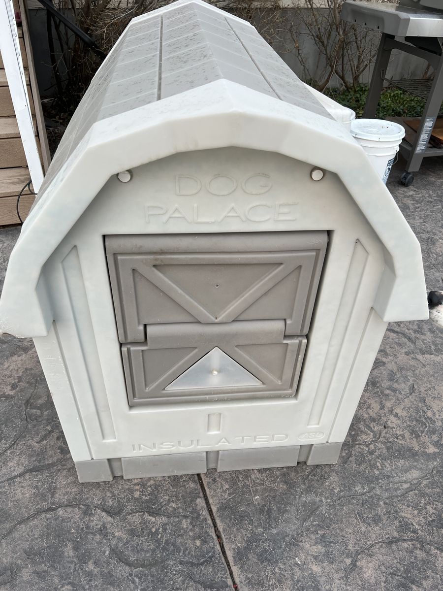 VenmoThis is a very large insulated dog house, brand name “Dog Palace”. It is very well-made and is very durable hard plastic. It has a door but our dog always preferred it without. Measurements are roughly 38” high, 28-30” wide, and 40” long.